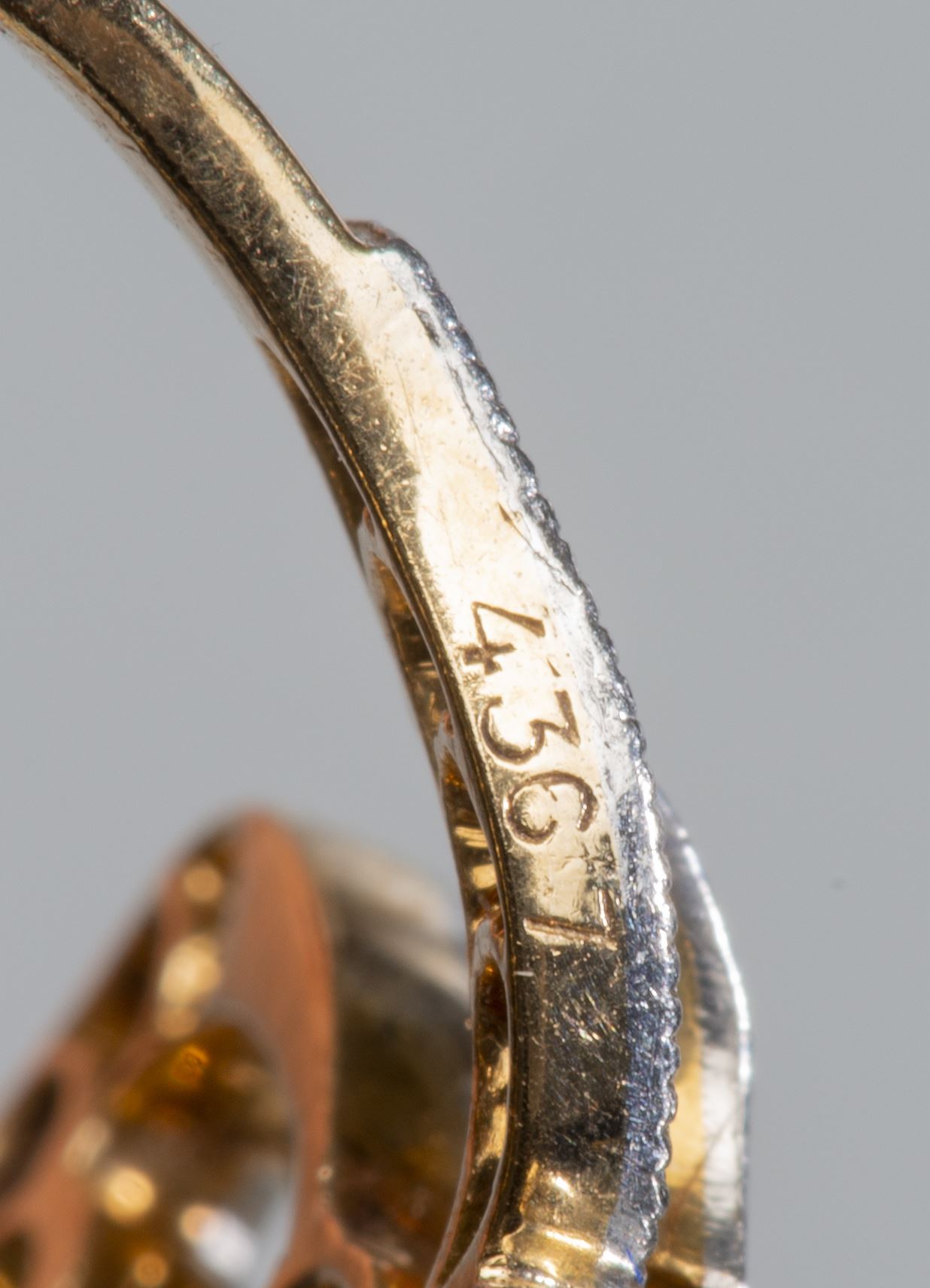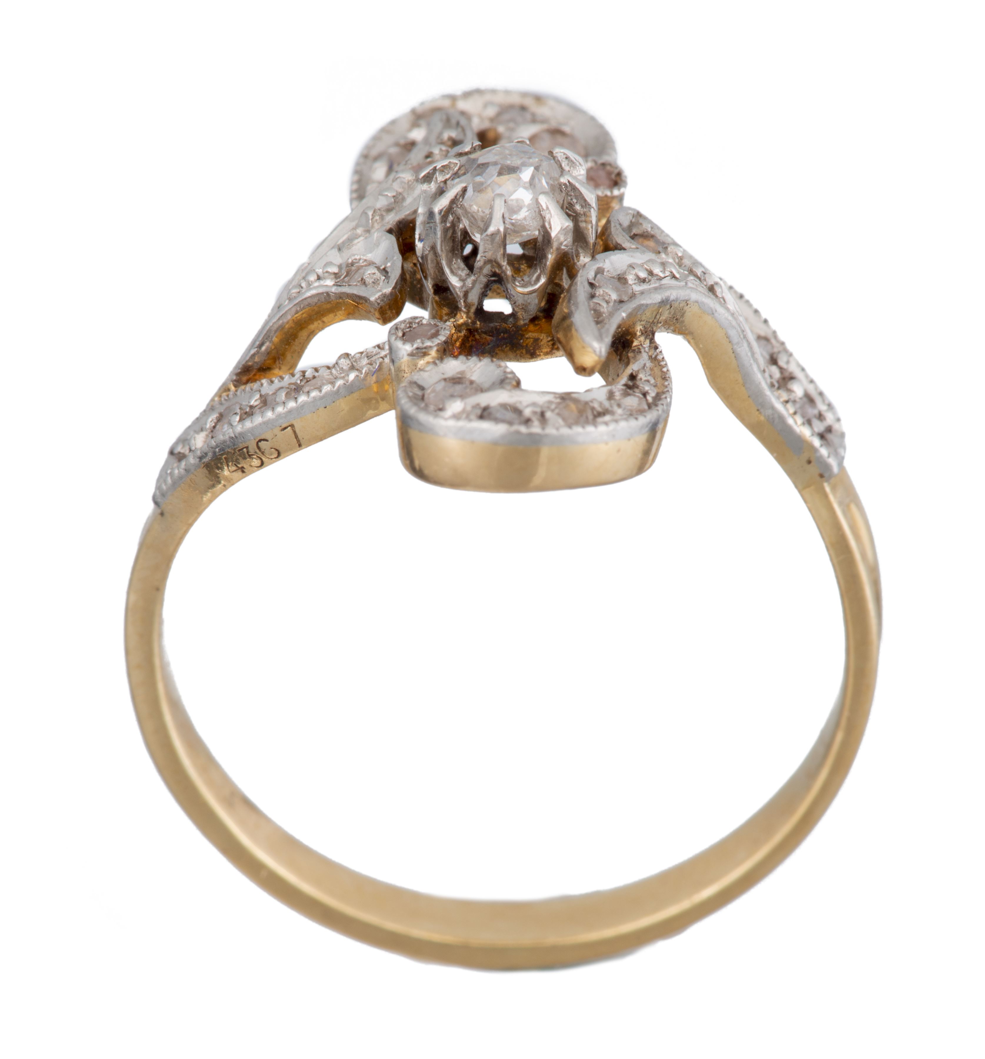 Bague géométrique Art nouveau en or jaune .750 sertie de 22 diamants de taille rose et un diamant central de 0.15 ct de taille ancienne.