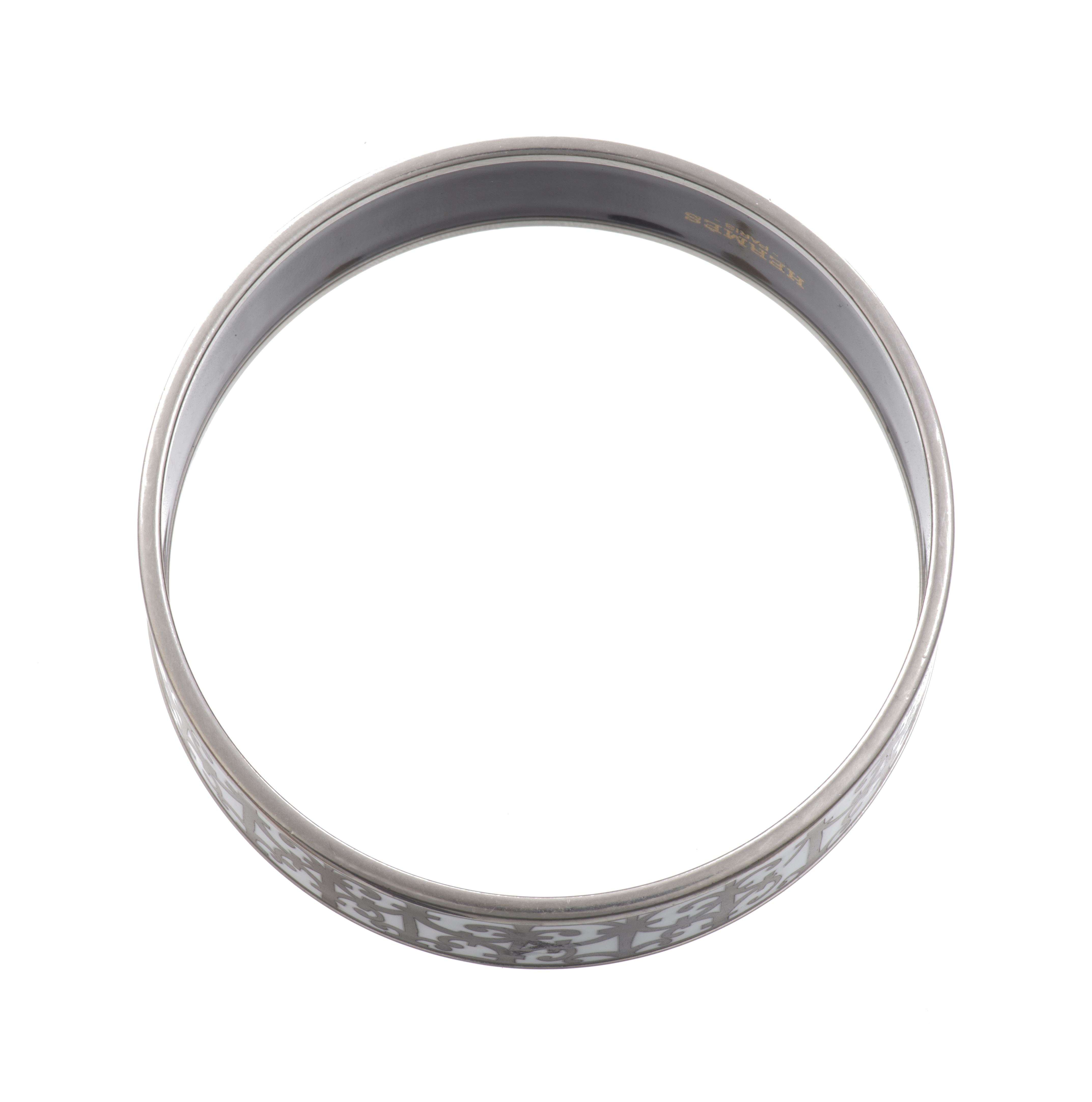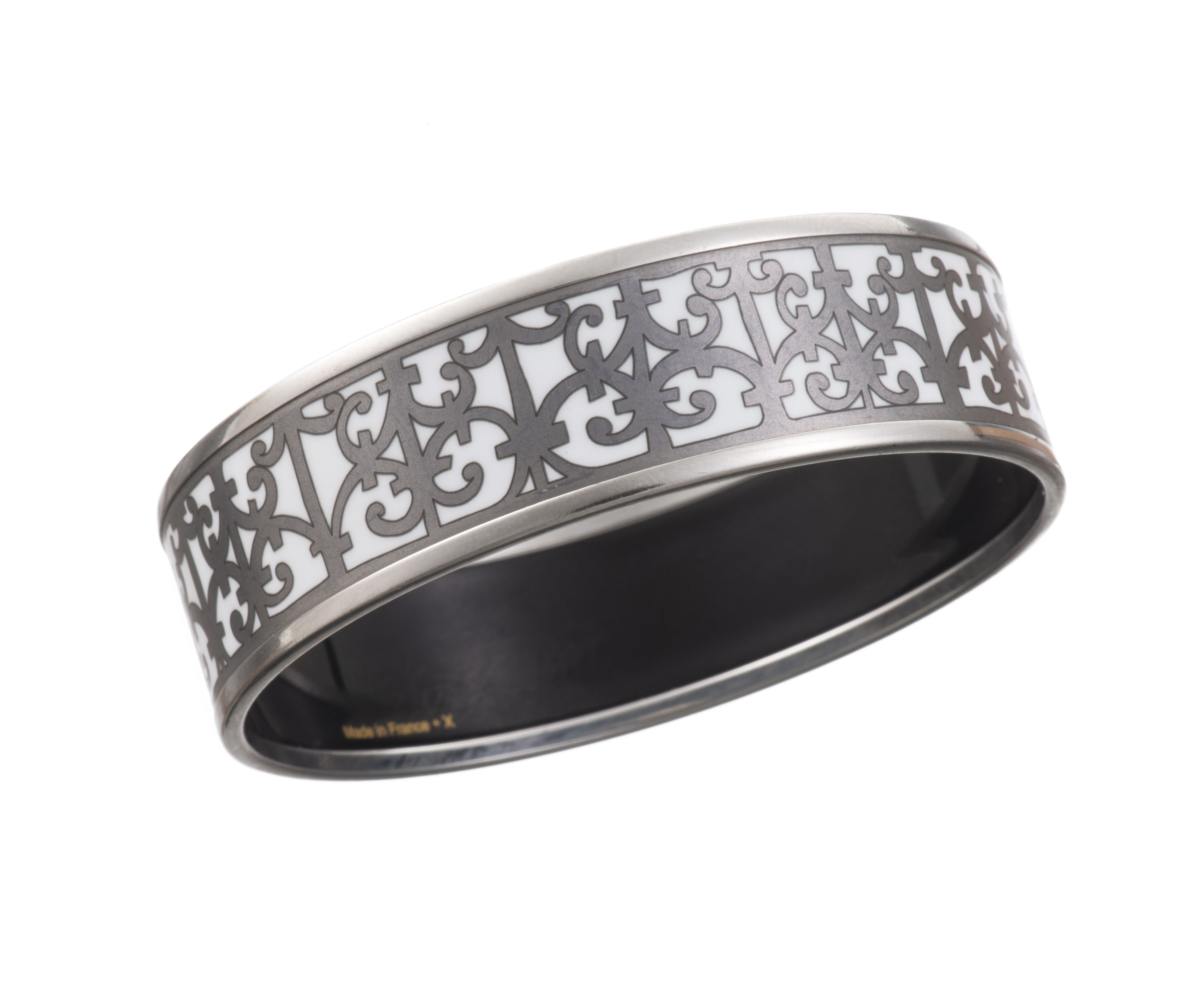 Hermès bracelet jonc émail "les balcons de Guadalquivir" en cerclage argent palladié motif gris et émail blanc, motif en X.