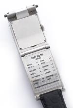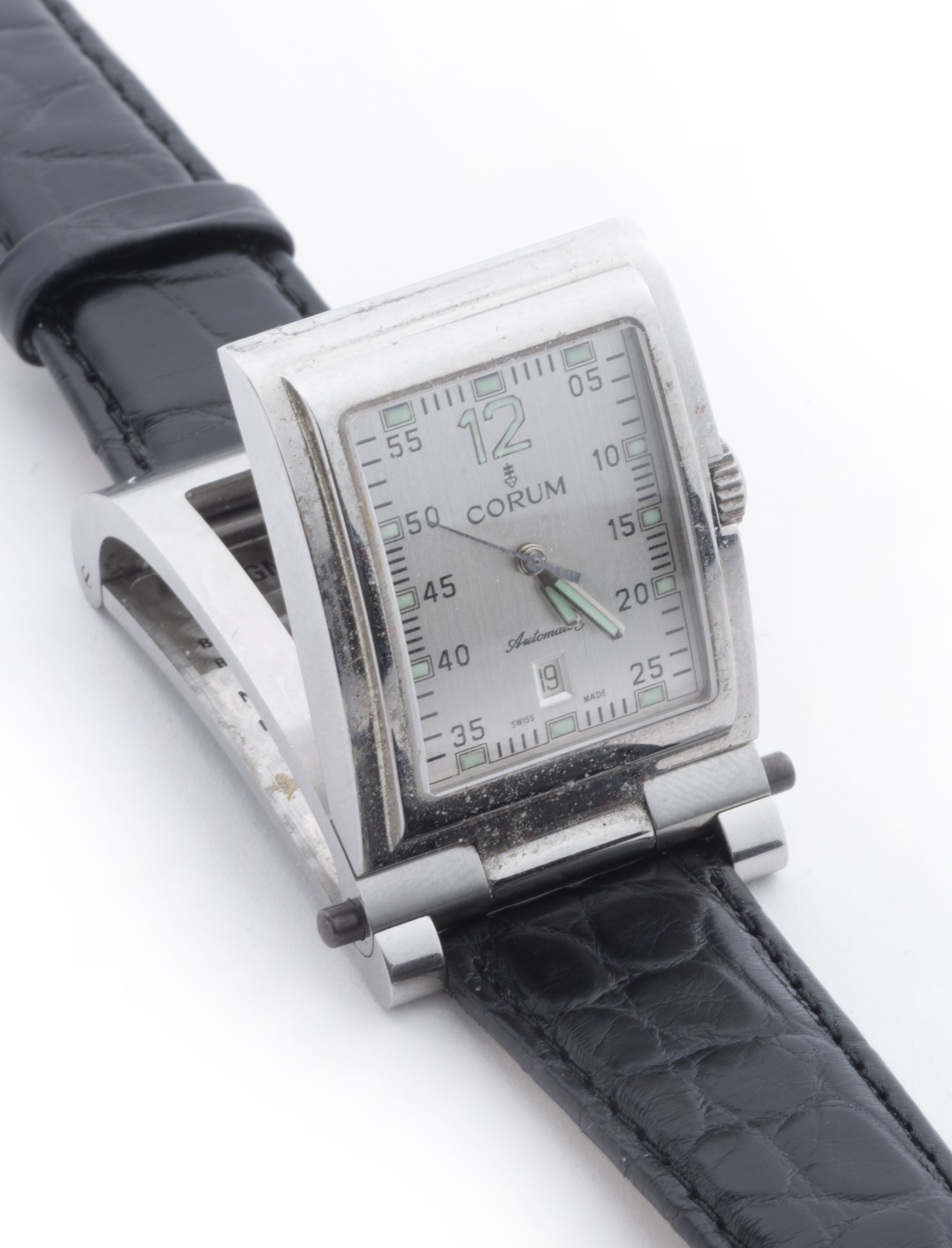 Corum, montre-bracelet, mvt automatique, modèle Toboggan, acier cadran rectangulaire signé, guichet de date à 6h, n°de boitier 14516120 616038.