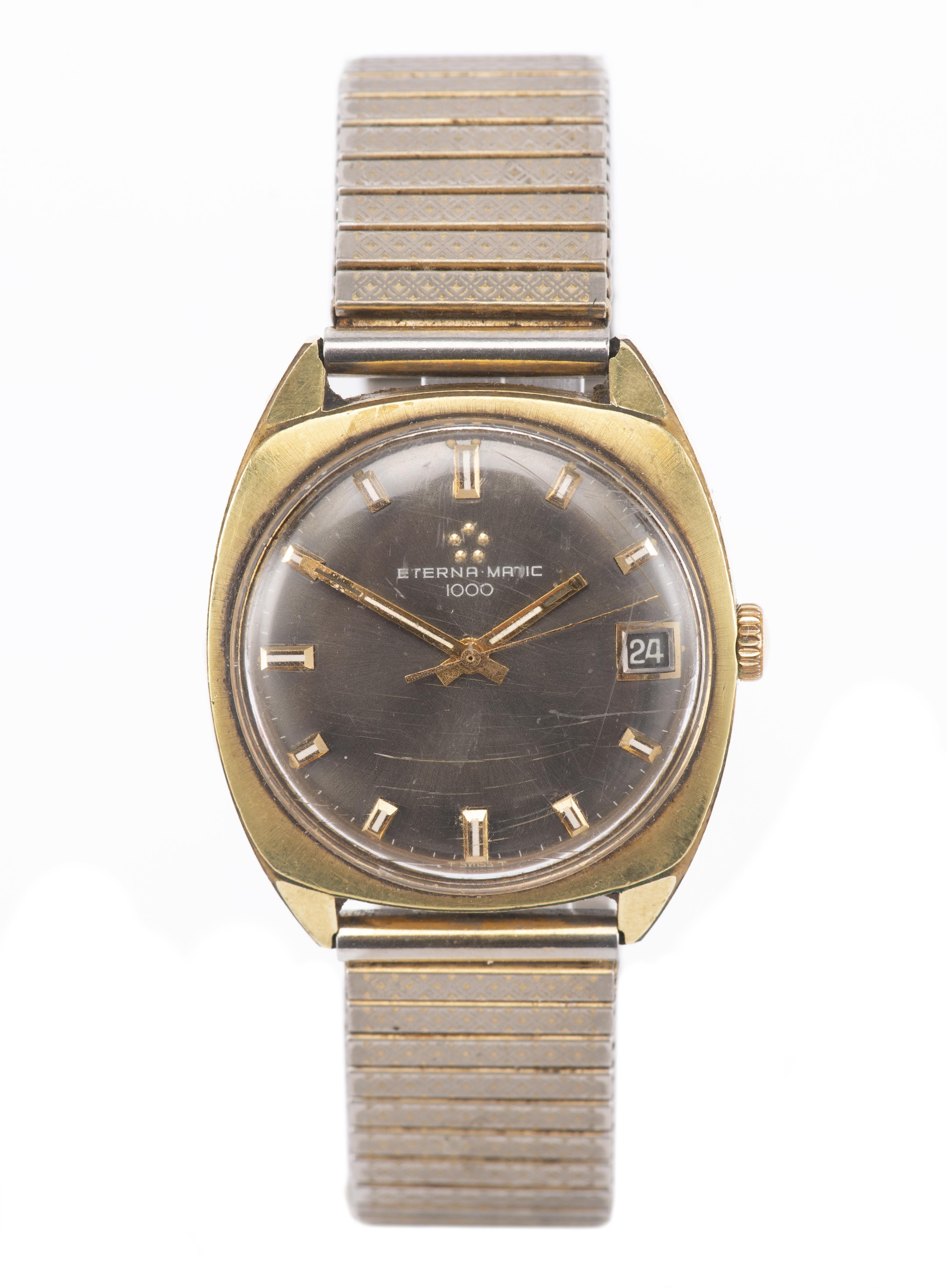 Eternamatic 1000 à cal. 1488k montre-bracelet homme en acier plaqué or 20μm à cadran argent noirci, guichet de date à 3h aiguille des secondes centrale, index bâton, vers 1960.