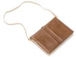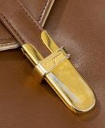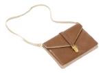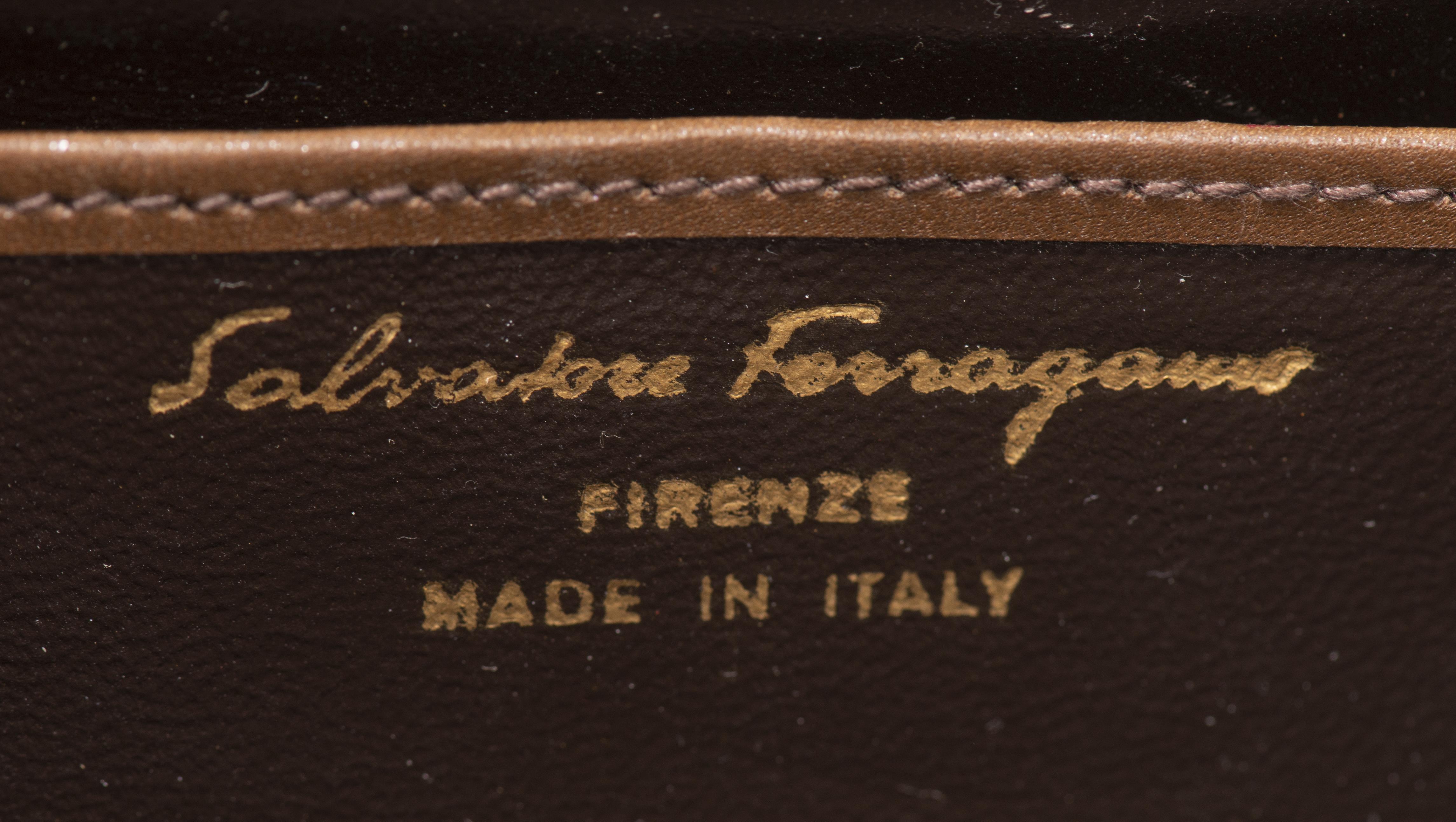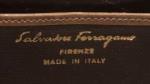 Sac de dame Salvatore Ferragamo Firenze en cuir brun et cuir beige se portant en pochette et comprenant une anse pour un port en bandoulière.