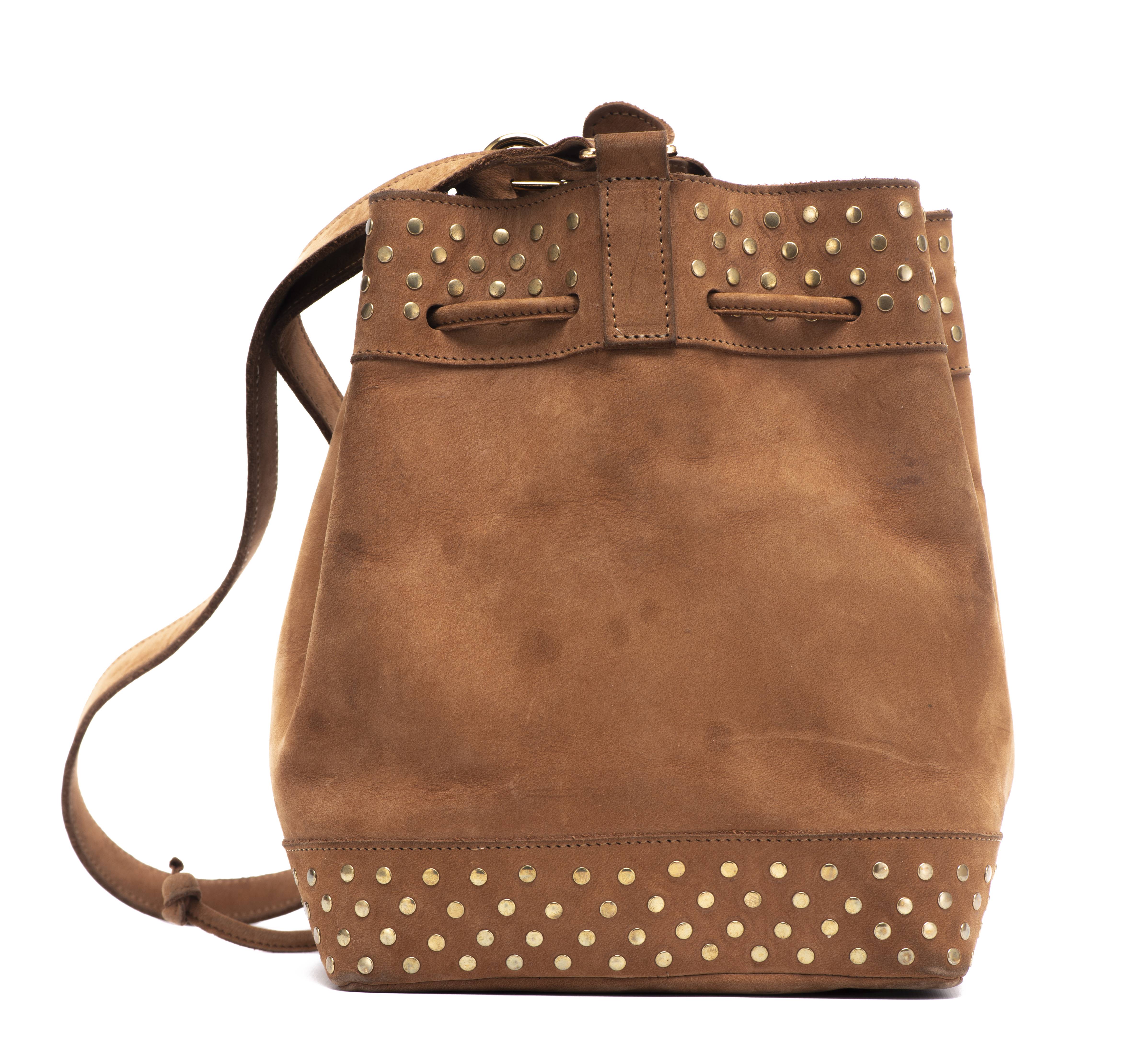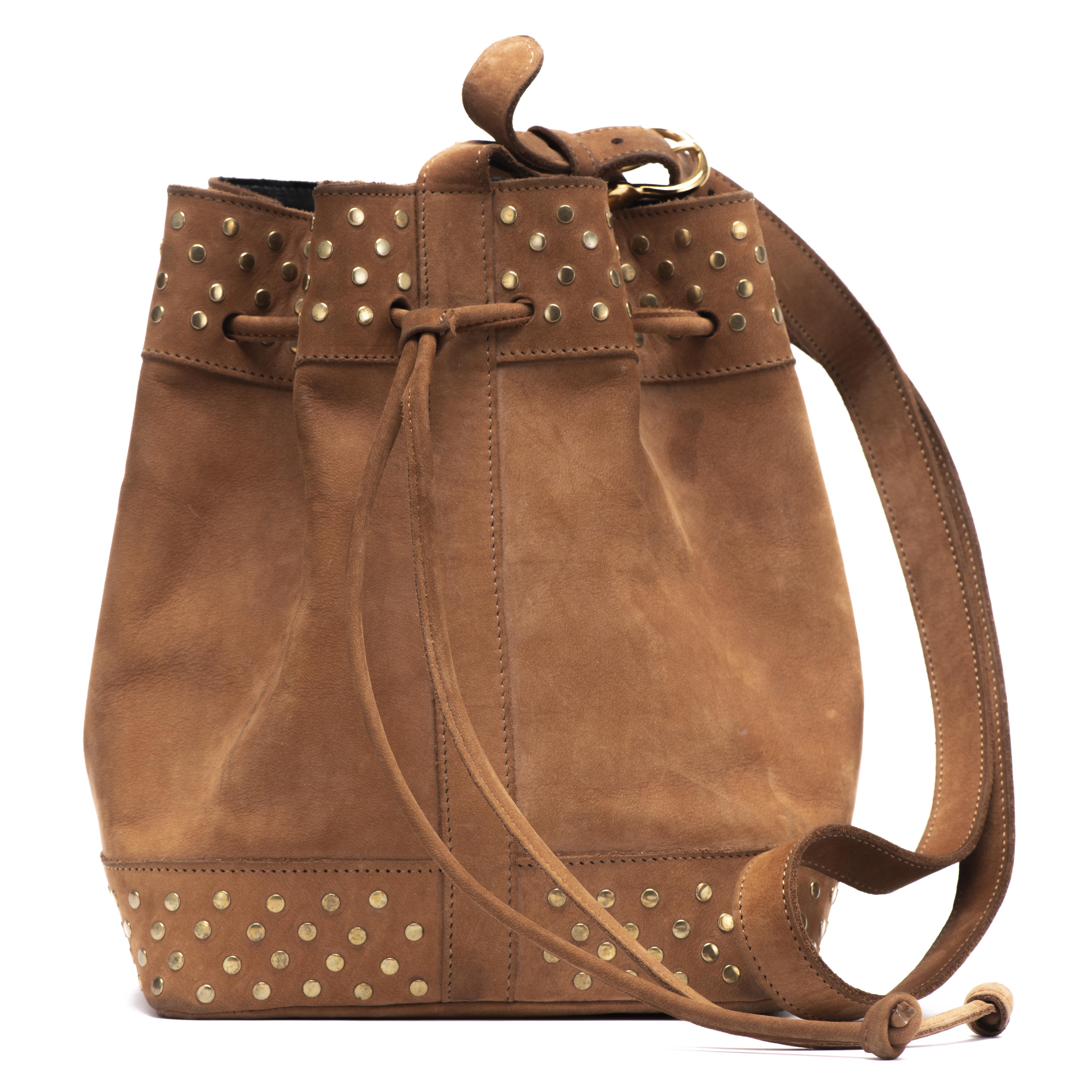 Franck & Fils Paris, sac seau en daim brun clair clouté, porté épaule. Années 70.