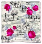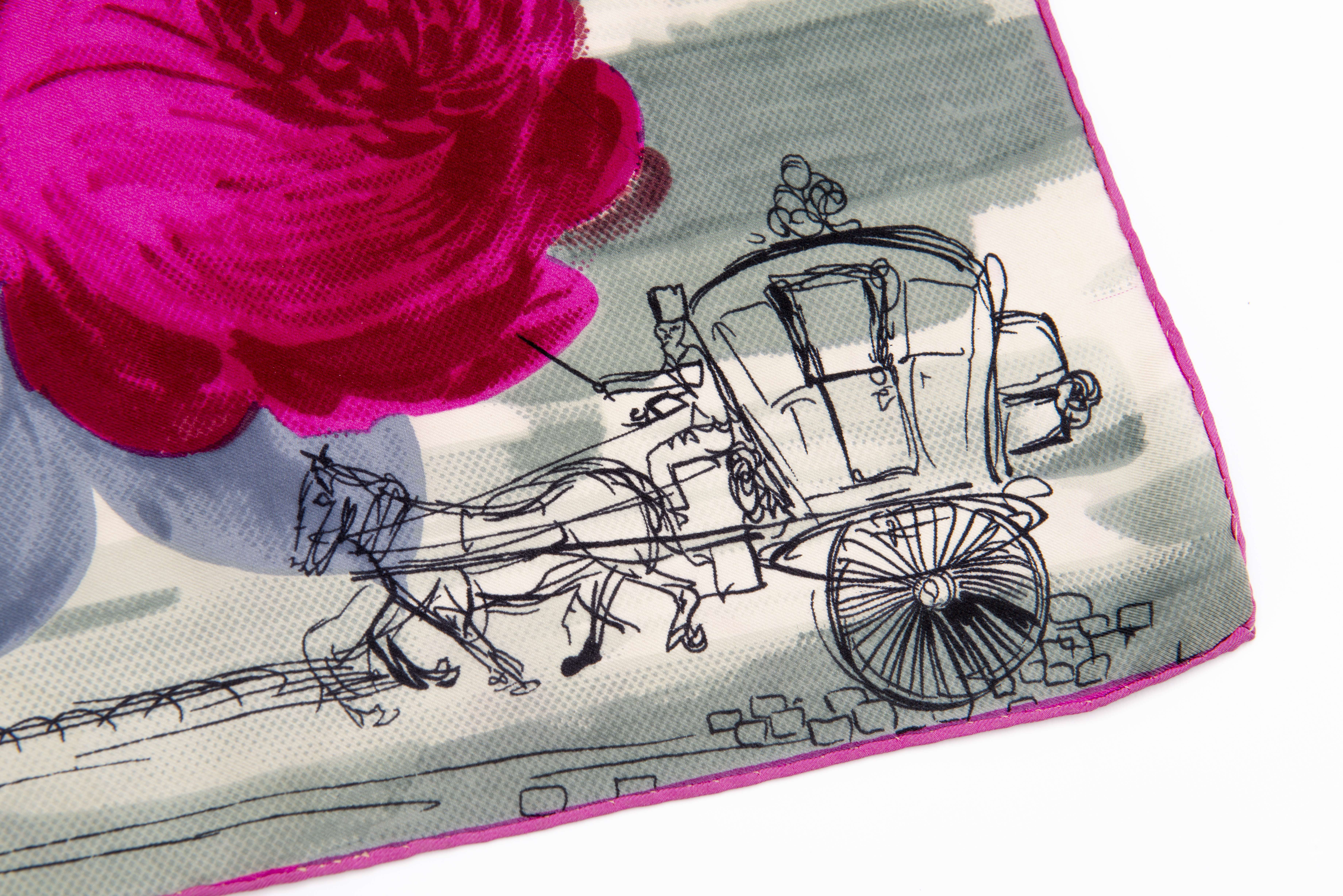 Deux carrés en soie, l'un signé M.M et P.P. à motifs de bateaux et bordure bleue (81x81 cm), l'autre à motifs de roses, personnages et calèches dans un parc sur fond vert et blanc (77x77 cm)