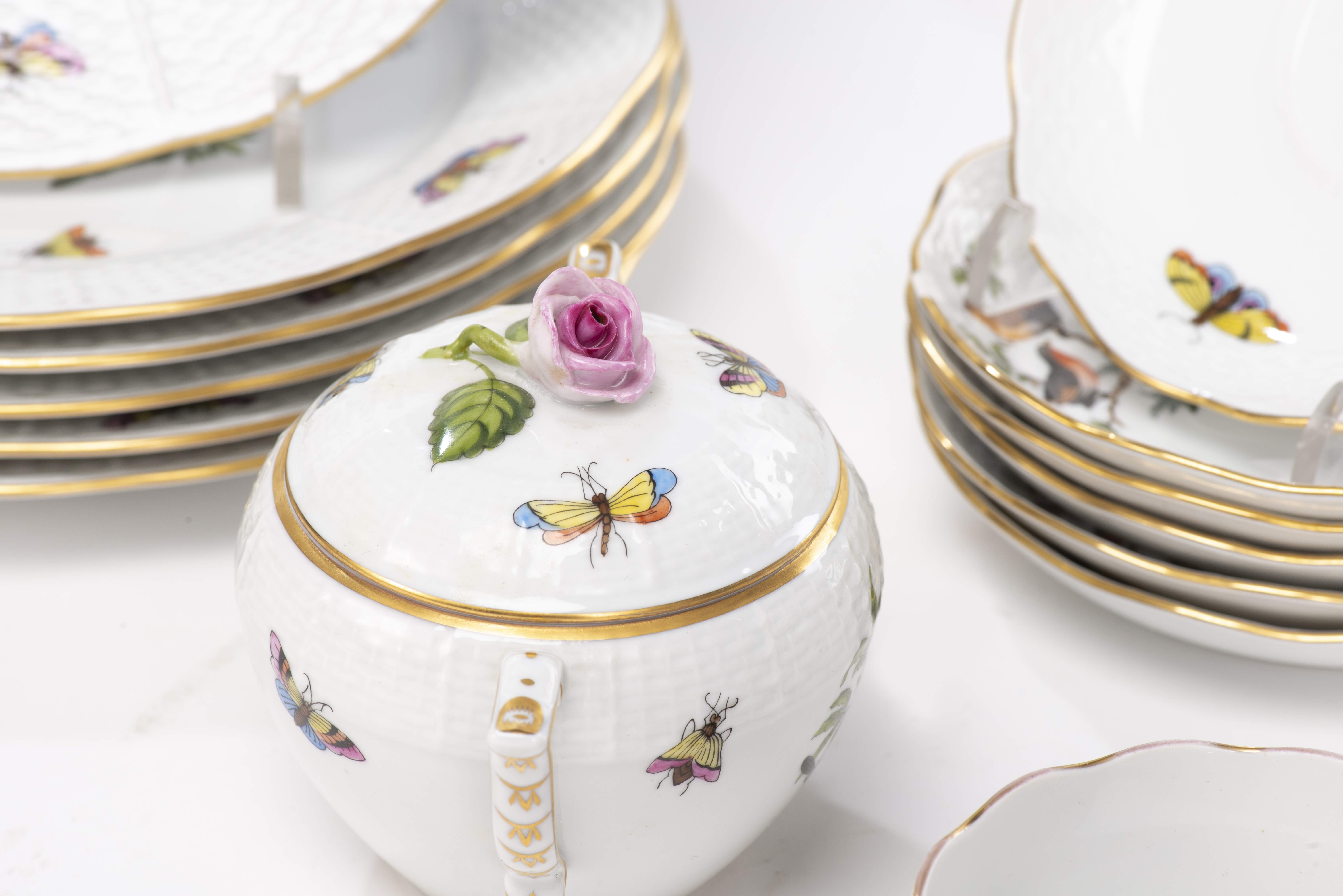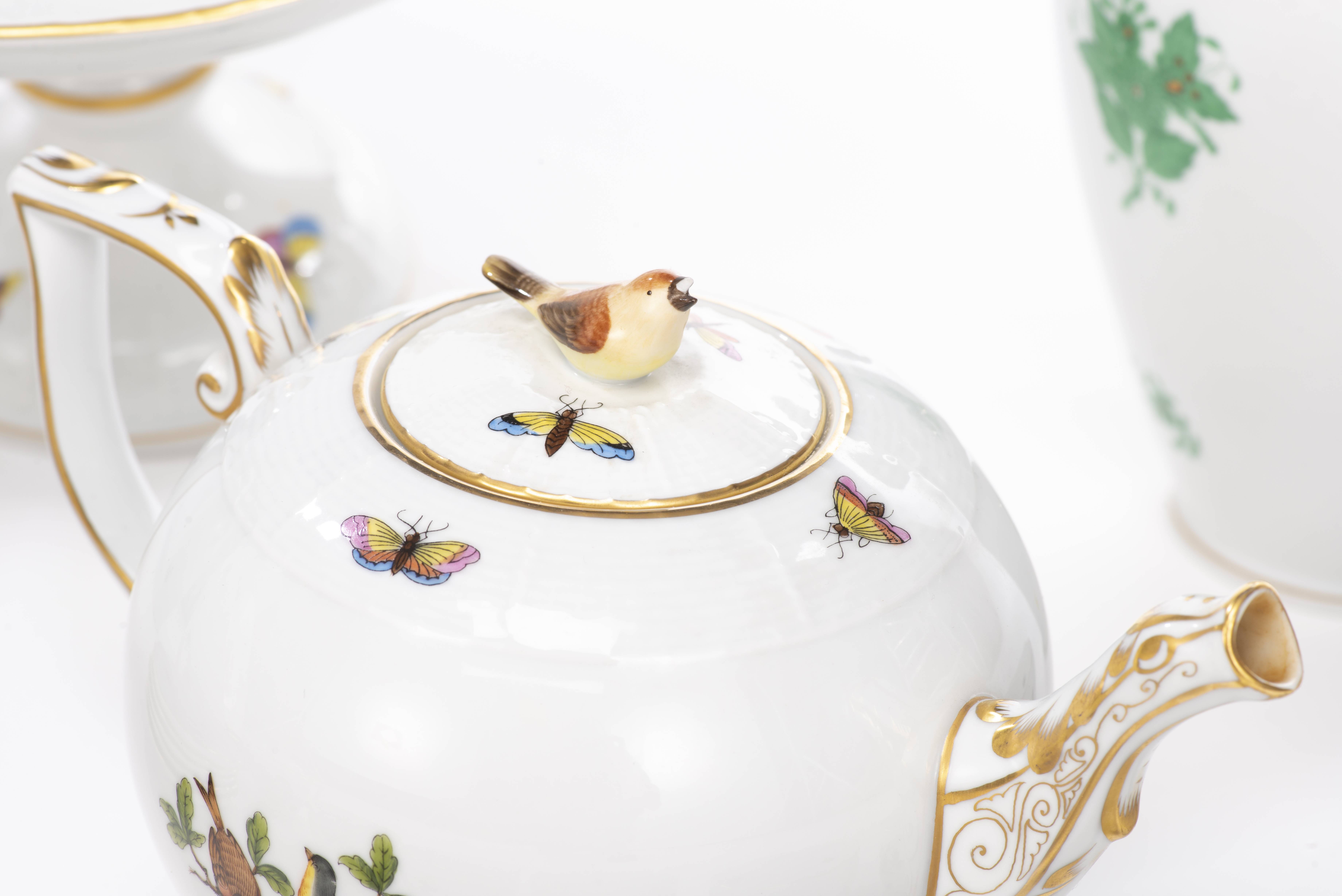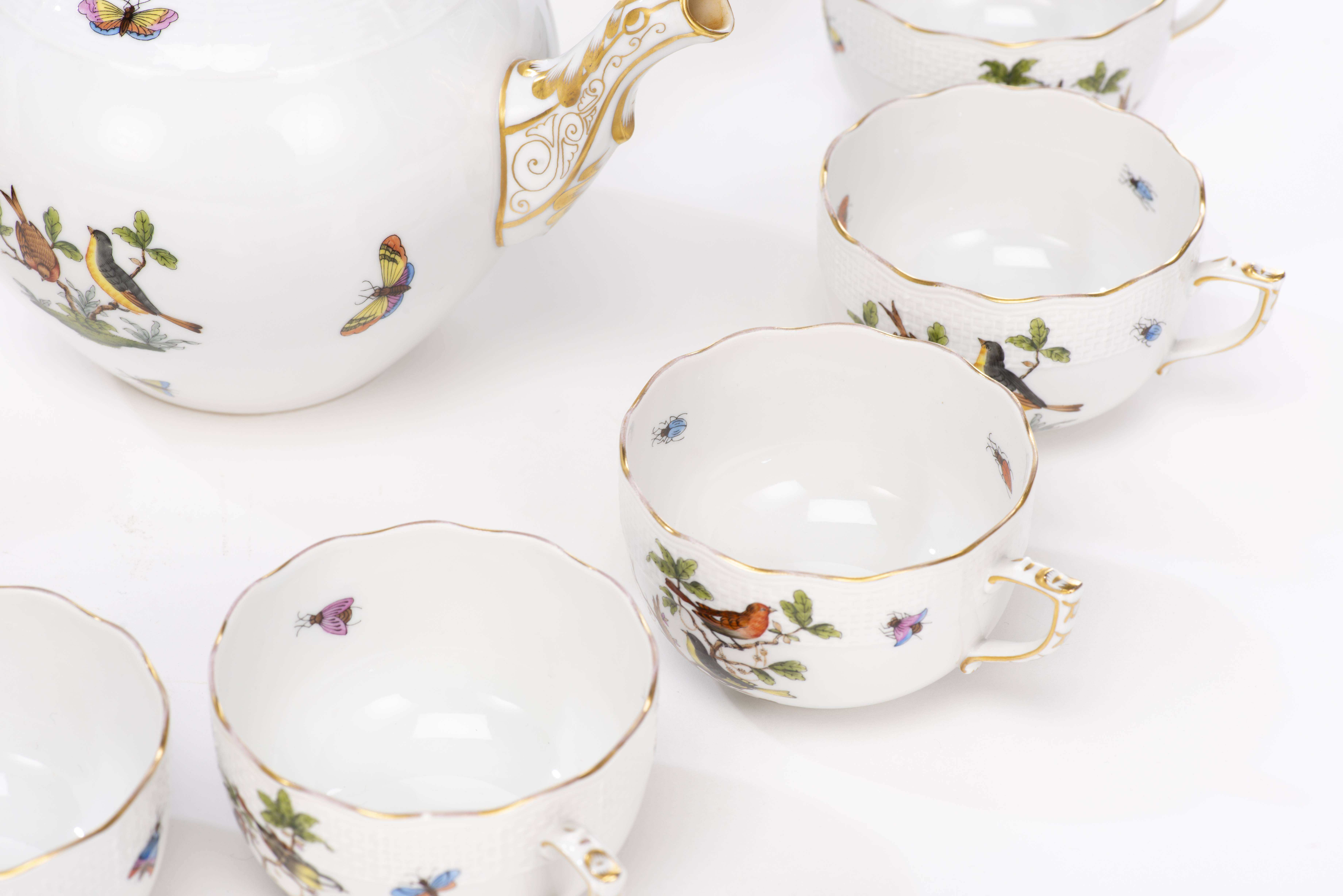 Service en porcelaine de Herend à décor aux oiseaux "Rothchild birds" et insectes comprenant 6 tasses et sous-tasses à thé, un sucrier à couvercle, 1 théière, 6 assiettes à gâteau D. 22.7 cm, 1 présentoir à gâteau H. 14.6 cm D. 23.8 cm