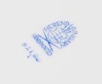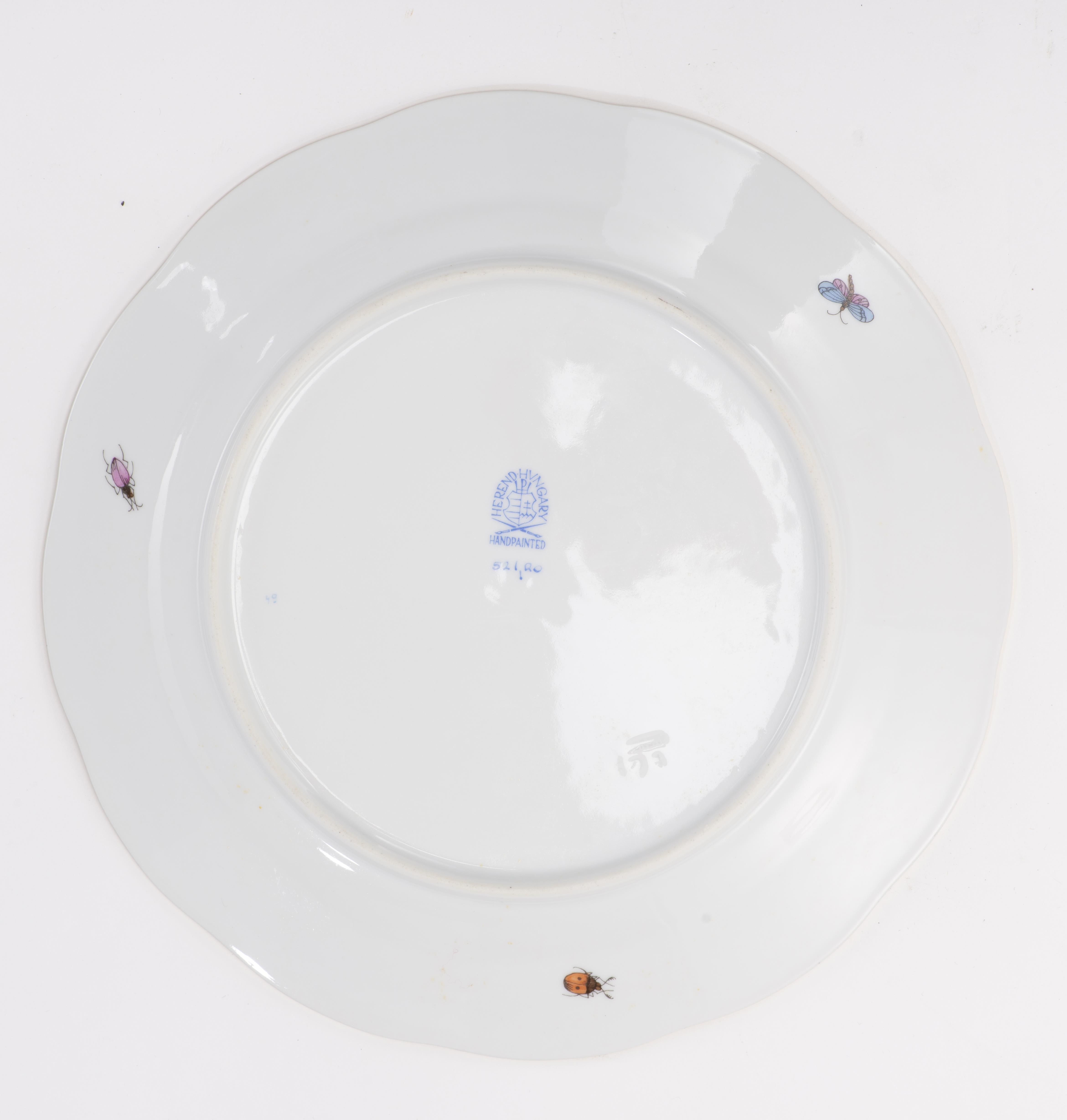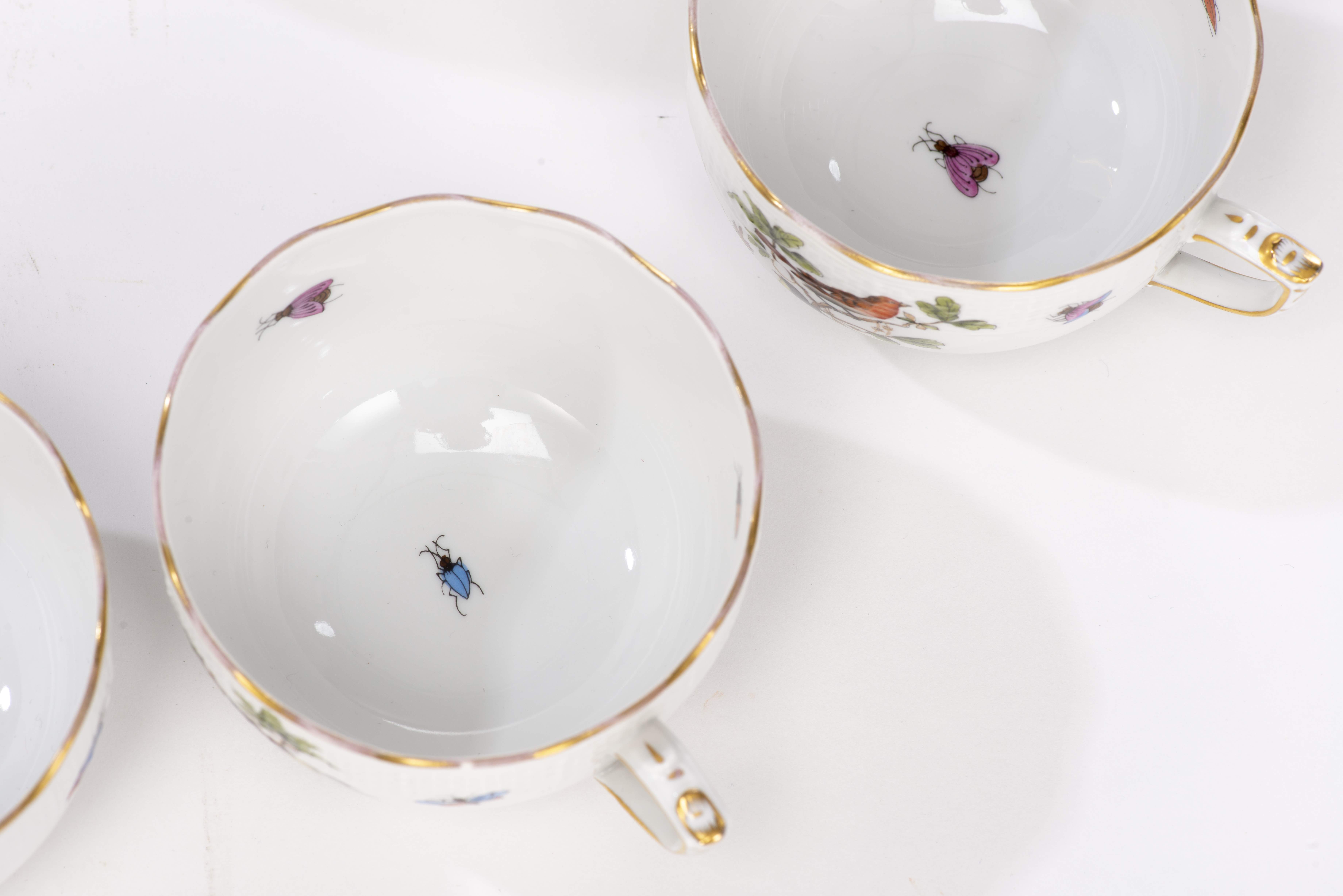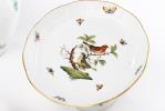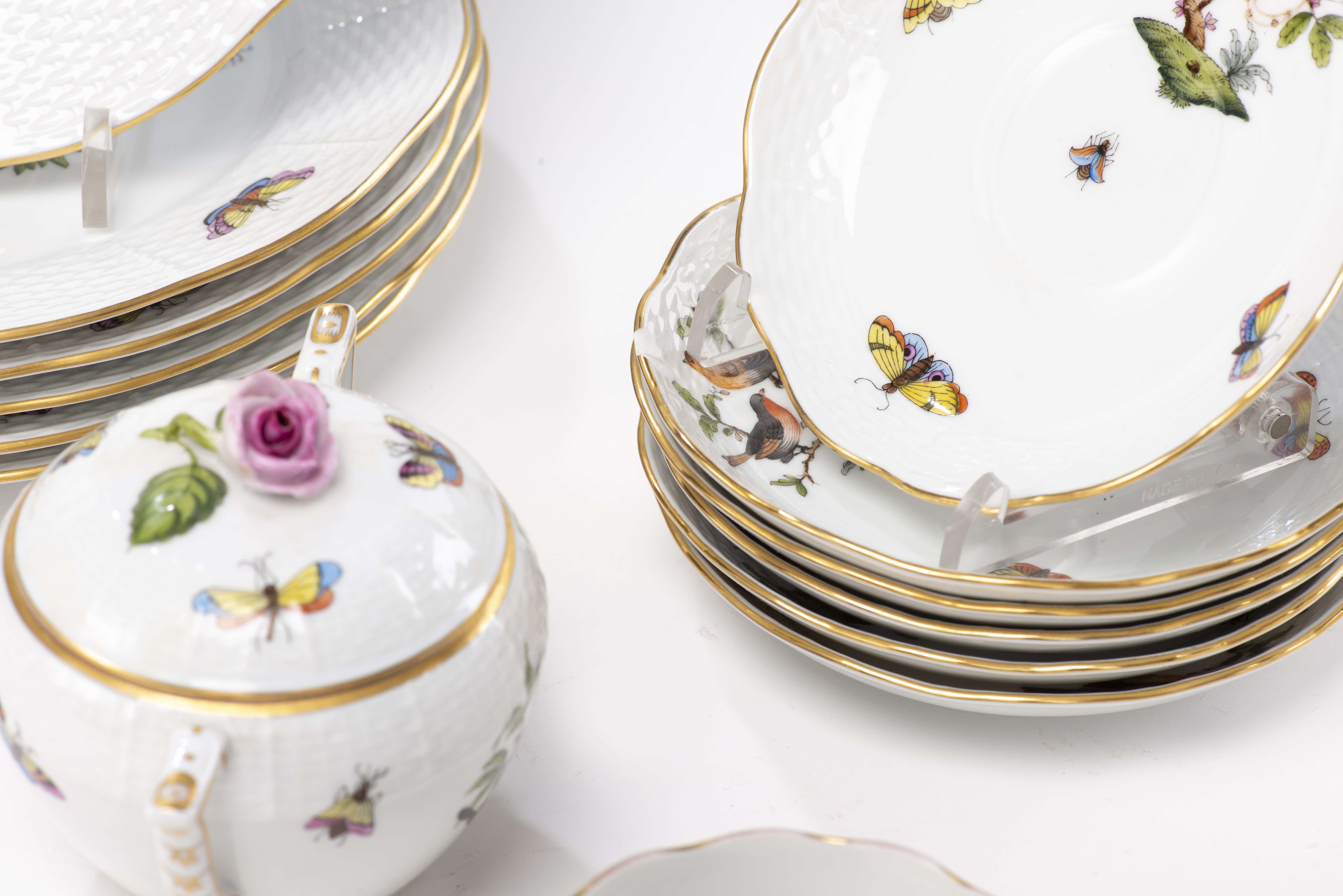 Service en porcelaine de Herend à décor aux oiseaux "Rothchild birds" et insectes comprenant 6 tasses et sous-tasses à thé, un sucrier à couvercle, 1 théière, 6 assiettes à gâteau D. 22.7 cm, 1 présentoir à gâteau H. 14.6 cm D. 23.8 cm