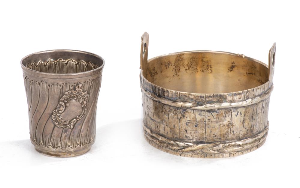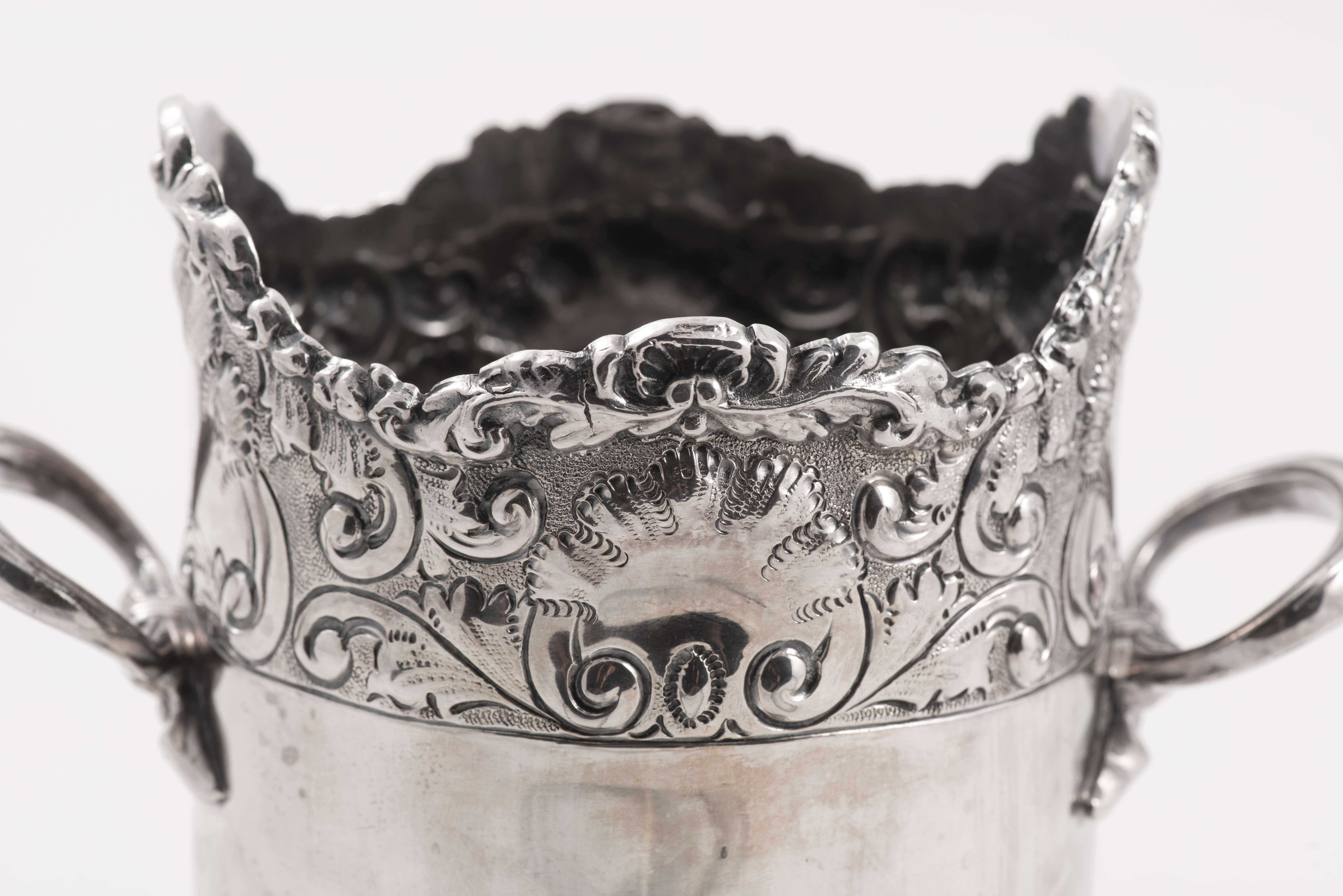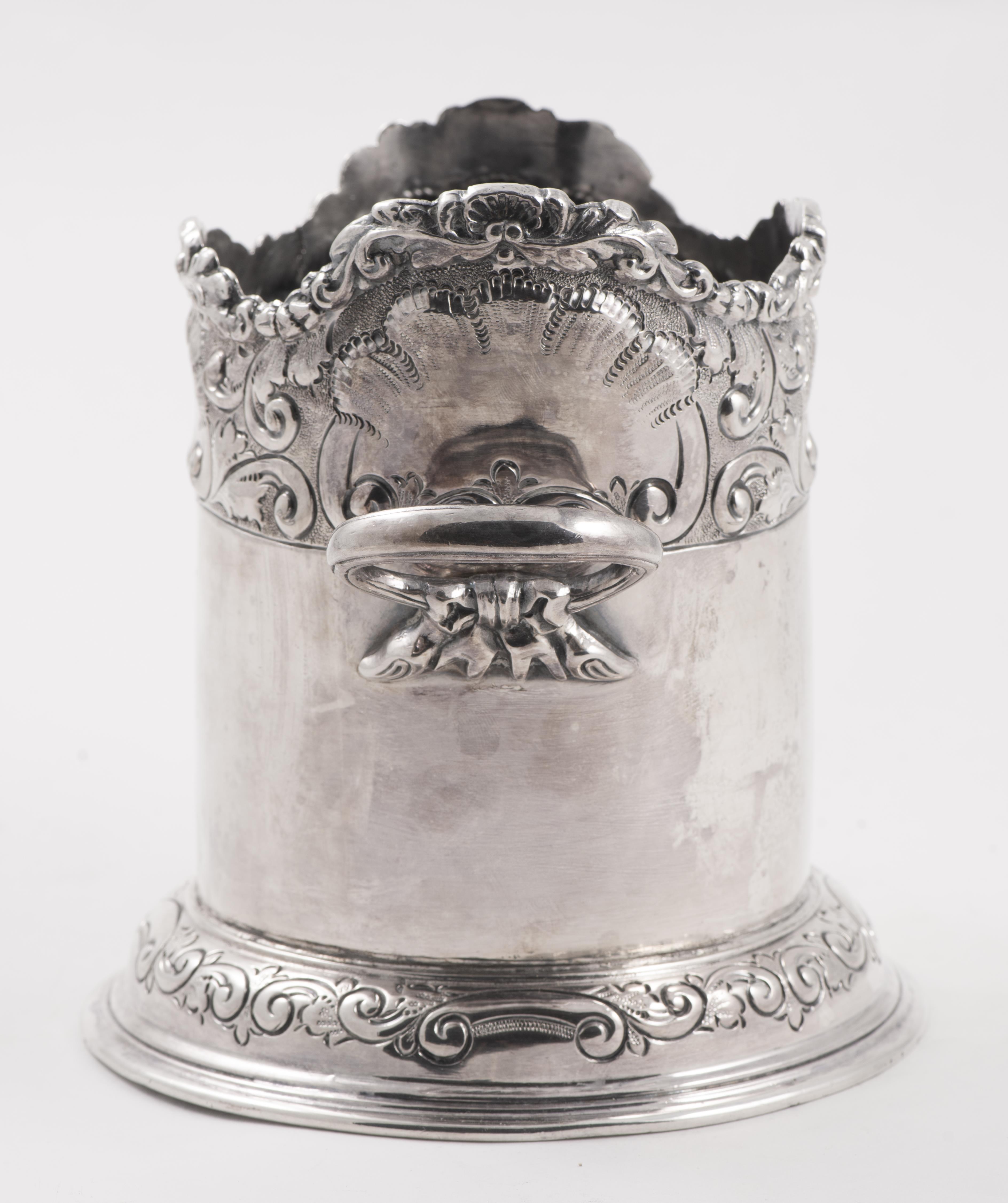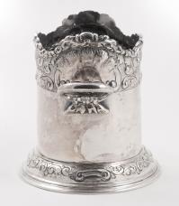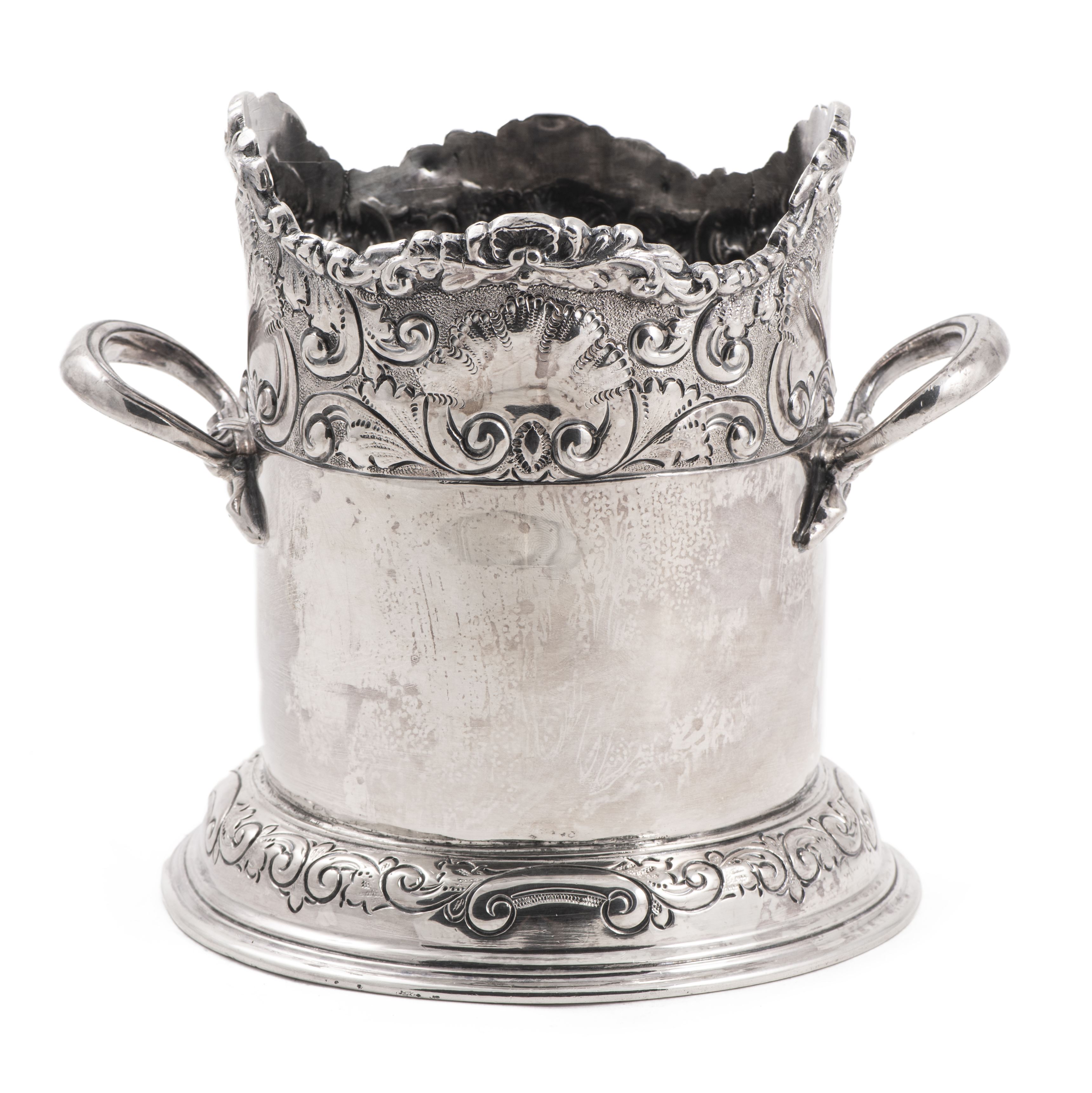Rafraichissoir en métal argenté à deux anses, décor feuillagé.