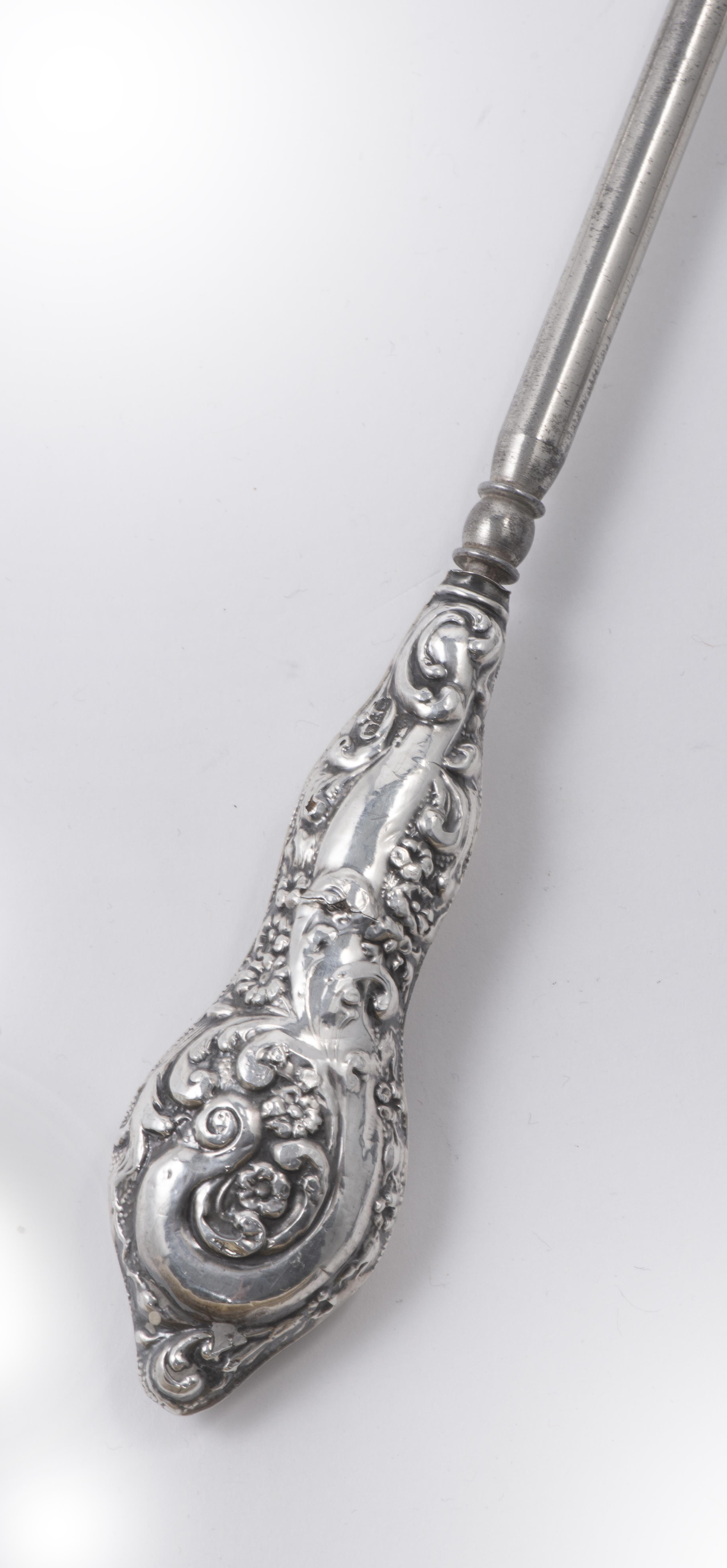 - 1 tire-lacet, 1 chausse-pied et 1 pince à manche fourré en argent sterling .925 Poids total : 829 g Poids total hors manches fourrés : 473 g