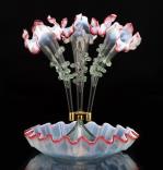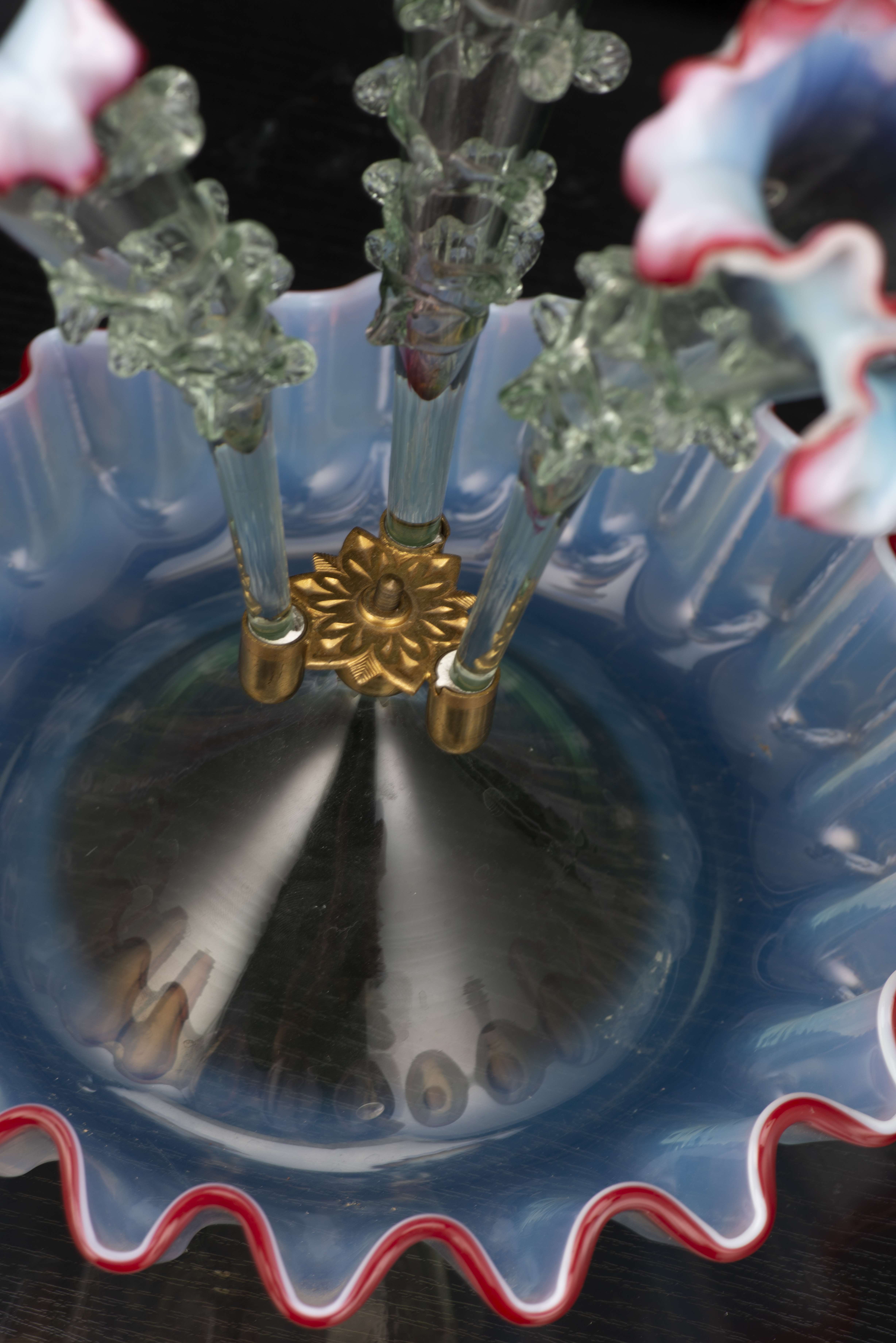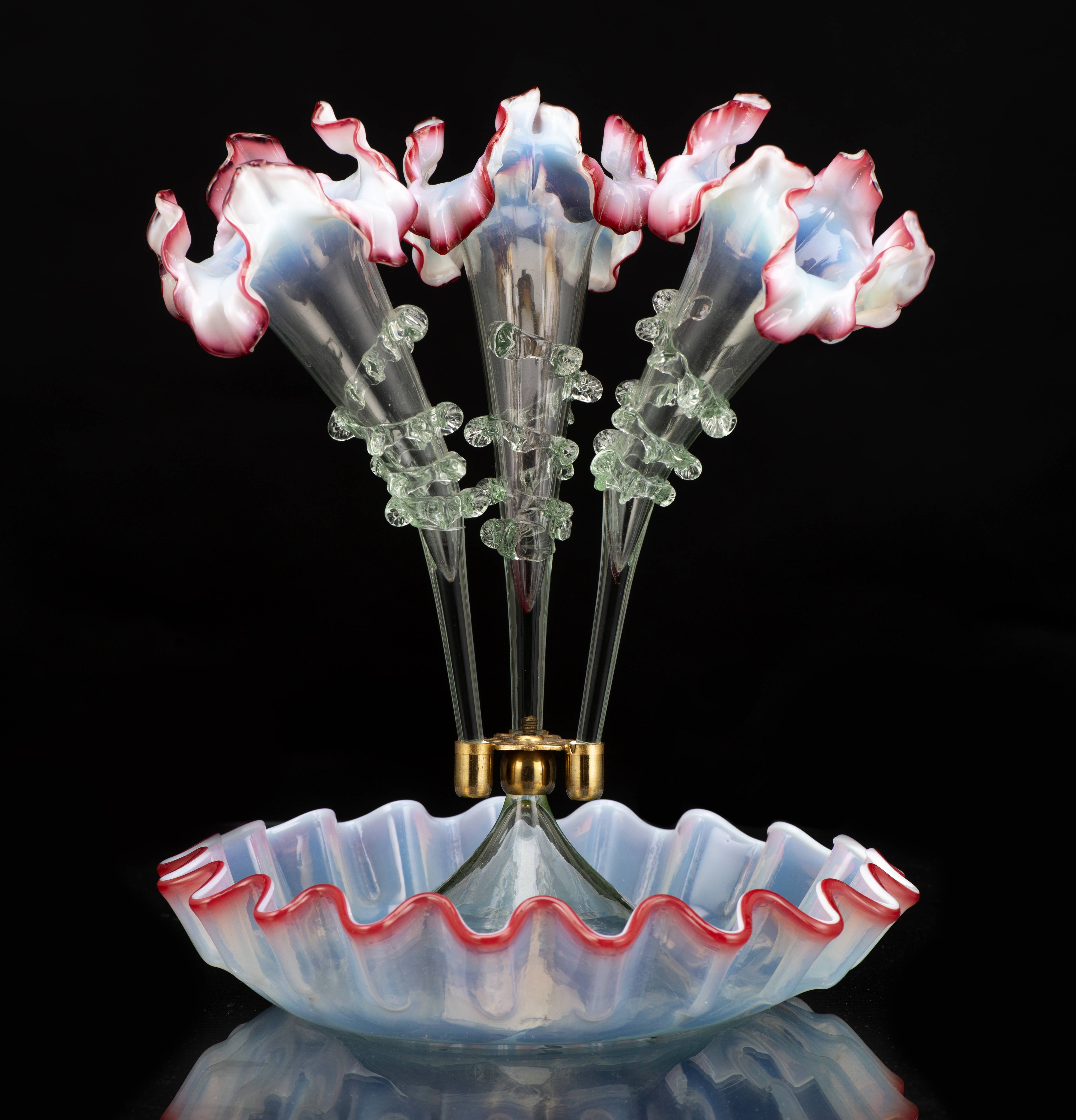 Murano, trois soliflores en verre opalescent et colerette rose montés sur une coupe.