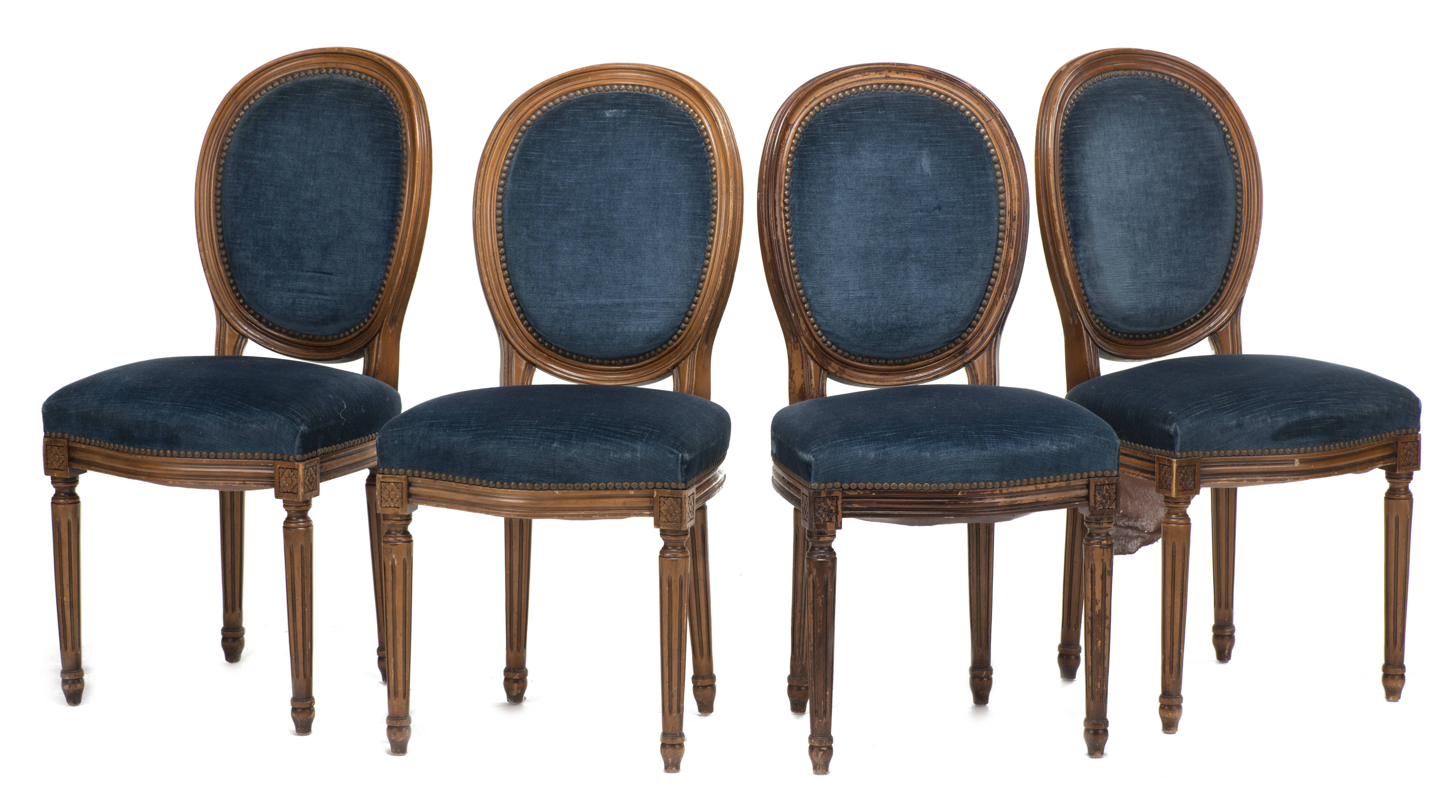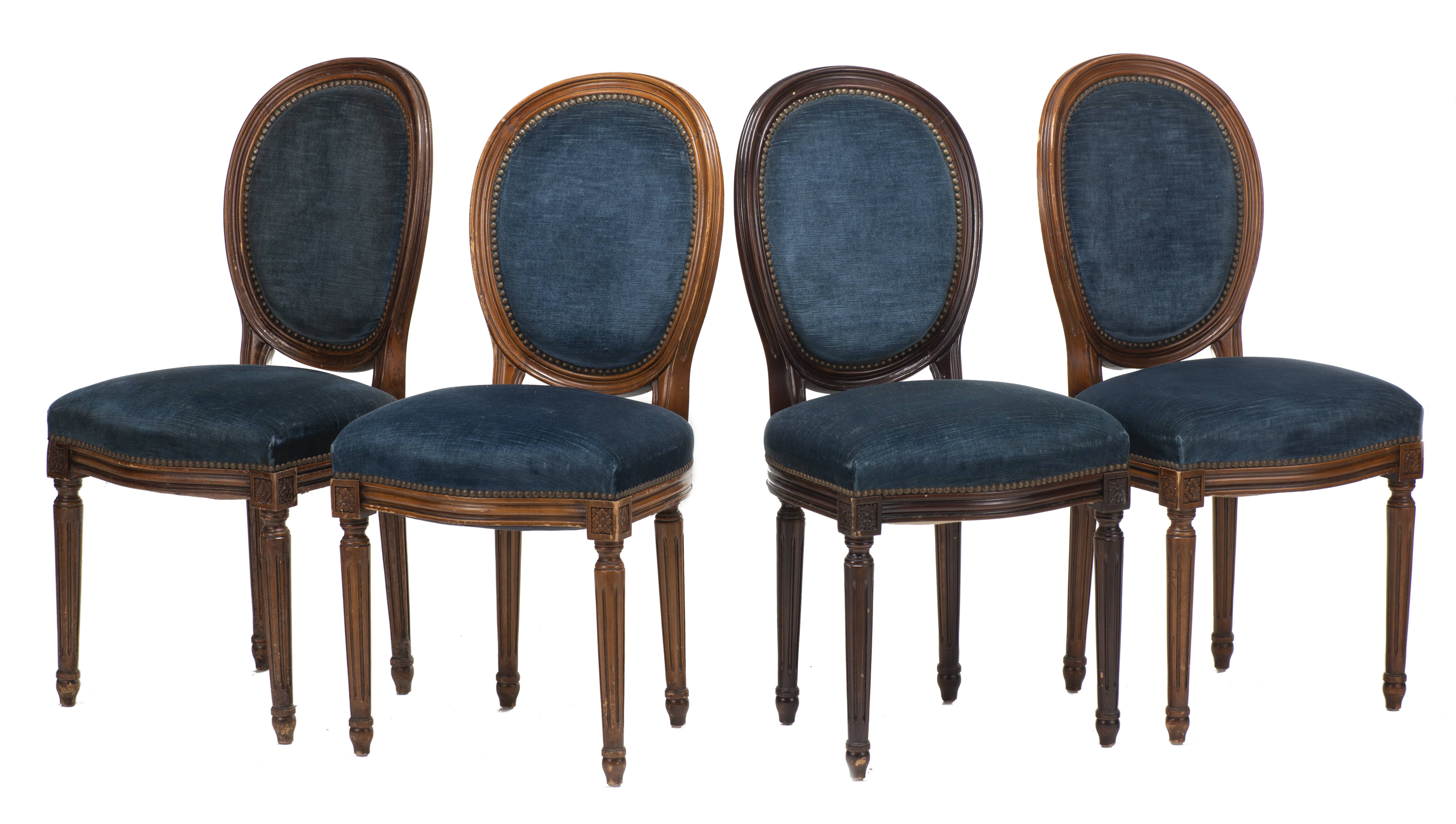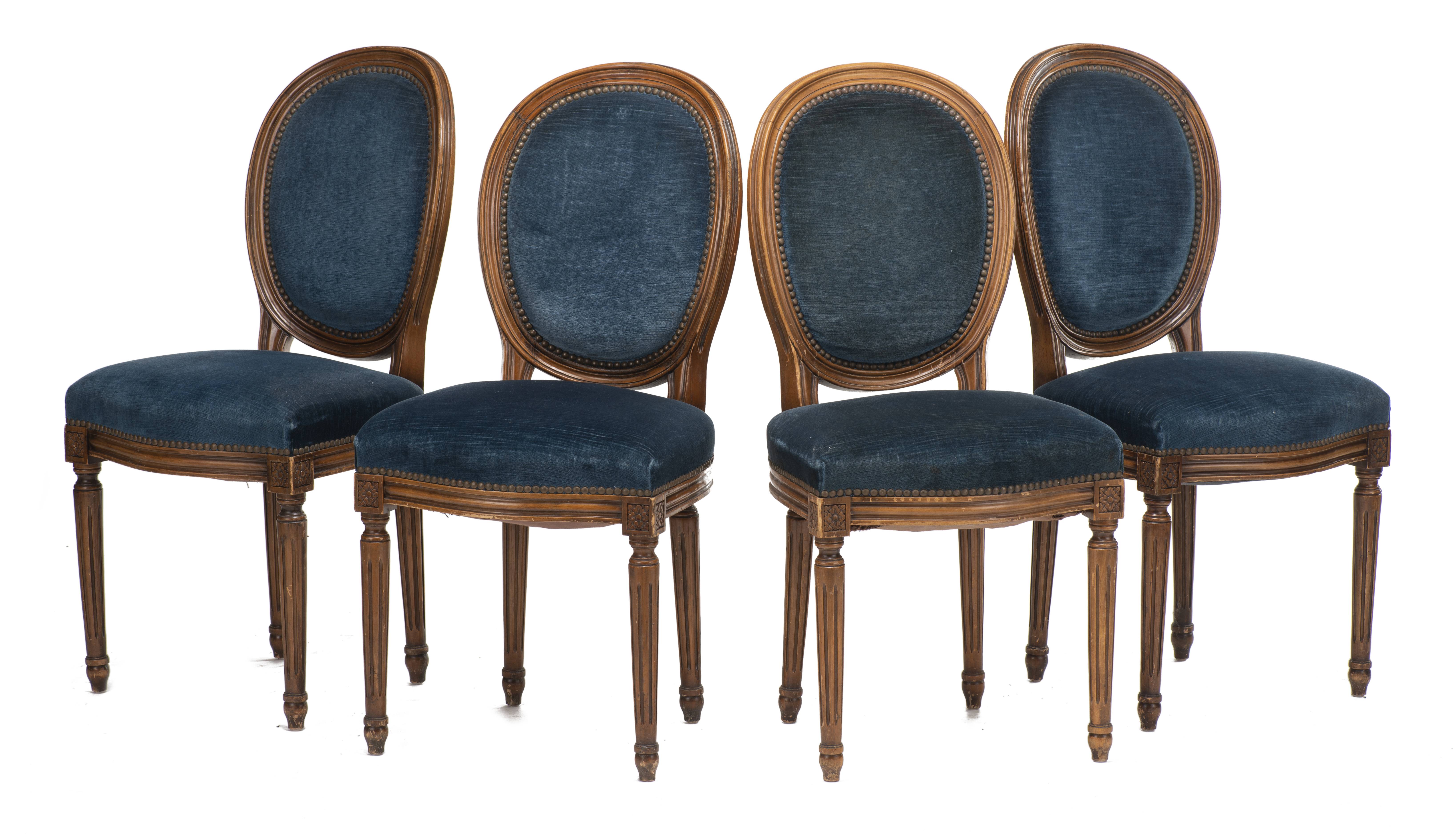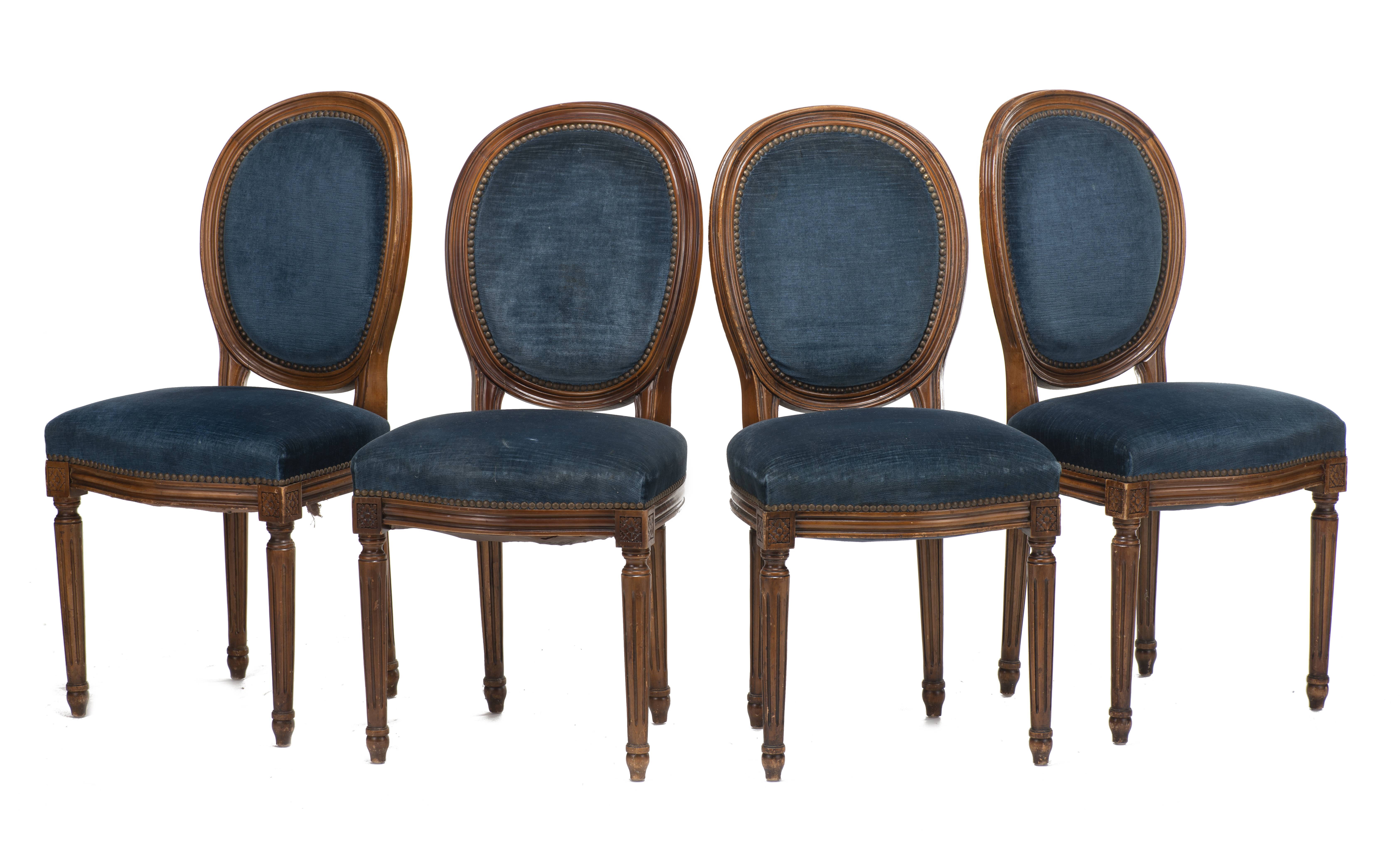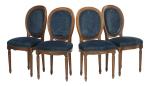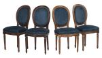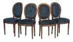 28 chaises de style Louis XVI à médailon rond, à assise et dossier recouverts de velours bleu.