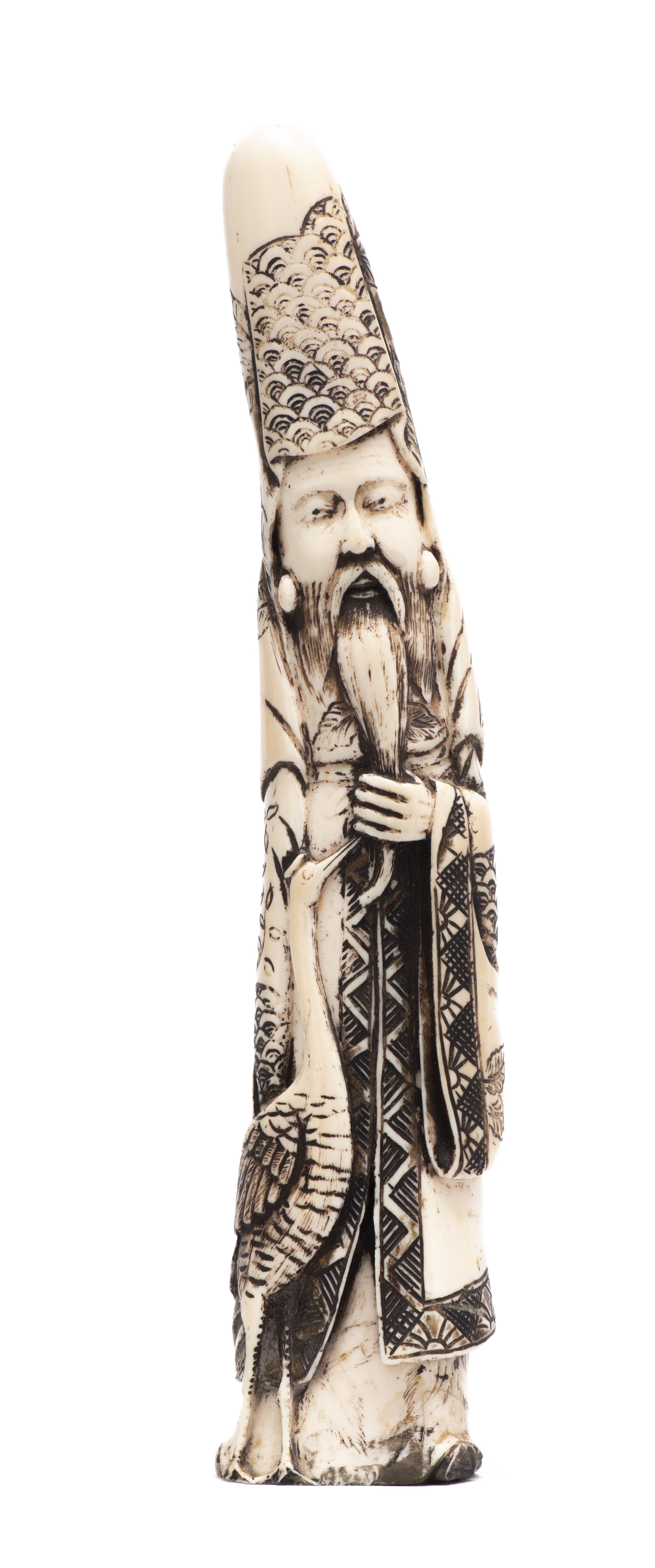 Statuette en dent de morse sculptée représentant un homme avec une grue à ses côtés.