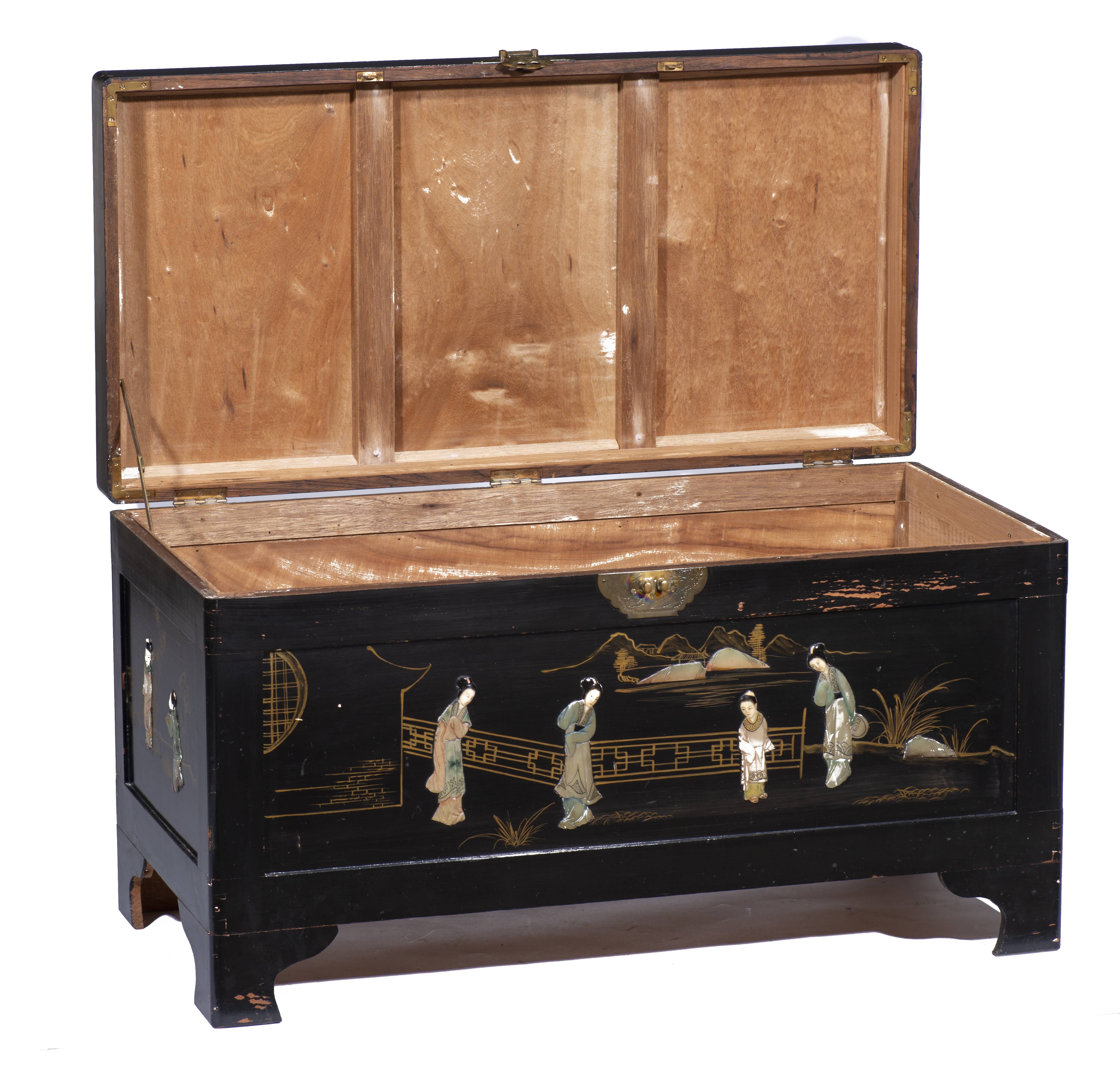 Coffre chinois à intérieur en camphrier et décor extérieur sur 3 faces de paysages lacustres à incrustations de pierres et galalithe représentant des jeunes femmes sur un perron devant une étendue d'eau.