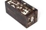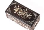Petite boîte rectangulaire en bois de fer à marqueterie de nacre indochinoise à décor lacustre et campagnard et dessus de fleurs et papillons. XIXe.