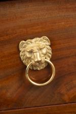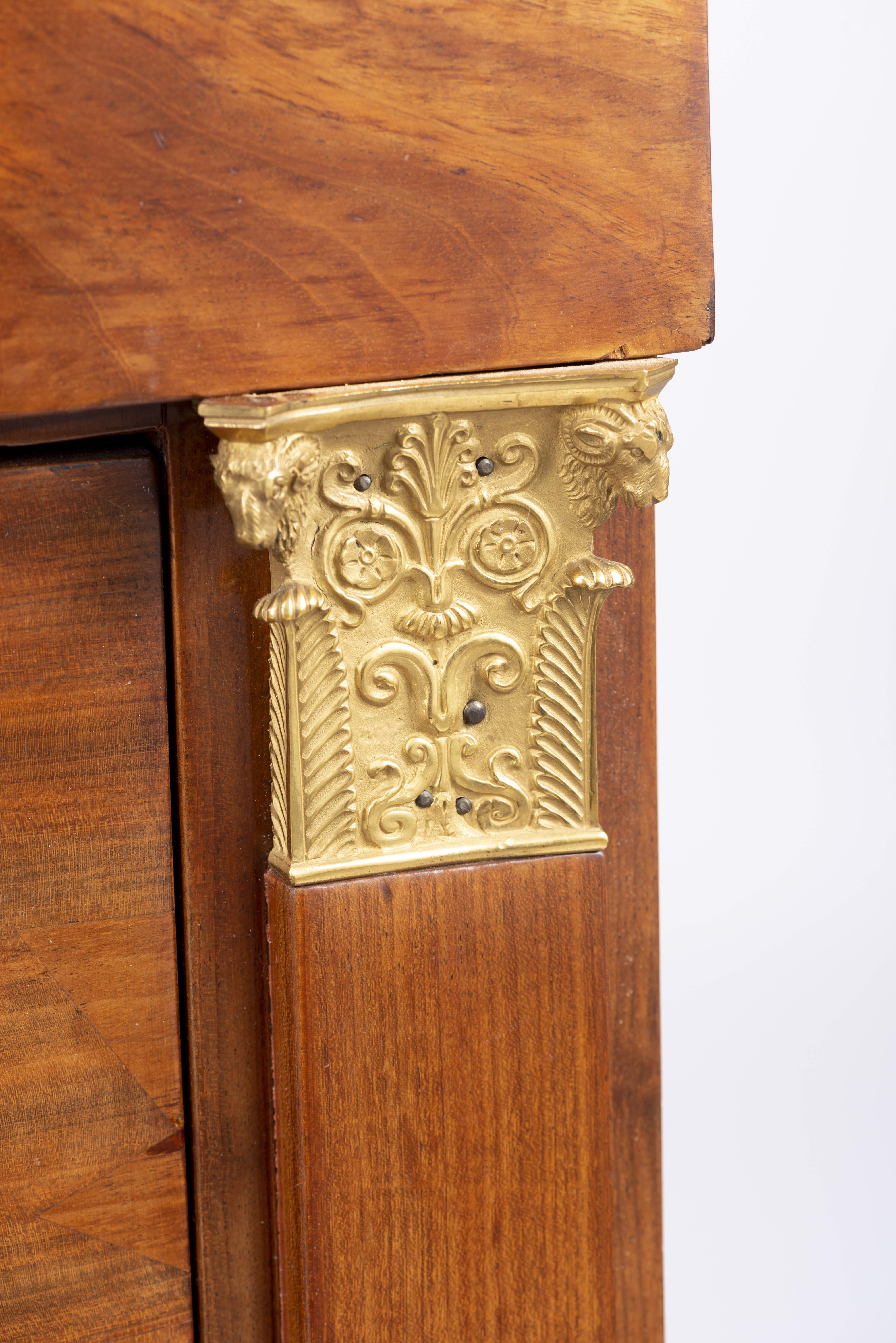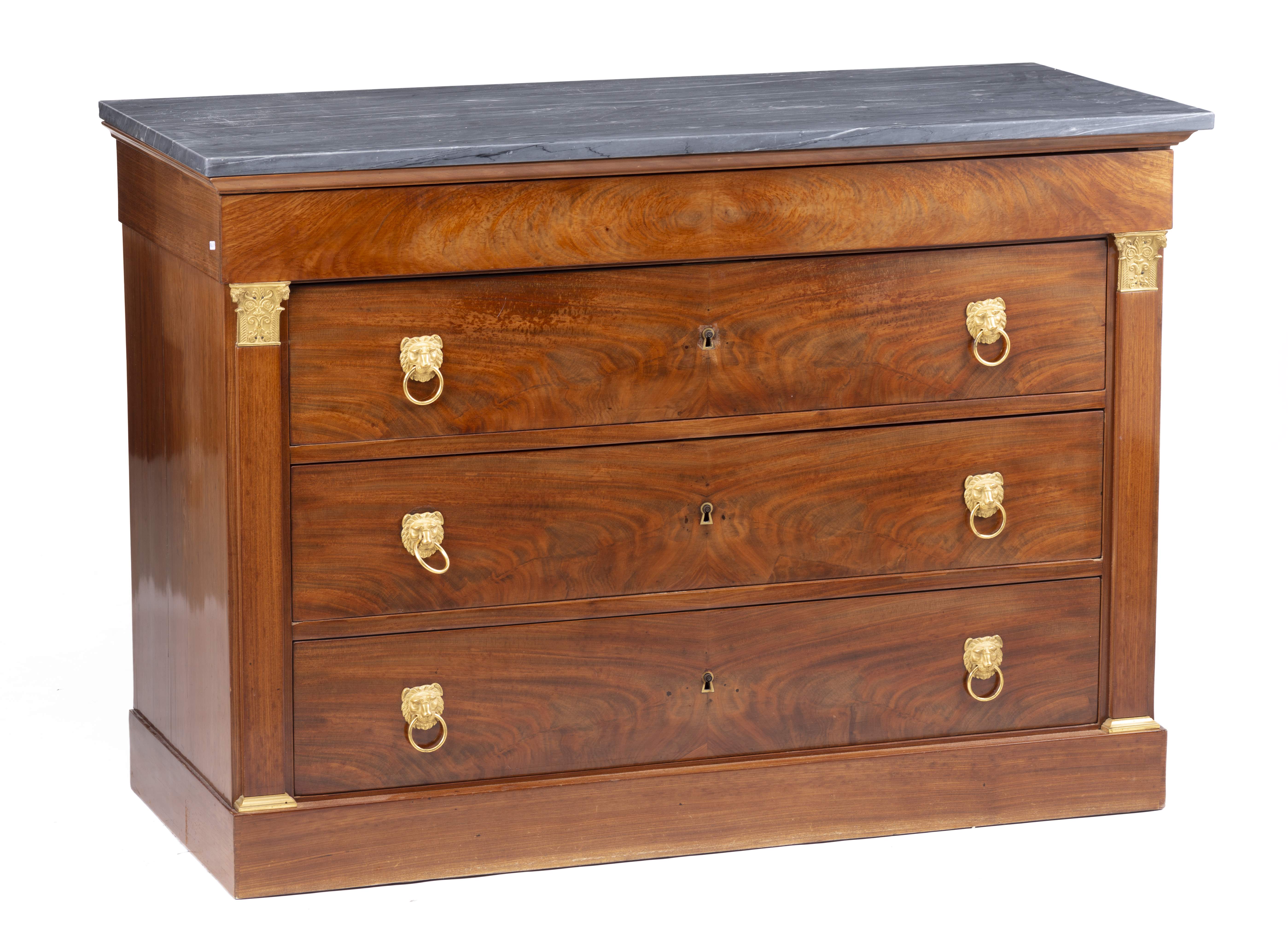 Commode en acajou de style Empire avec décorations de bronze et plateau de marbre gris Saint-Anne. 4 tiroirs entre demi-colonnes carrées à bases et chapiteaux en bronze doré.