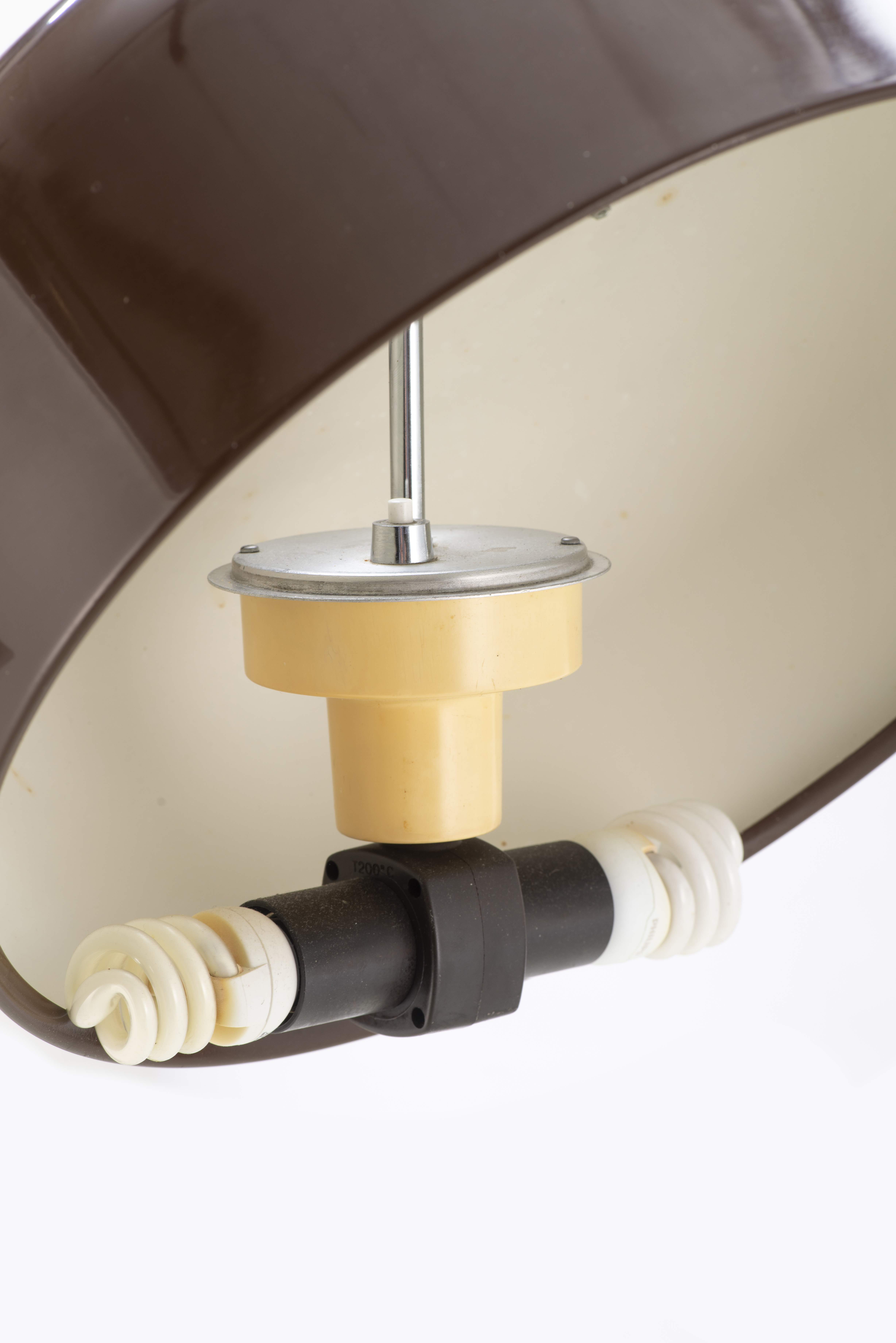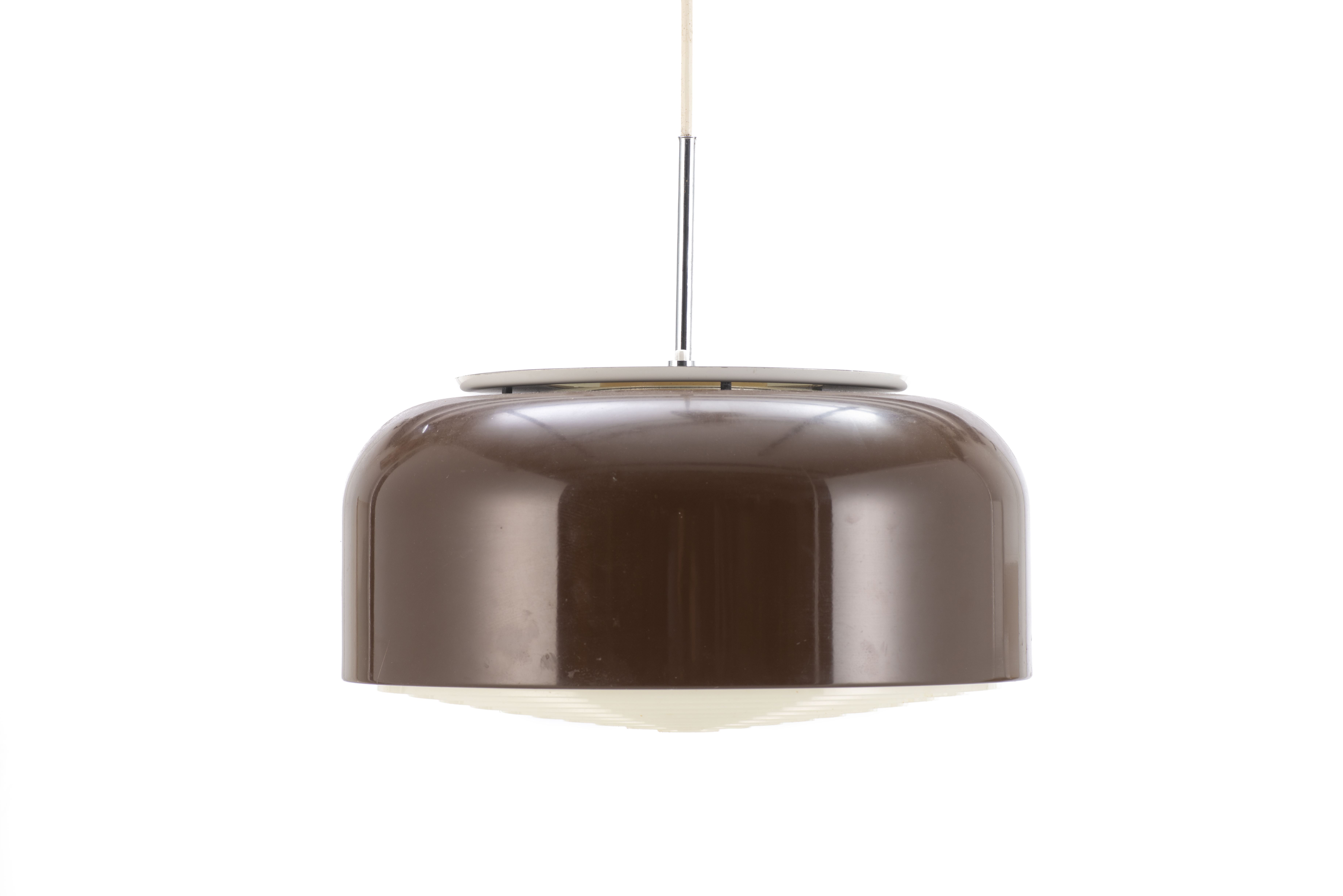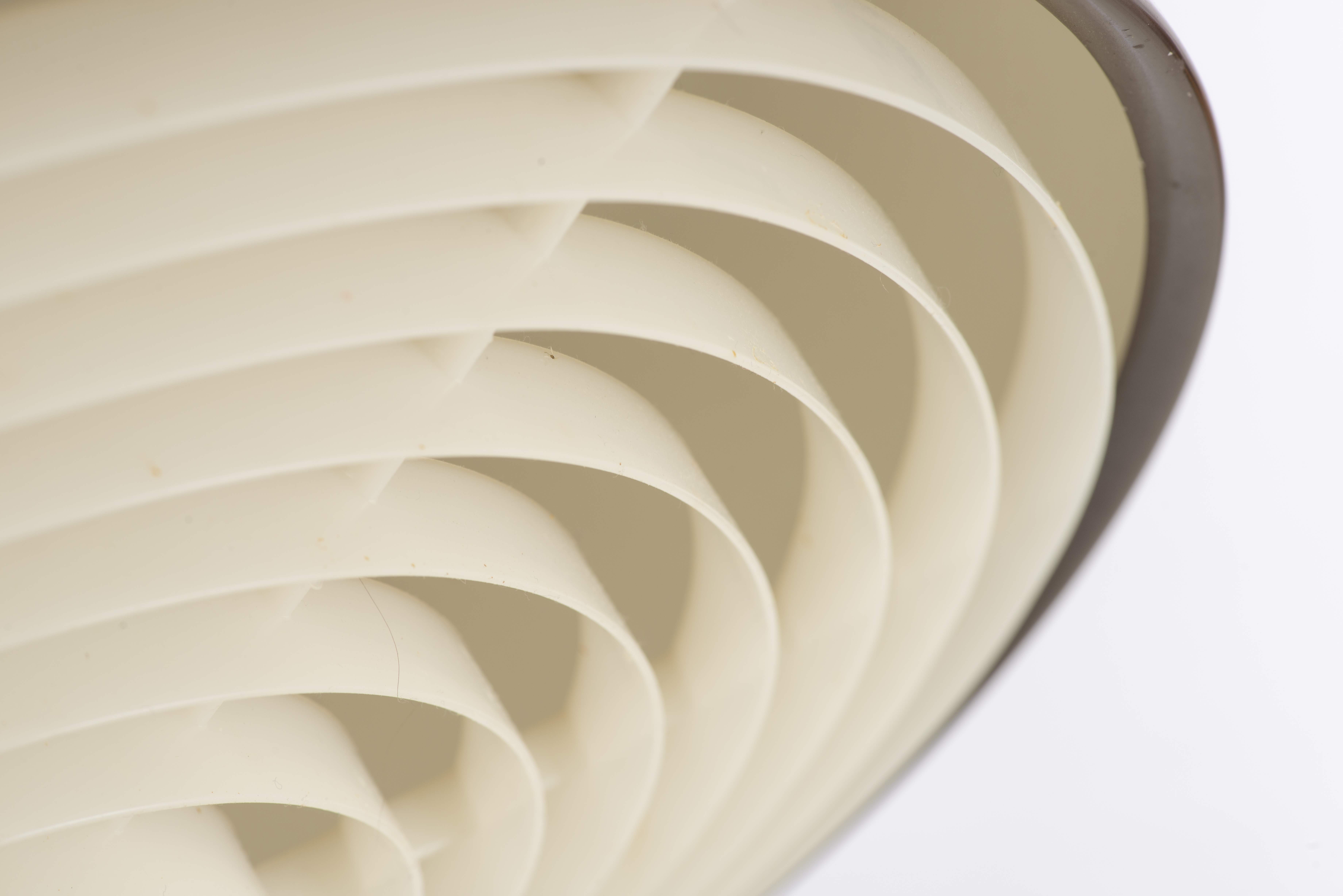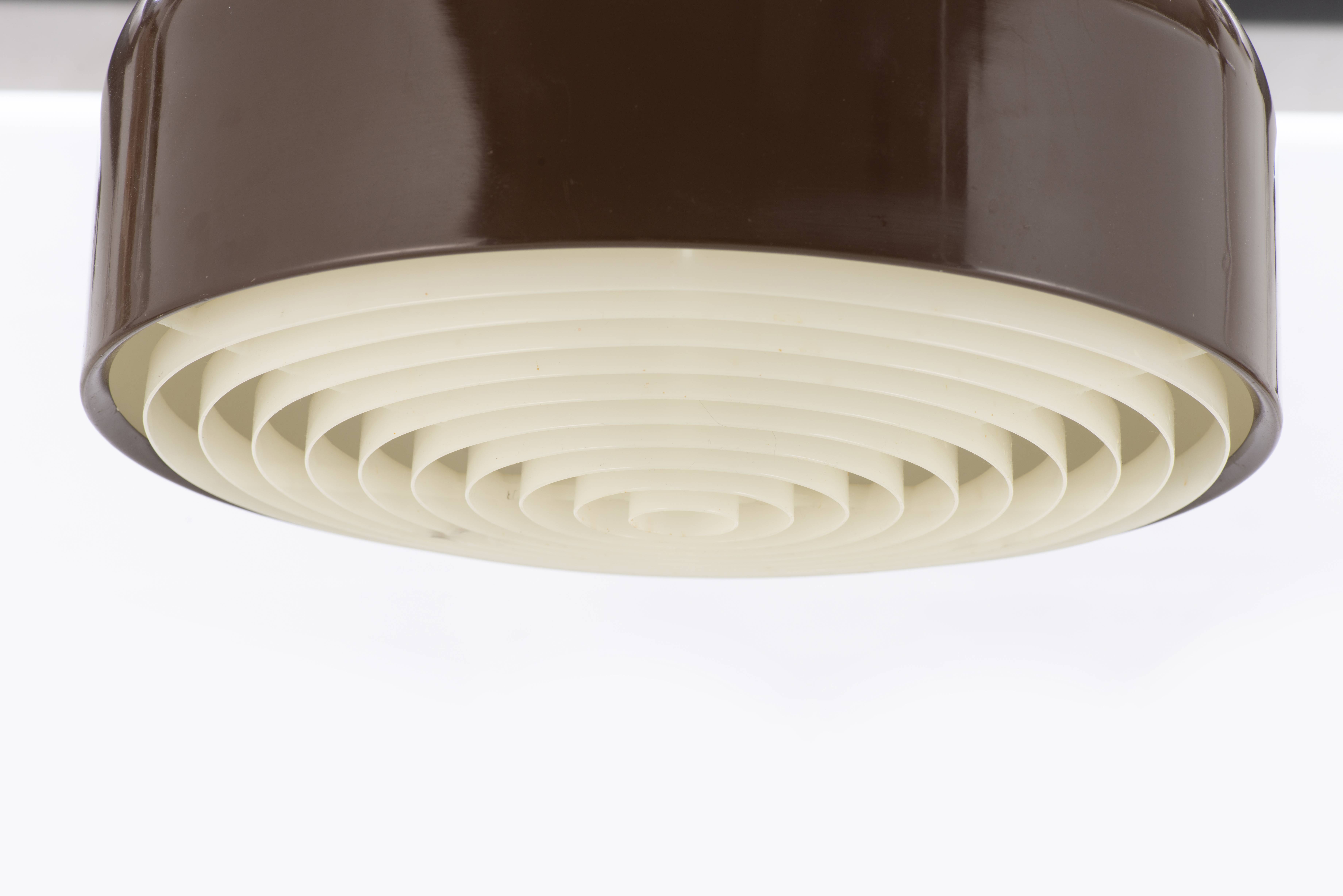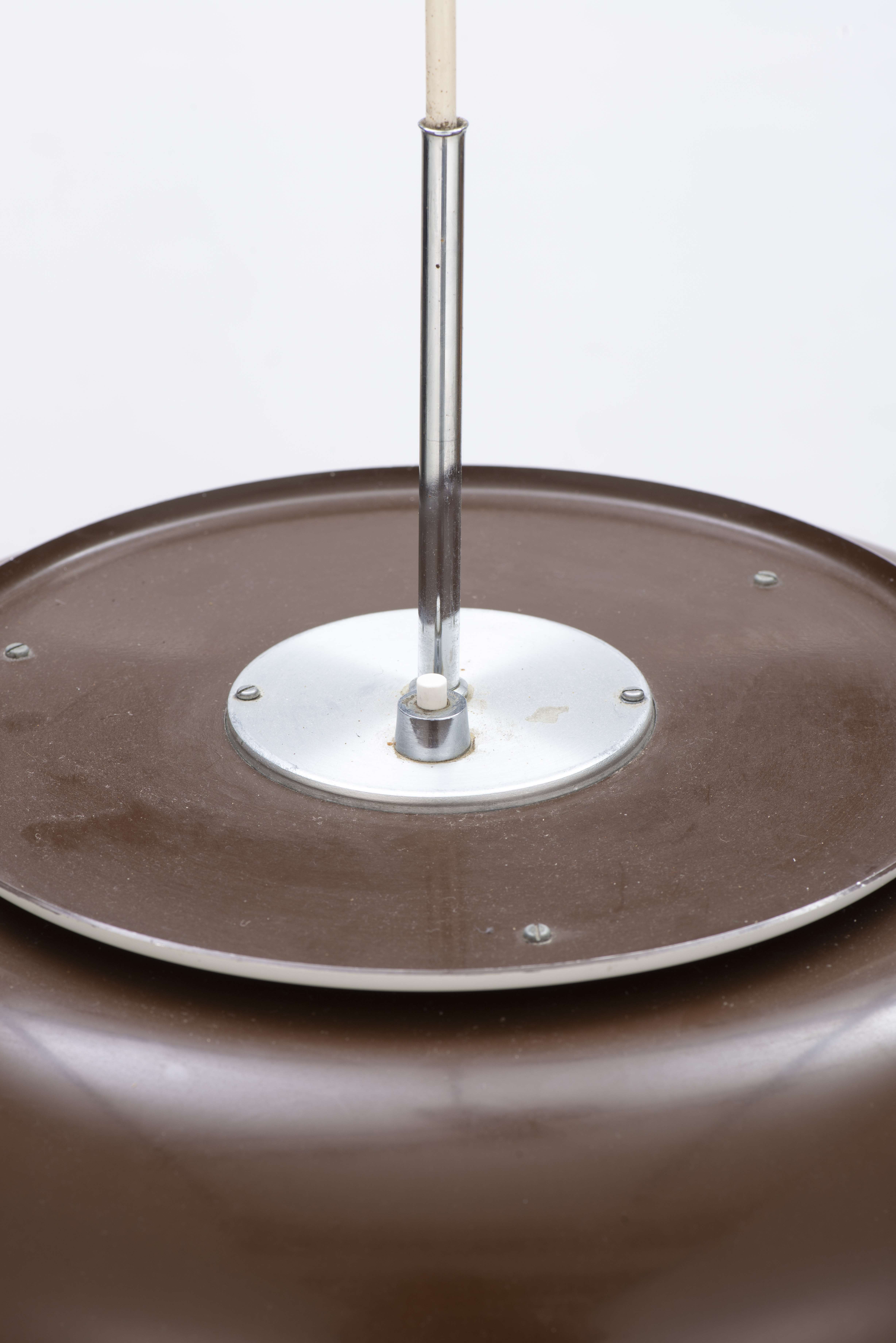 Suspension TAKLAMPA, "Knubblingen", par Anders Pehrson pour Ateljé Lyktan, Åhus (Ateljer Lyktan-Ahus). Abat-jour intérieur blanc et extérieur en aluminium couleur chocolat, made in Sweden circa 1960.