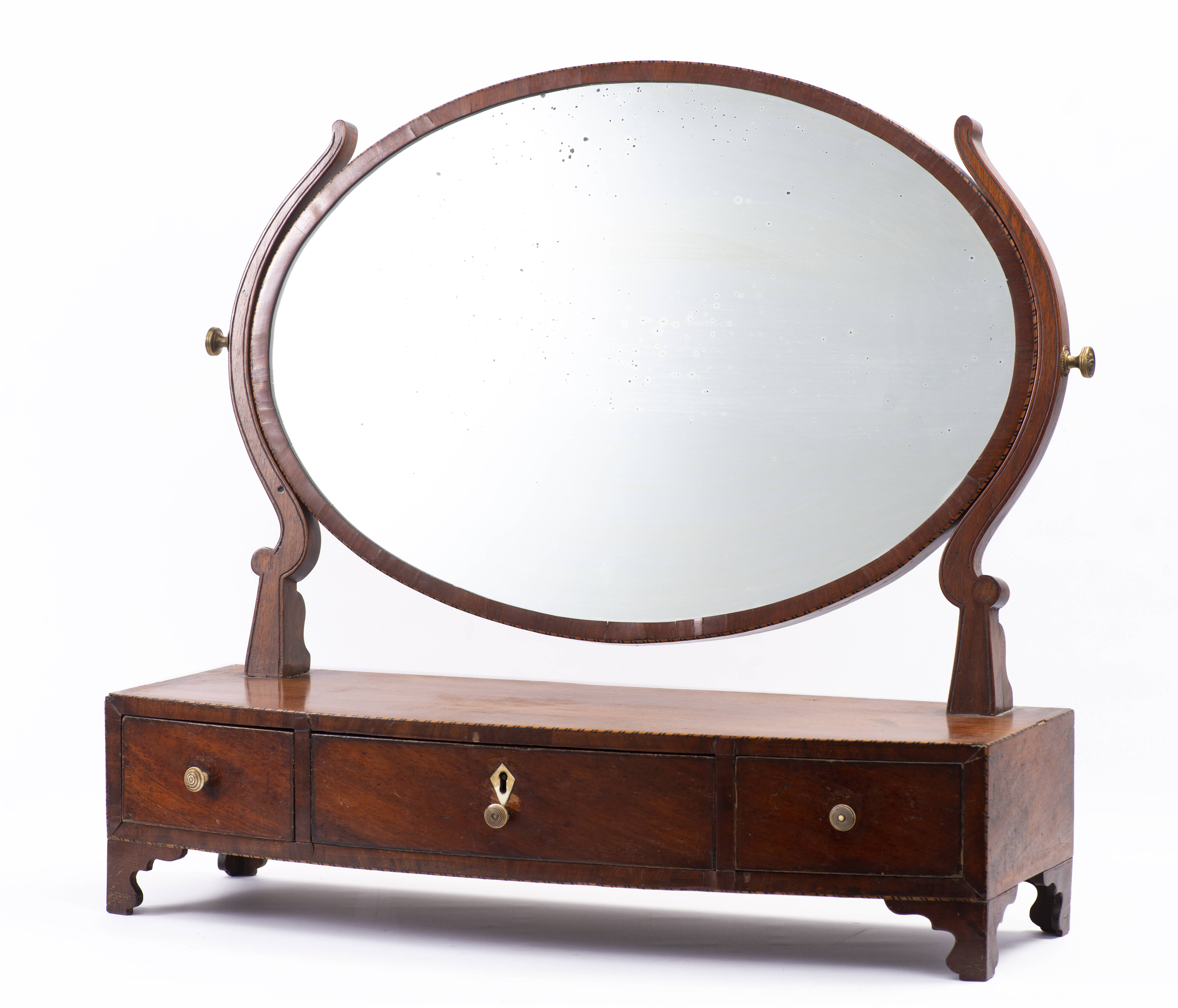 Psyché anglaise ovale en acajou de style Edwardien à 3 tiroirs sur la base.