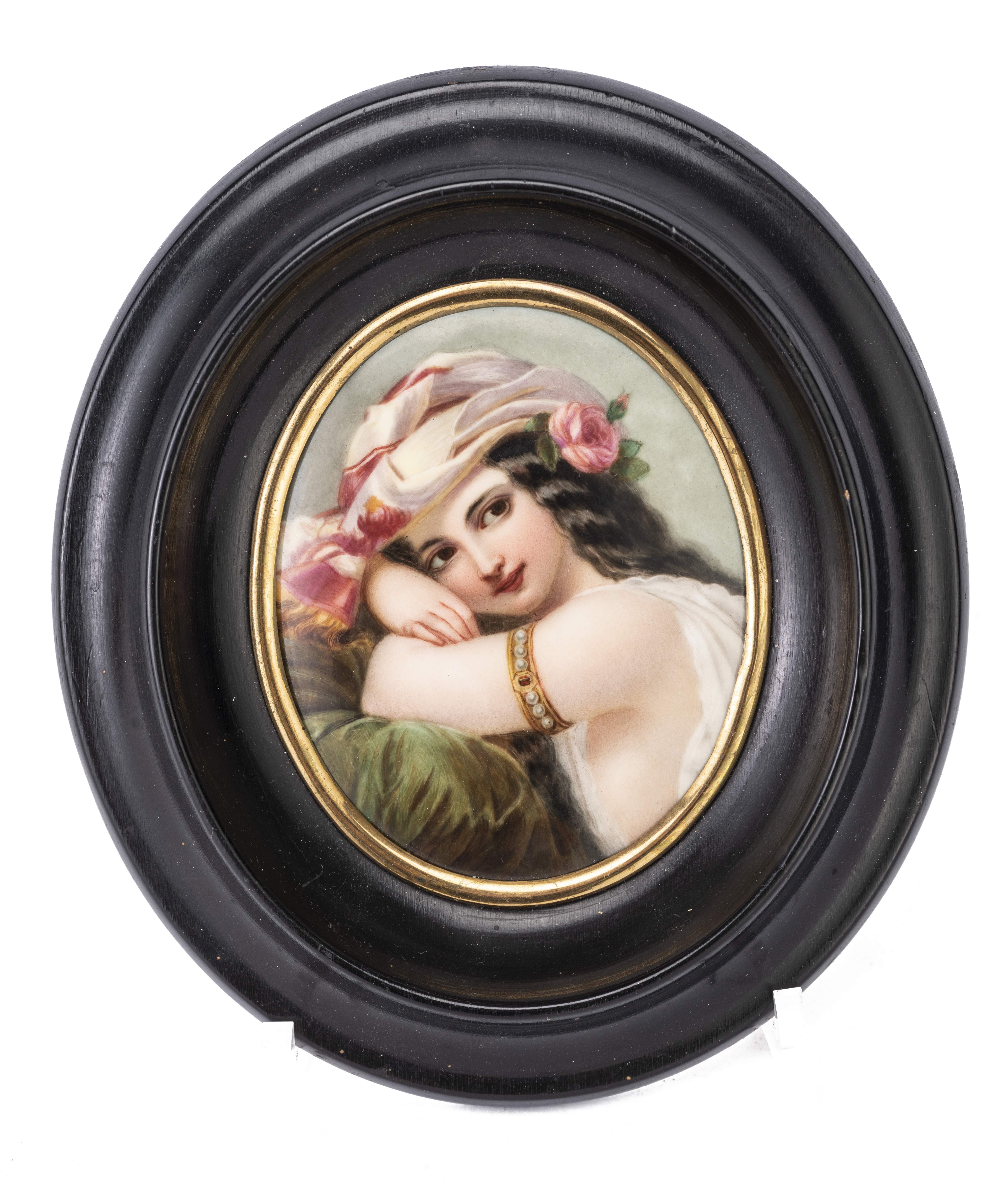 Miniature sur émail d'une jeune Sicilienne au turban et roses dans les cheveux, ns, XIXe.