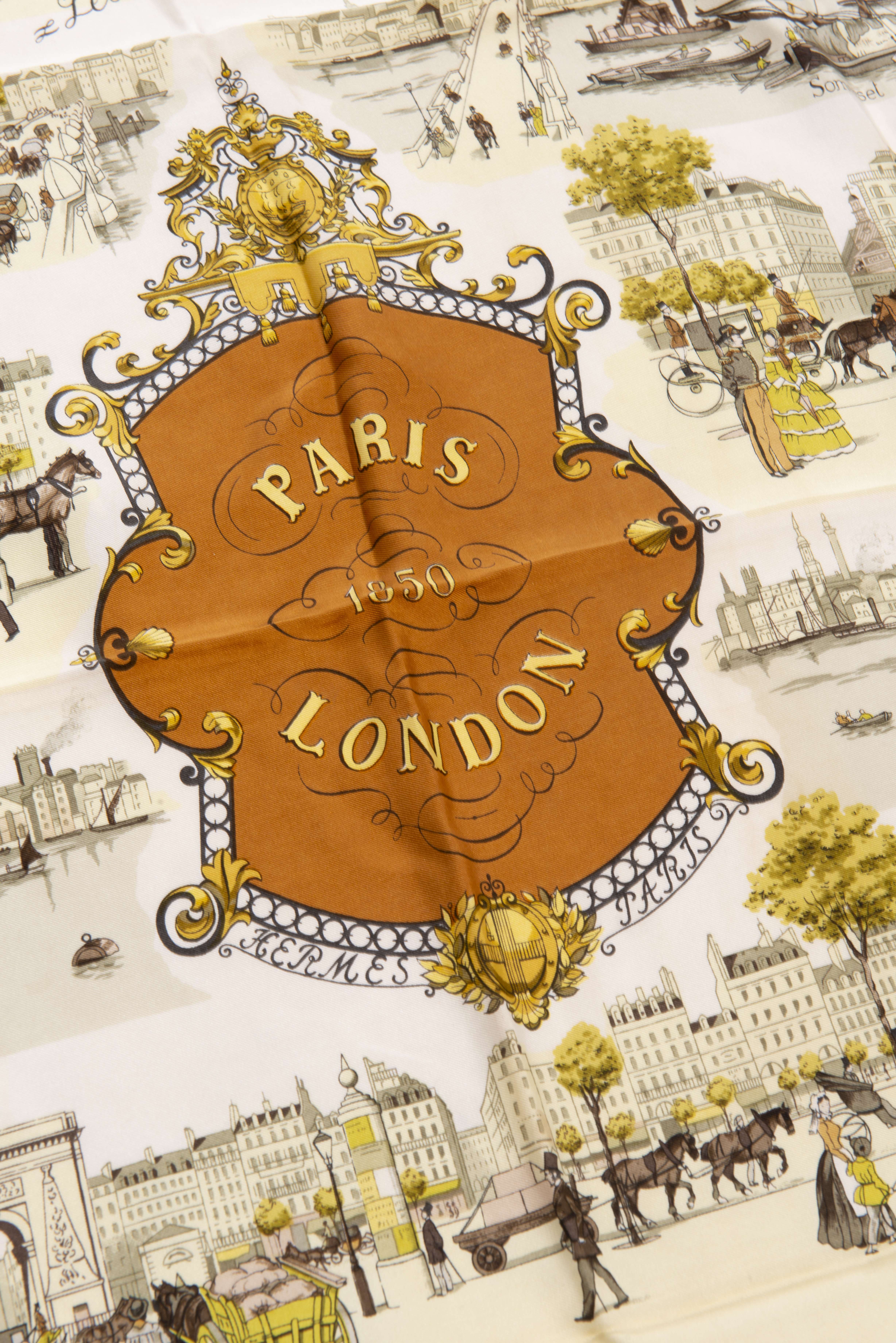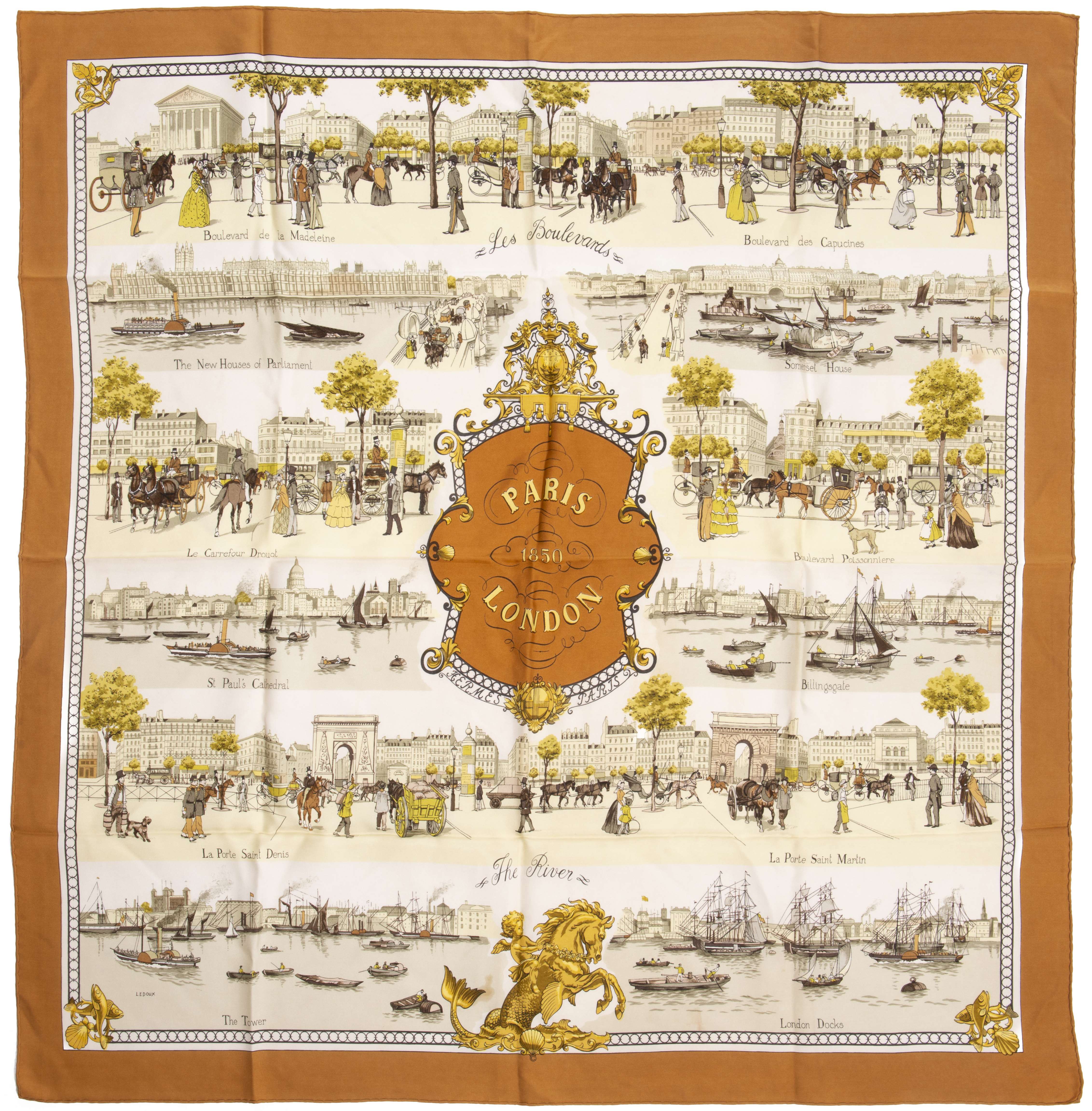 HERMÈS Paris, carré en twill de soie "Paris - London 1850" par Ledoux à bordure beige.