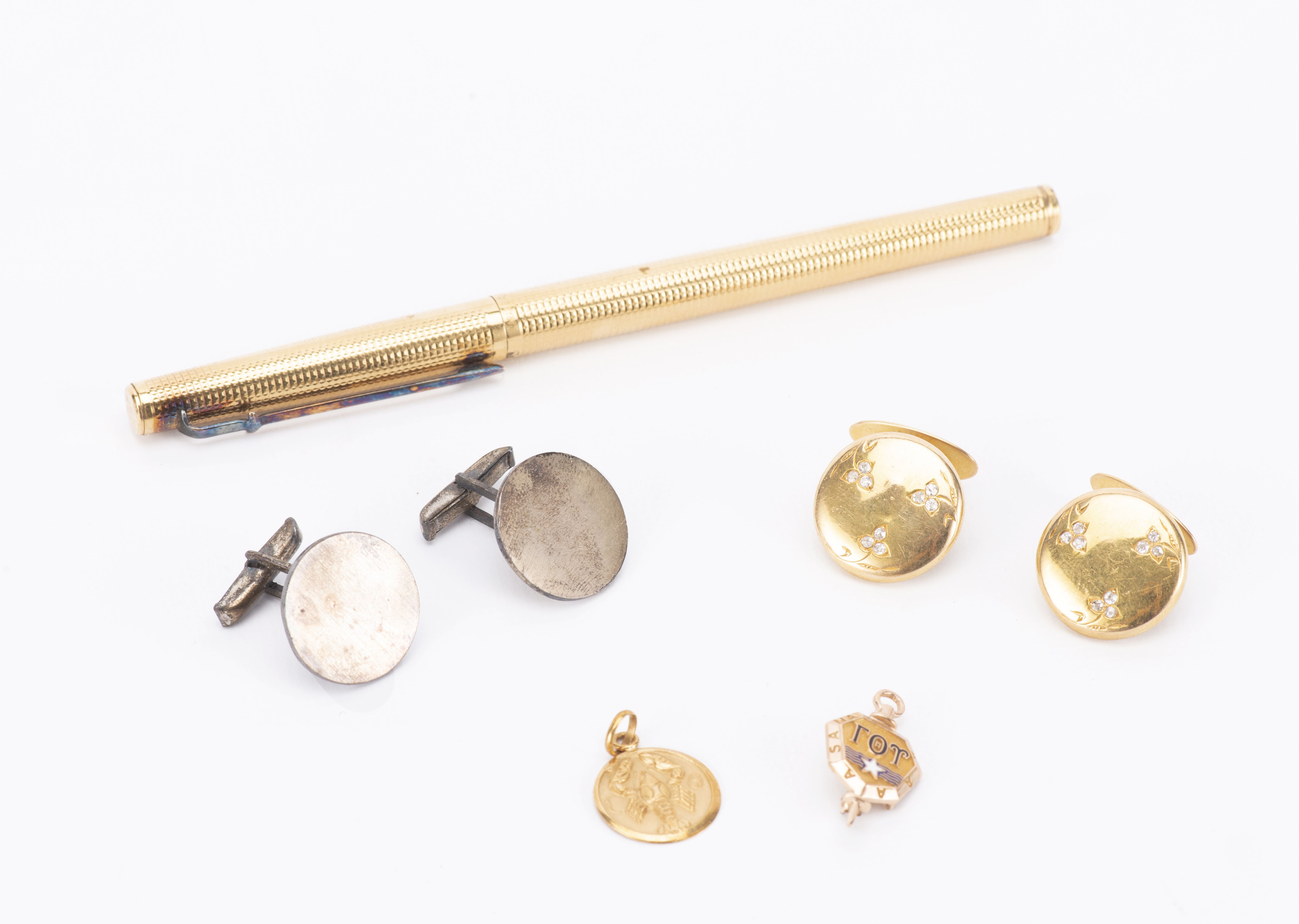 - deux paires de boutons de manchette, dont une en or jaune .750 et brillants et l'autre en argent .925. Diam. 2 cm.