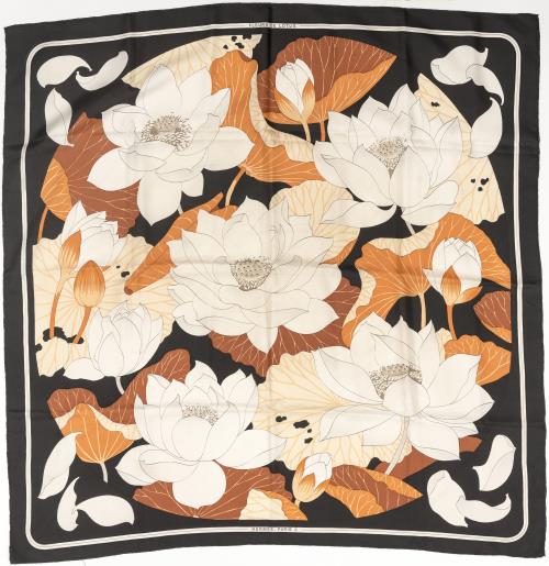 HERMÈS Paris, carré en twill de soie imprimé " Fleurs de Lotus " marge noire, par Christiane Vauzelles édité en 1961, réédité en 1976, puis en 1985.