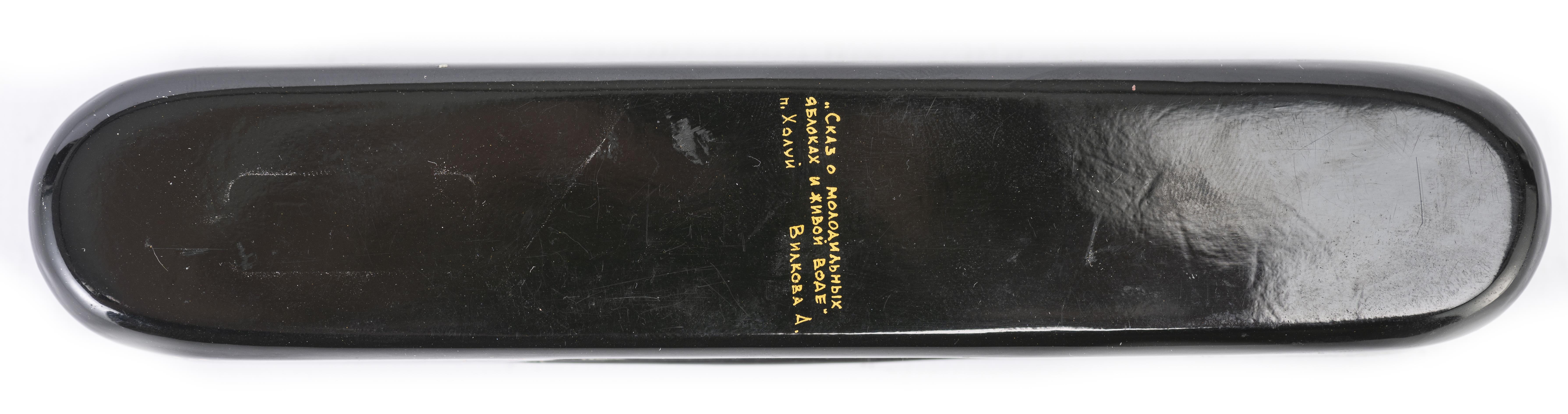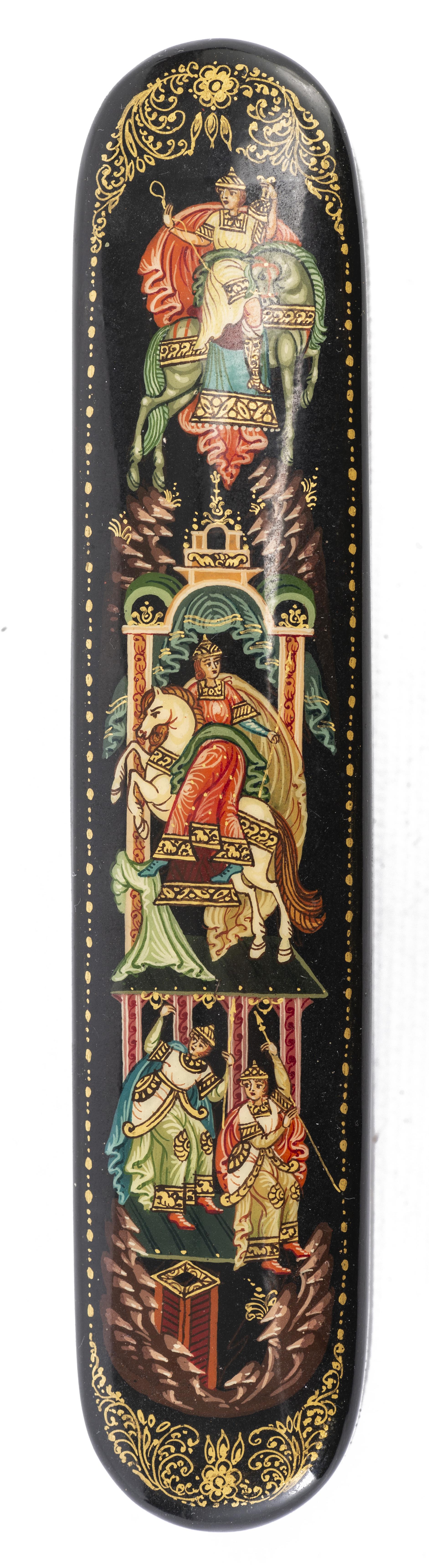 Plumier en laque russe signé sous la base A. Vlakova à décor de cavaliers et de 2 personnages dans une ville.