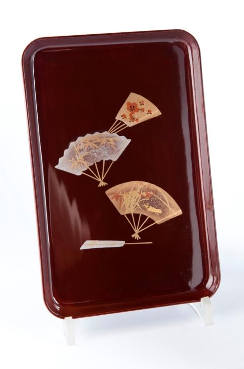 Petit plateau rectangulaire en laque du Japon à décor d'éventails, XXe.