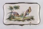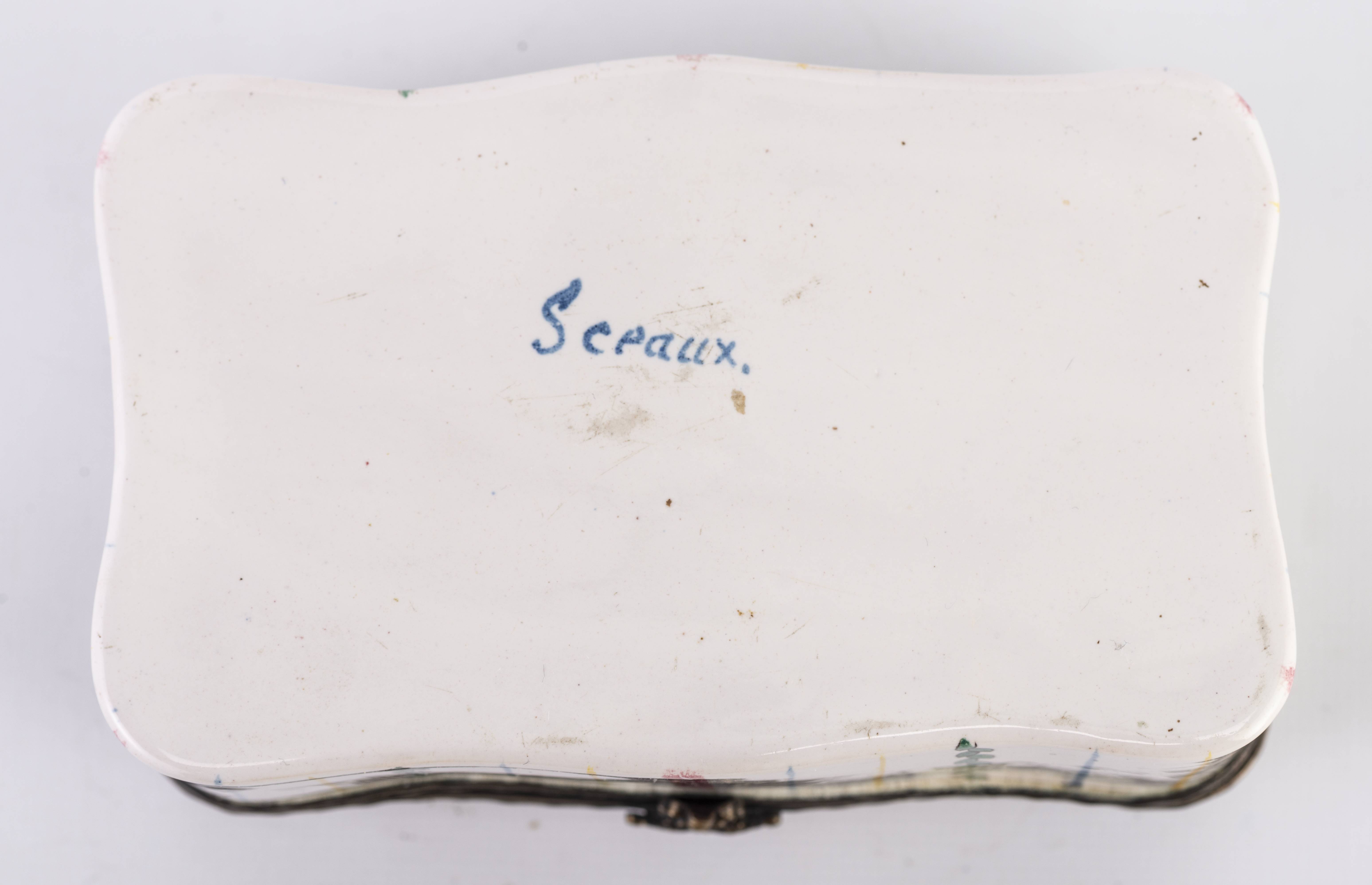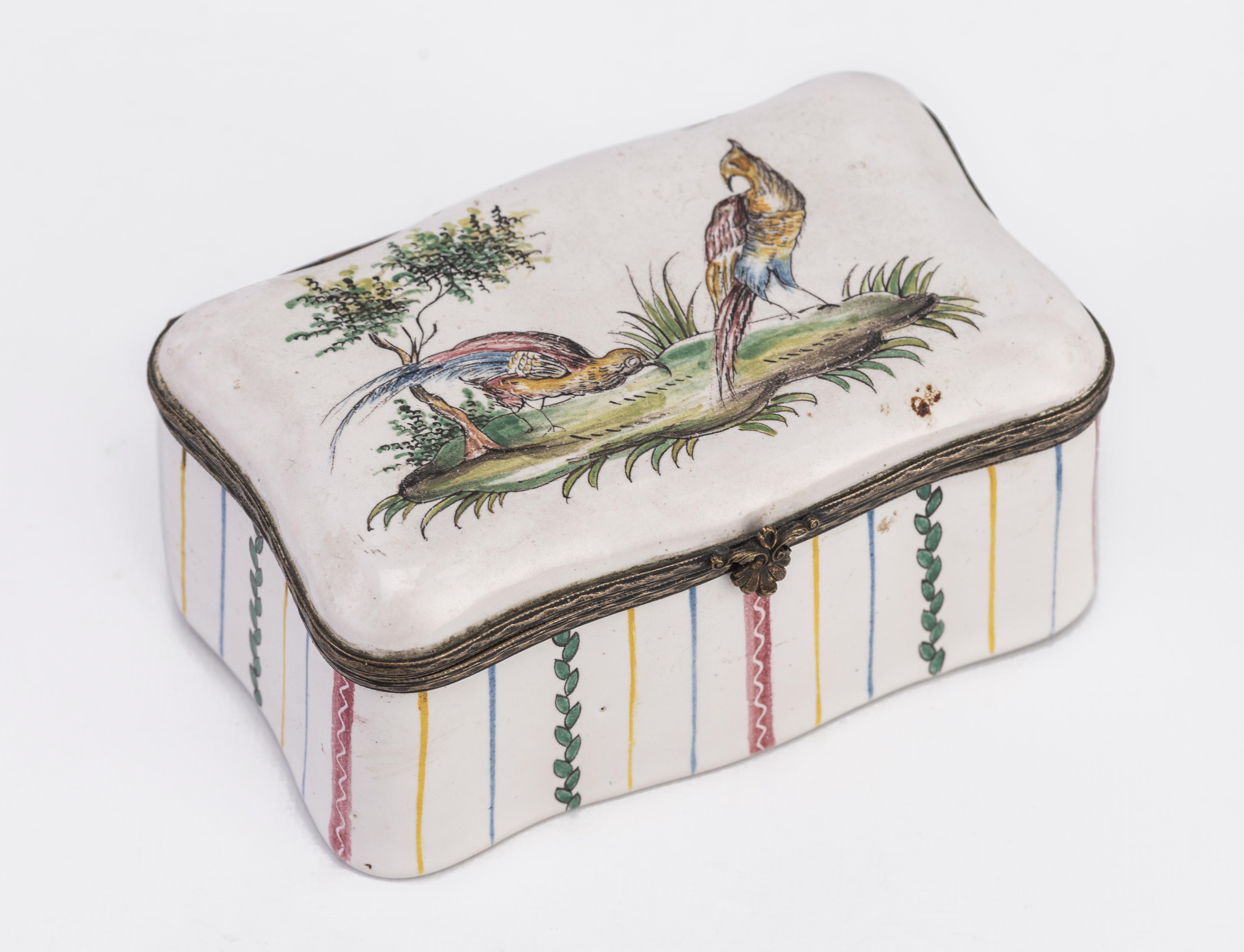 Boîte en faïence de Sceaux à décor, sur le couvercle, de paons, et sur les faces mouvementées, de lignes verticales de couleur.