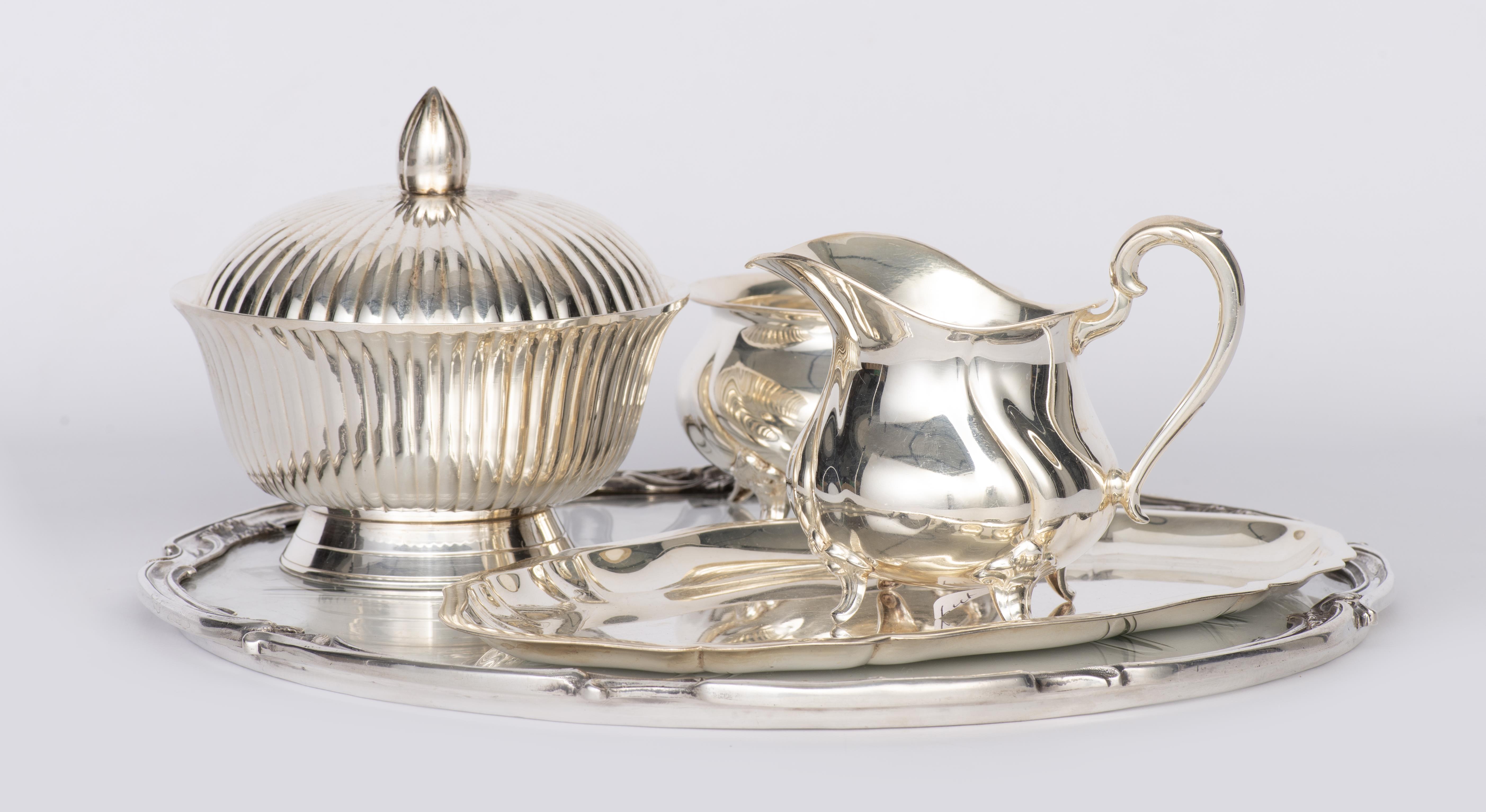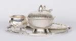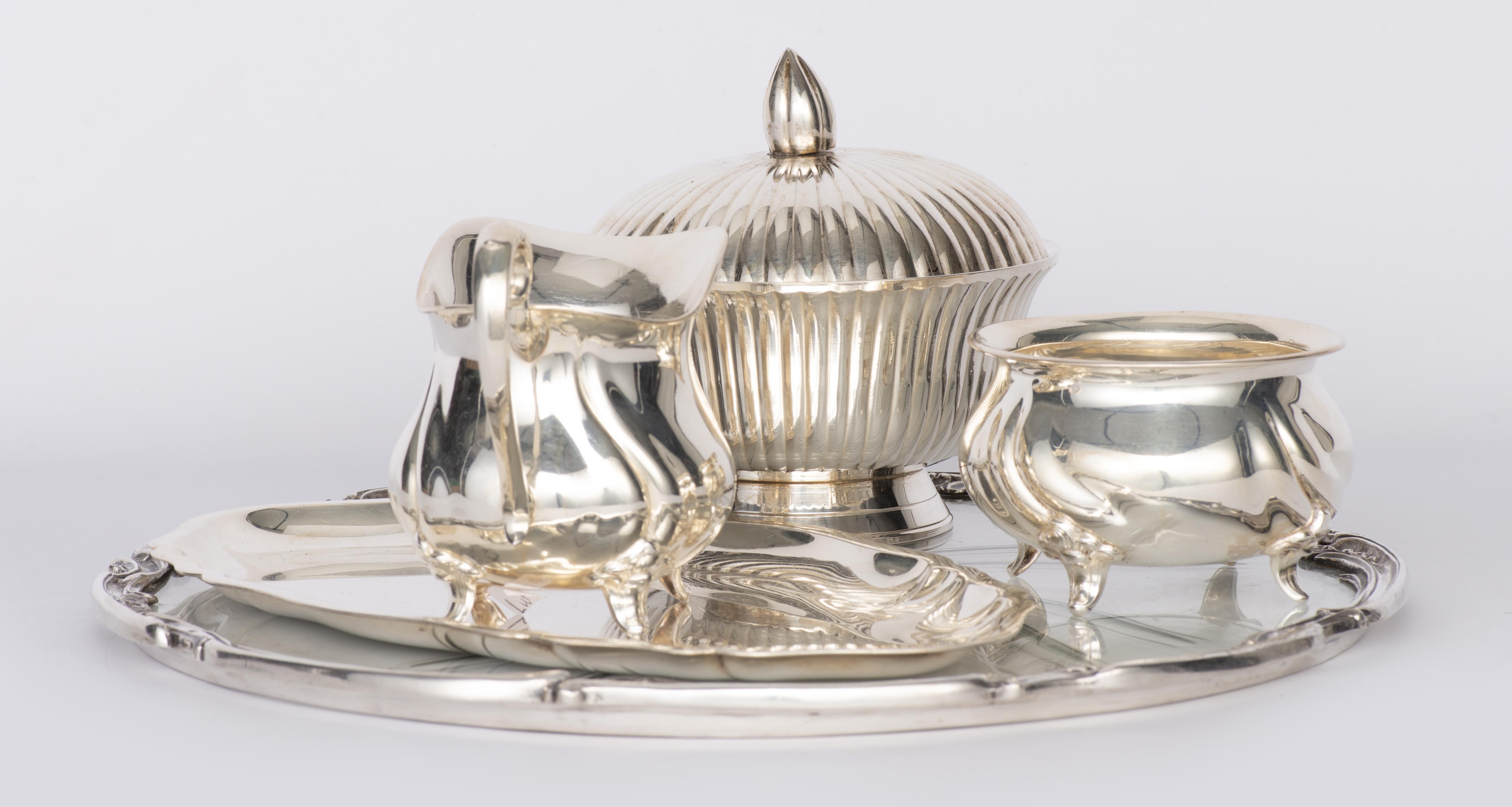 On y joint un plateau en cristal taillé rond avec bordure en argent français 1er titre et un bol et un couvercle à cannelures en métal argenté.
