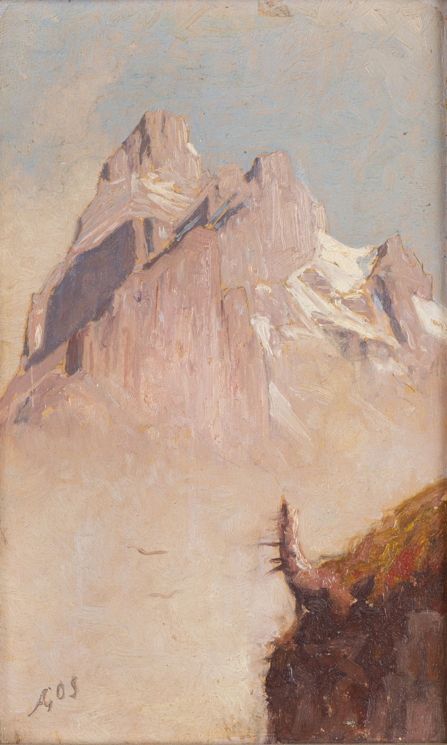 Albert GOS, (1852-1942), "Pic en Valais", huile sur bois signé en bas à gauche A. Gos.