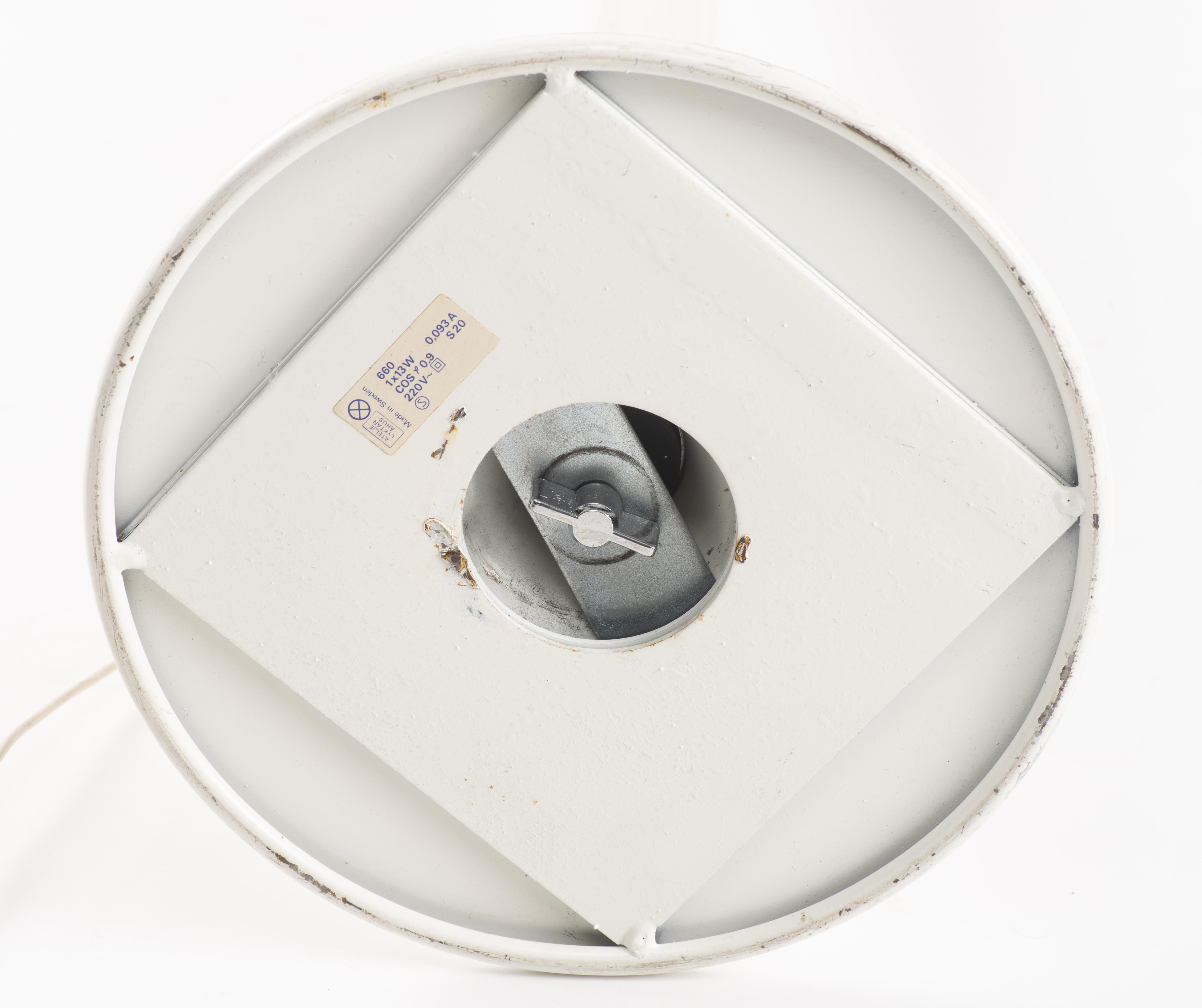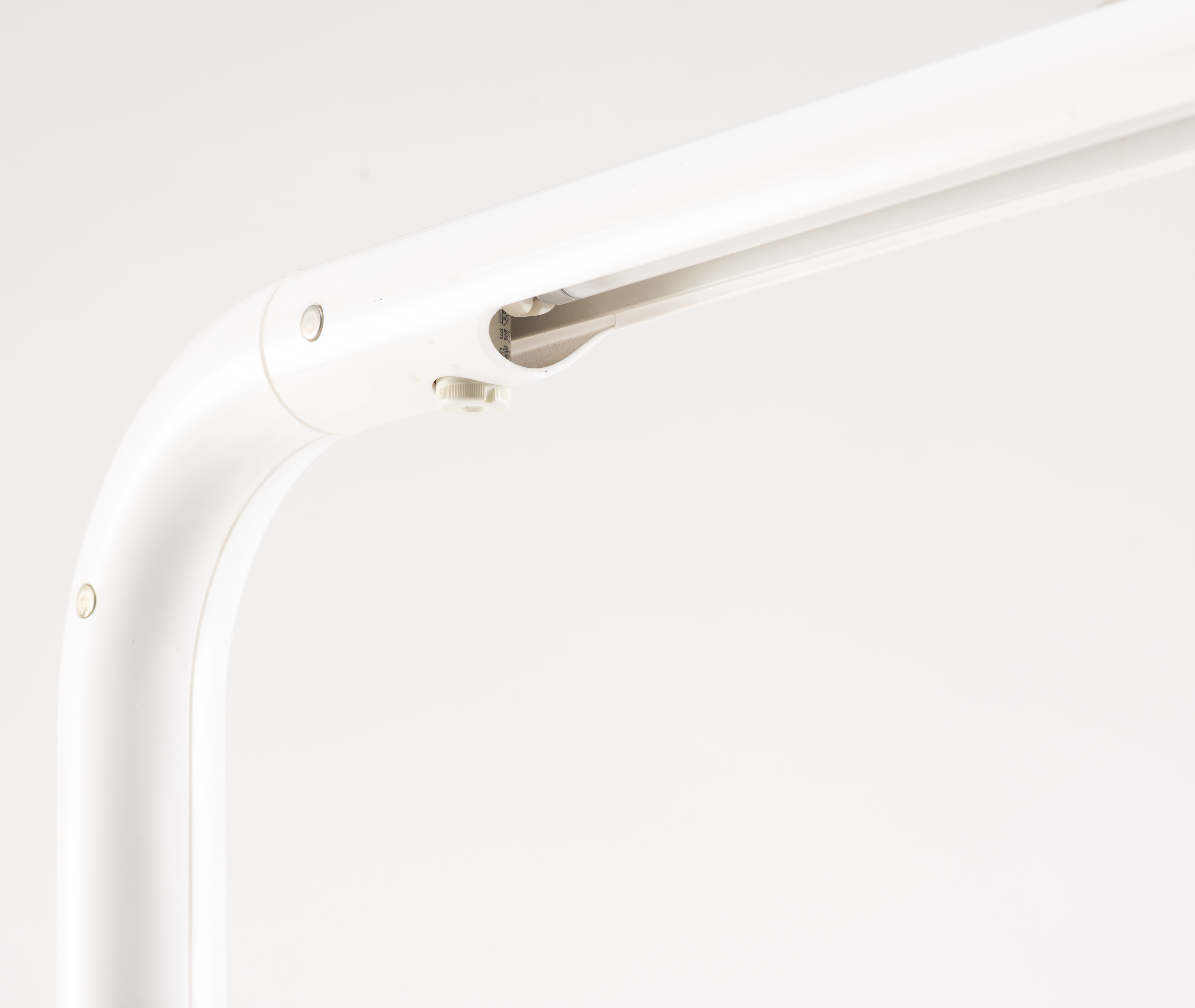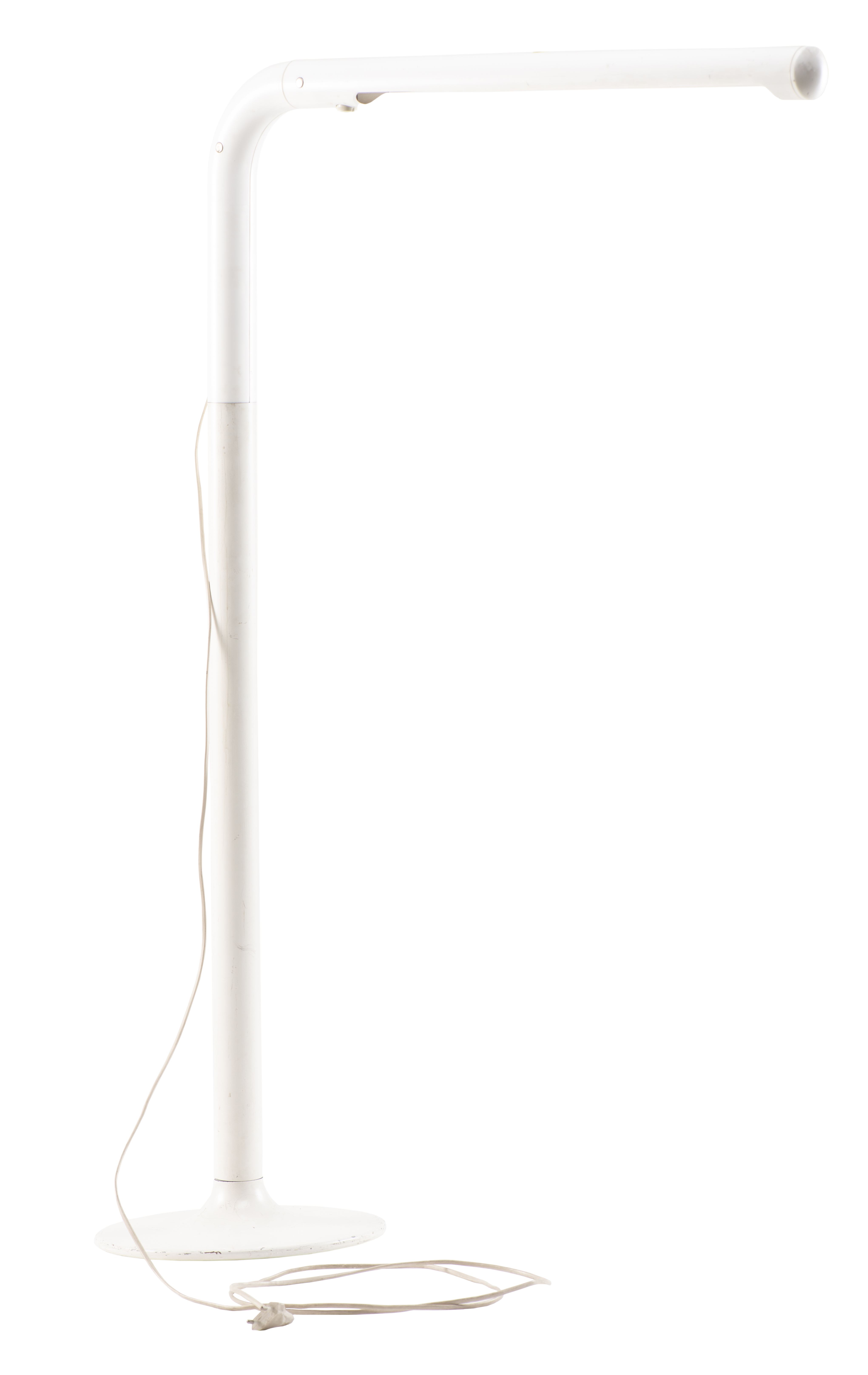 Anders Pehrson lampe de lecture tube par Anders Pehrson pour Ateljé Lyktan, Åhus (Ateljer Lyktan-Ahus) en métal et plastique laqué blanc orientable avec un éclairage par tube lumineux fluorescent ou luminescent, Suède création de 1973.