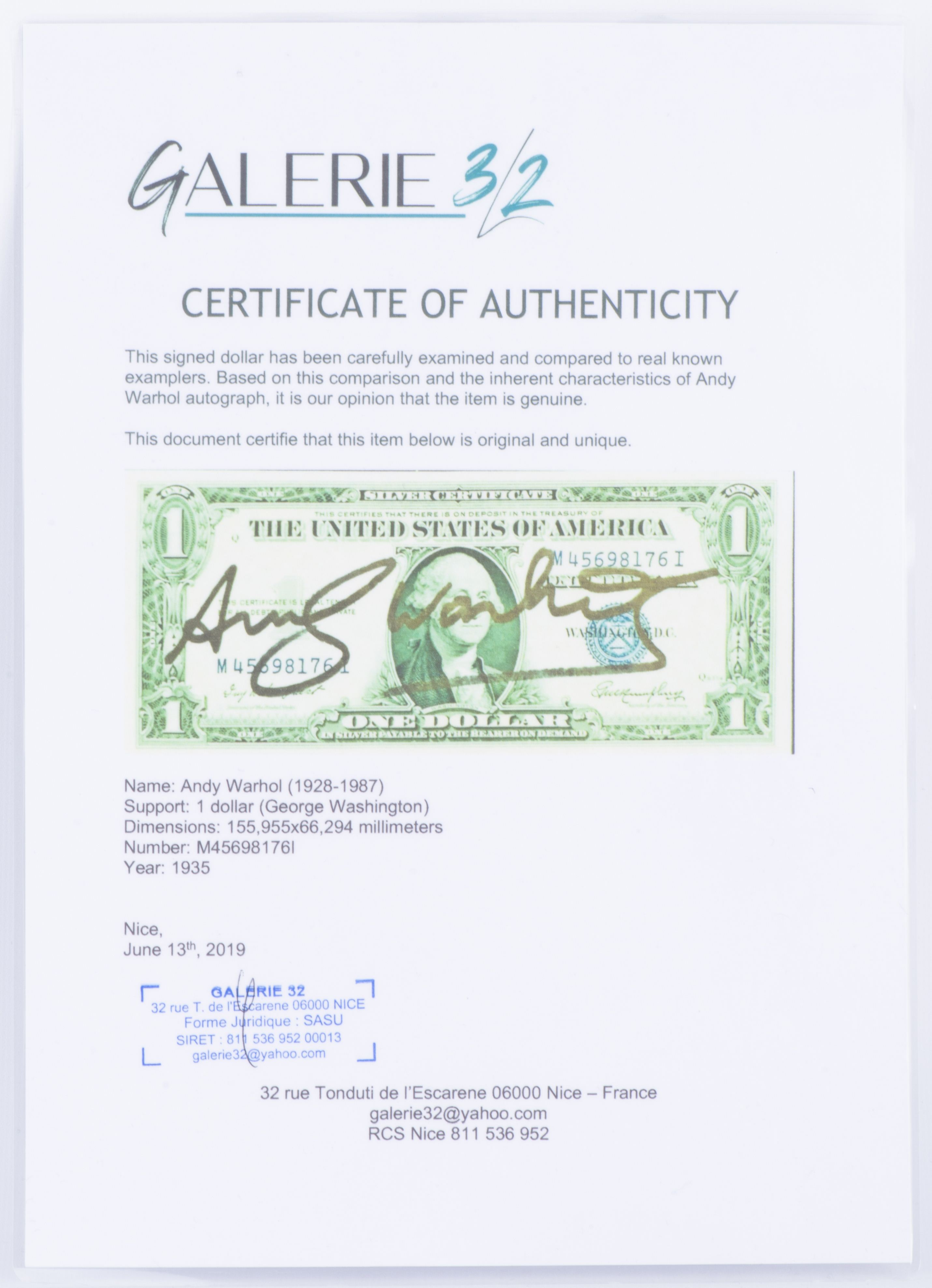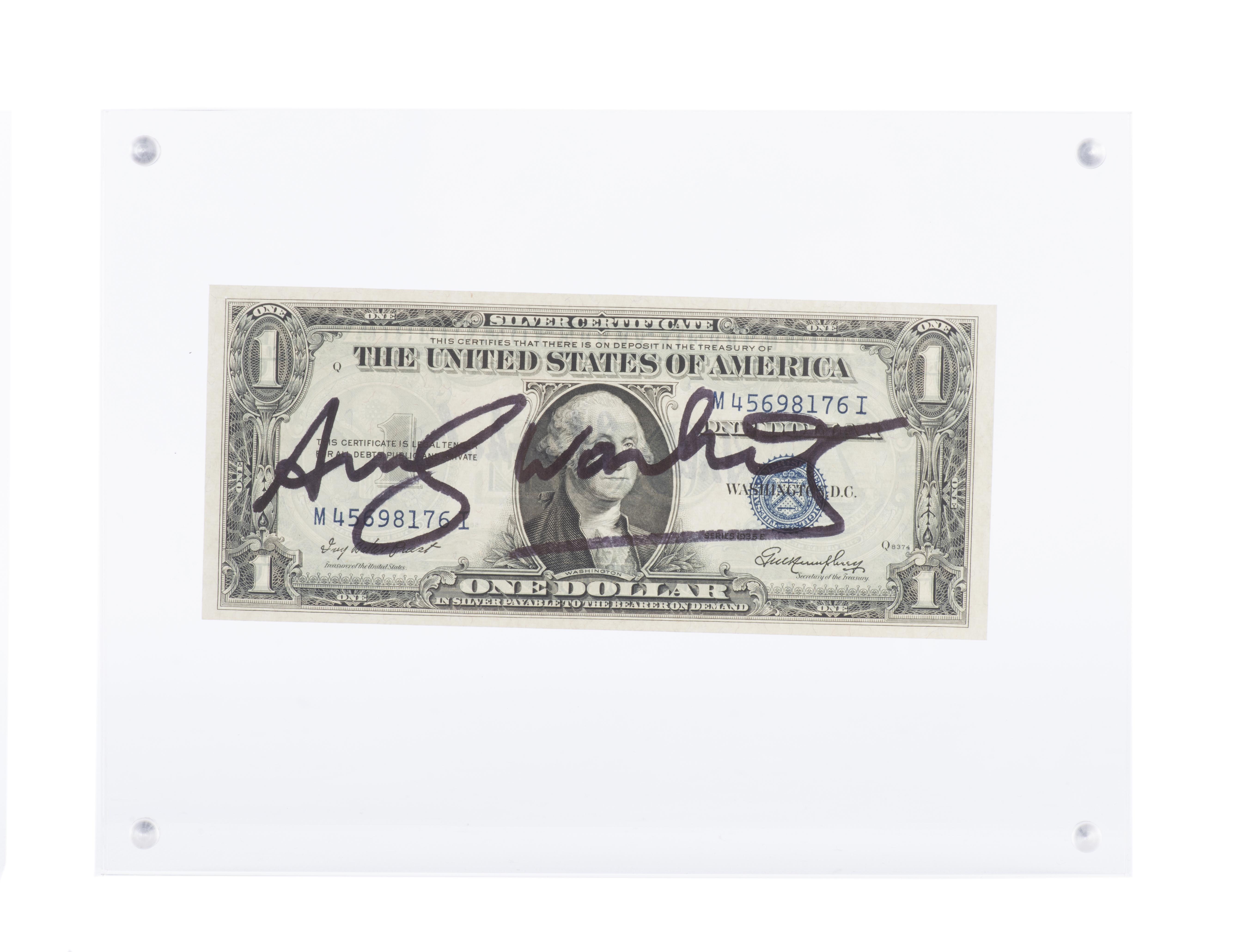 Andy WARHOL, billet de 1 $ des USA, représentant Georges Washington timbré et datant de 1935, numéro M45698176l signé par Andy Warhol en 1976.