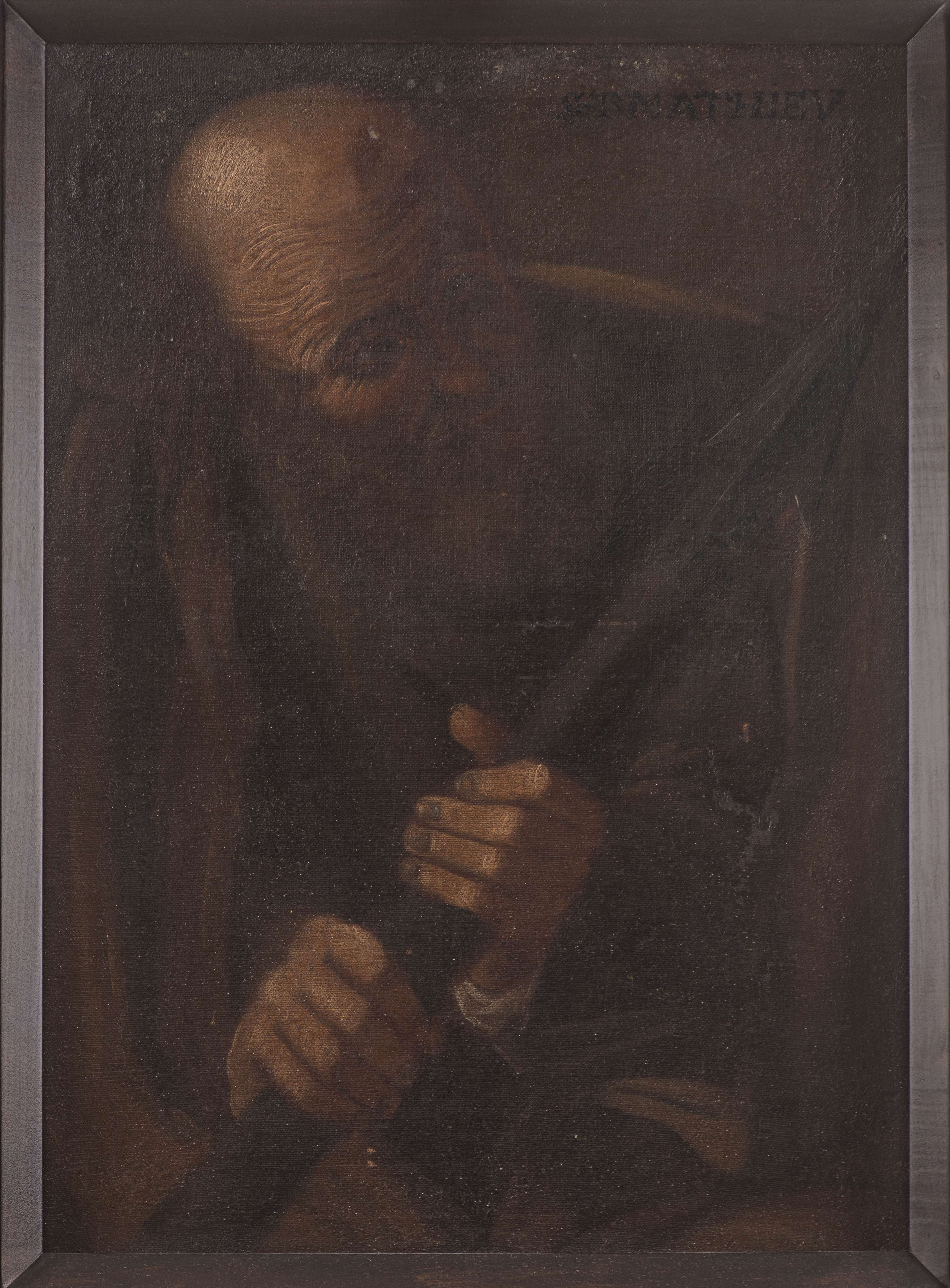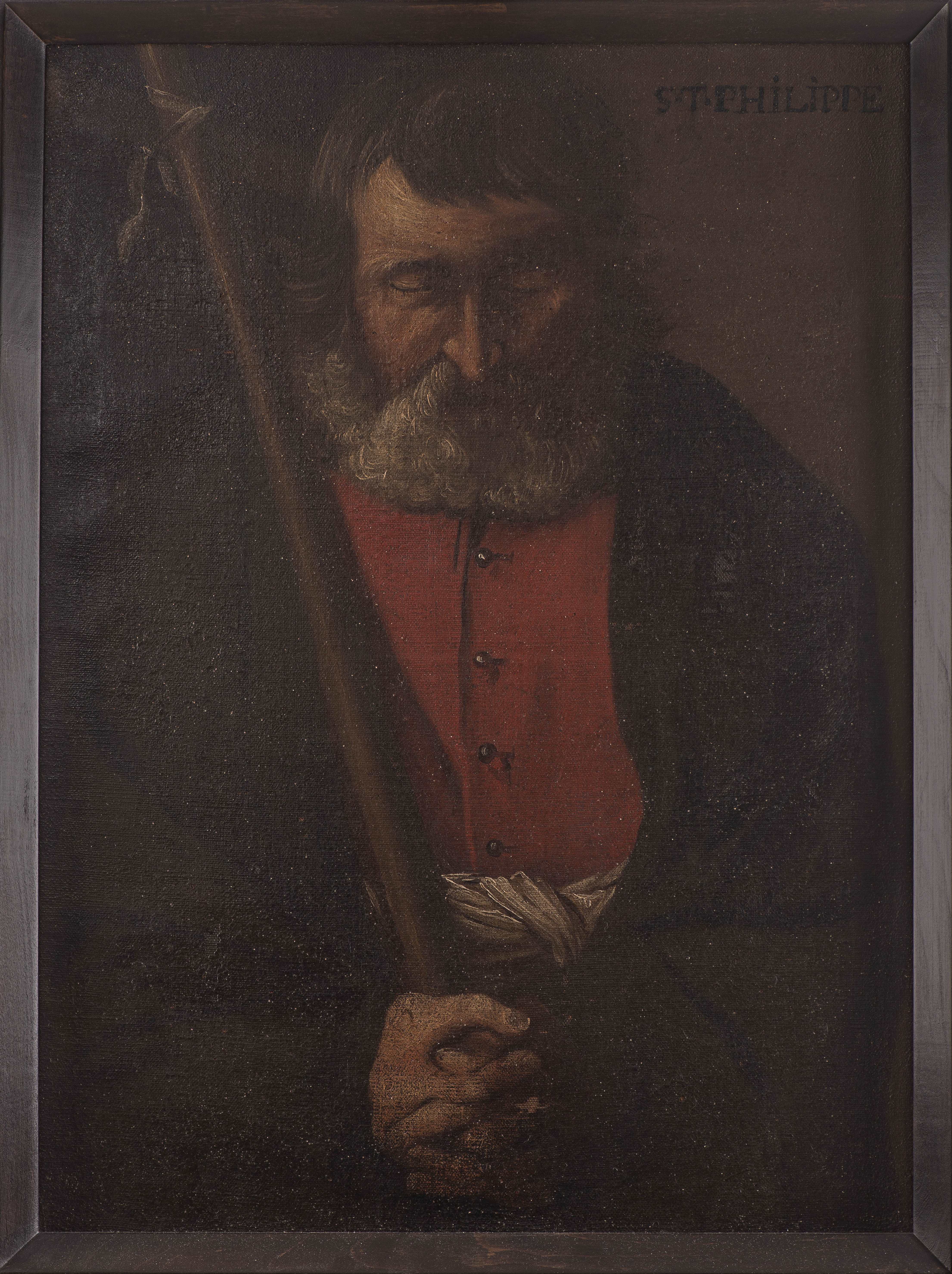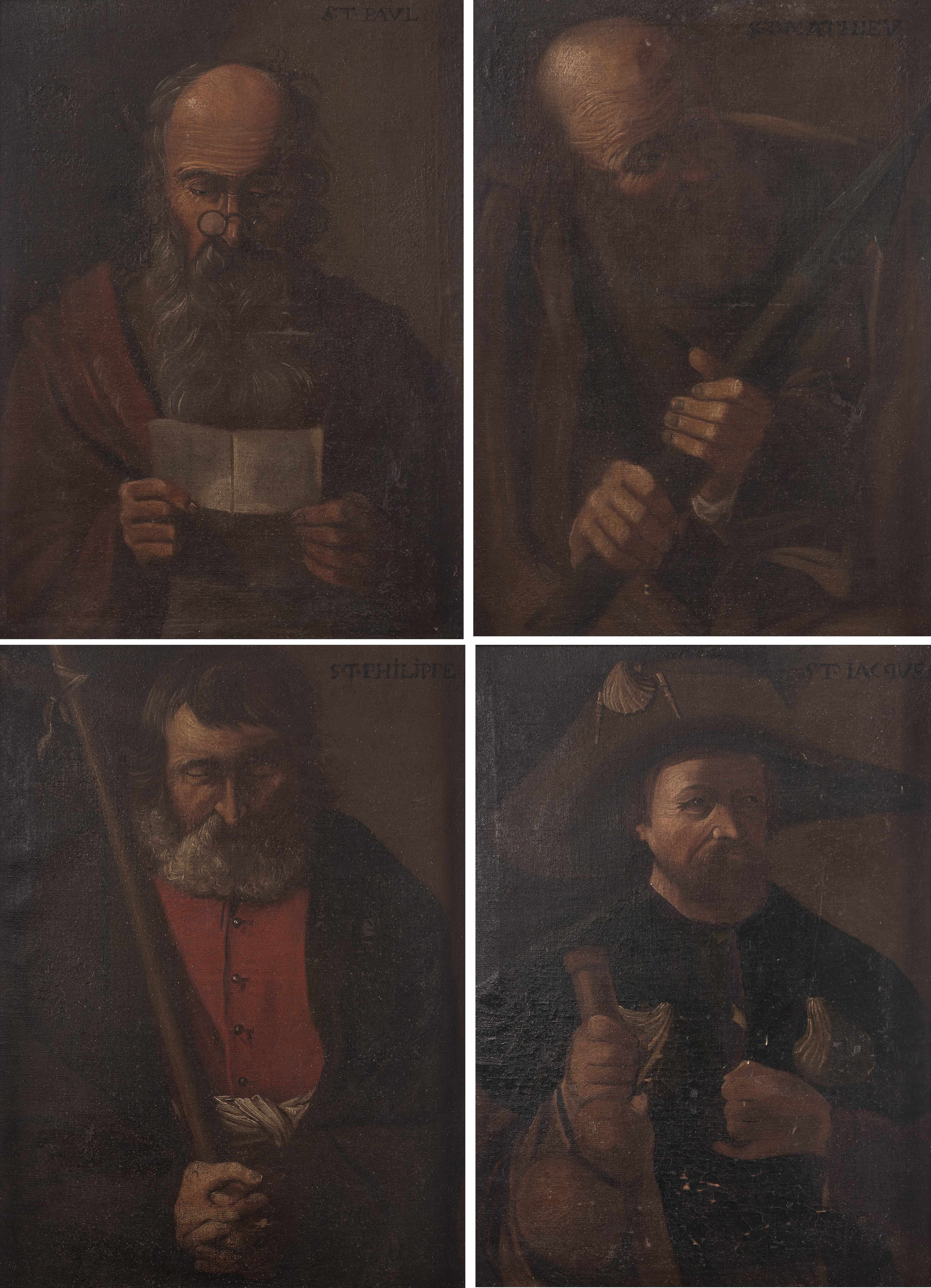 Anonyme (XIXe), "Quatre portraits : Saint Paul, Saint Jacques, Saint Philippe et Saint Mathieu", 4 huiles sur toiles collées sur panneau, probablement fragments de toiles à figures en pied, avec inscriptions récentes des noms des saints en hd.