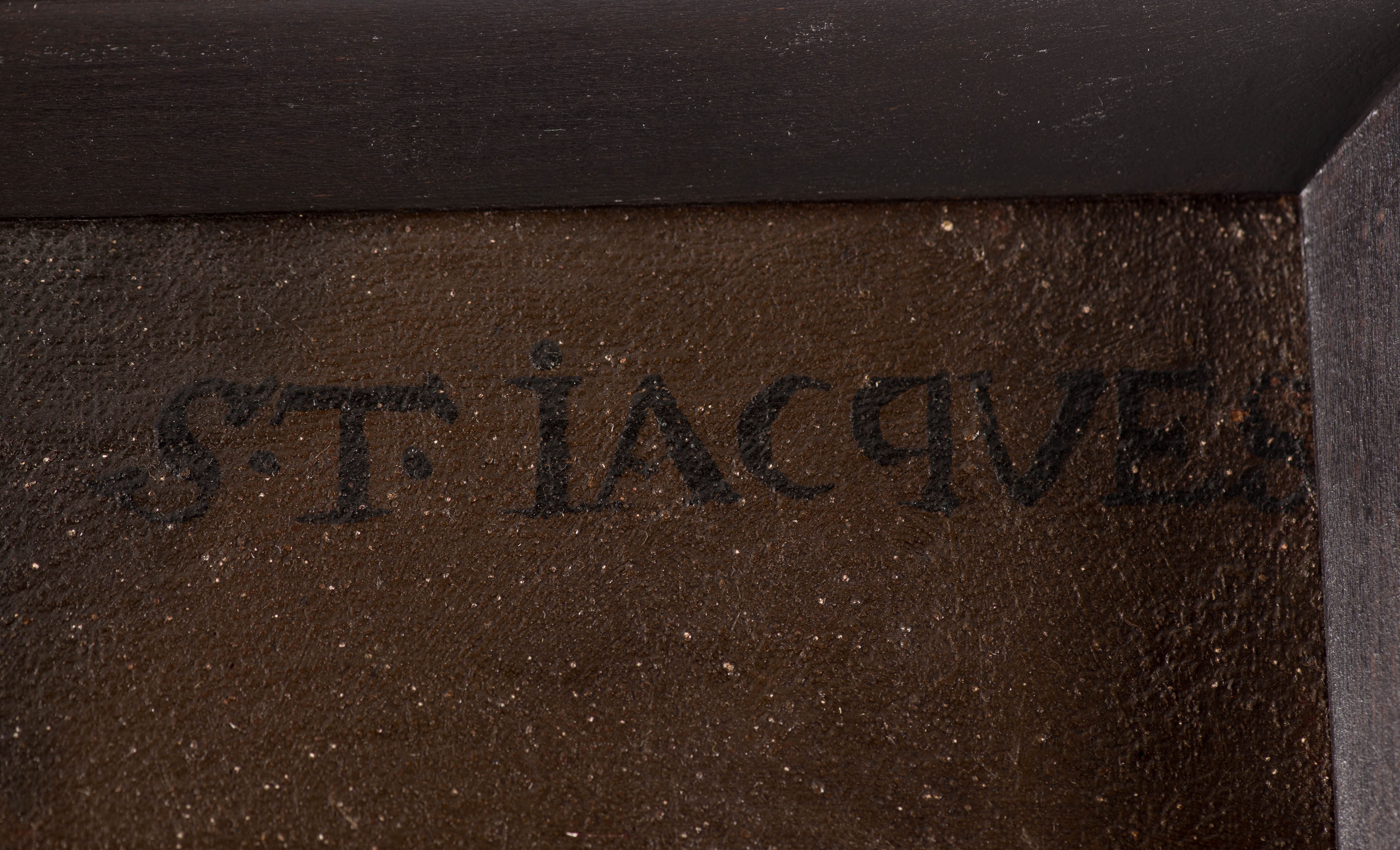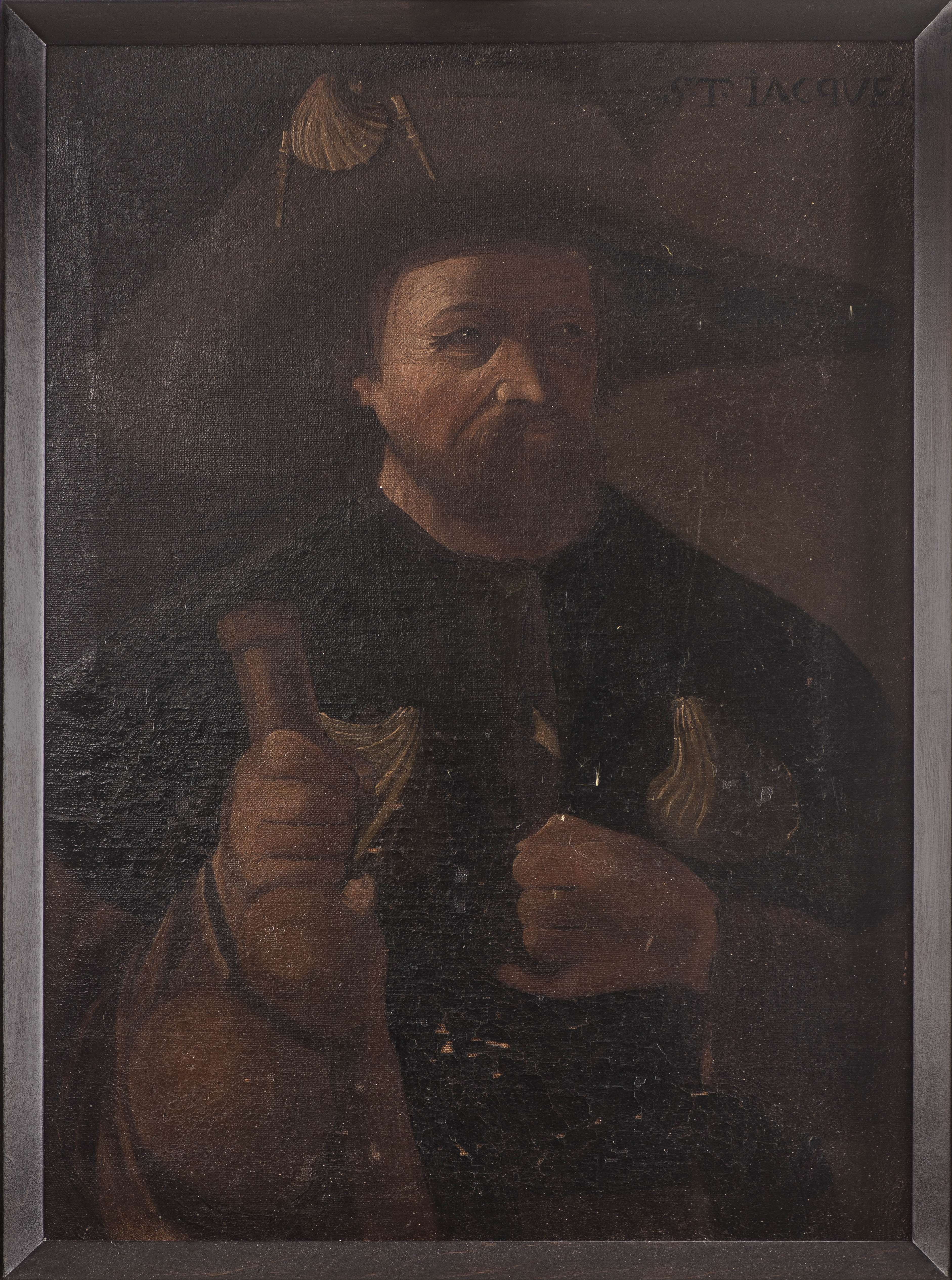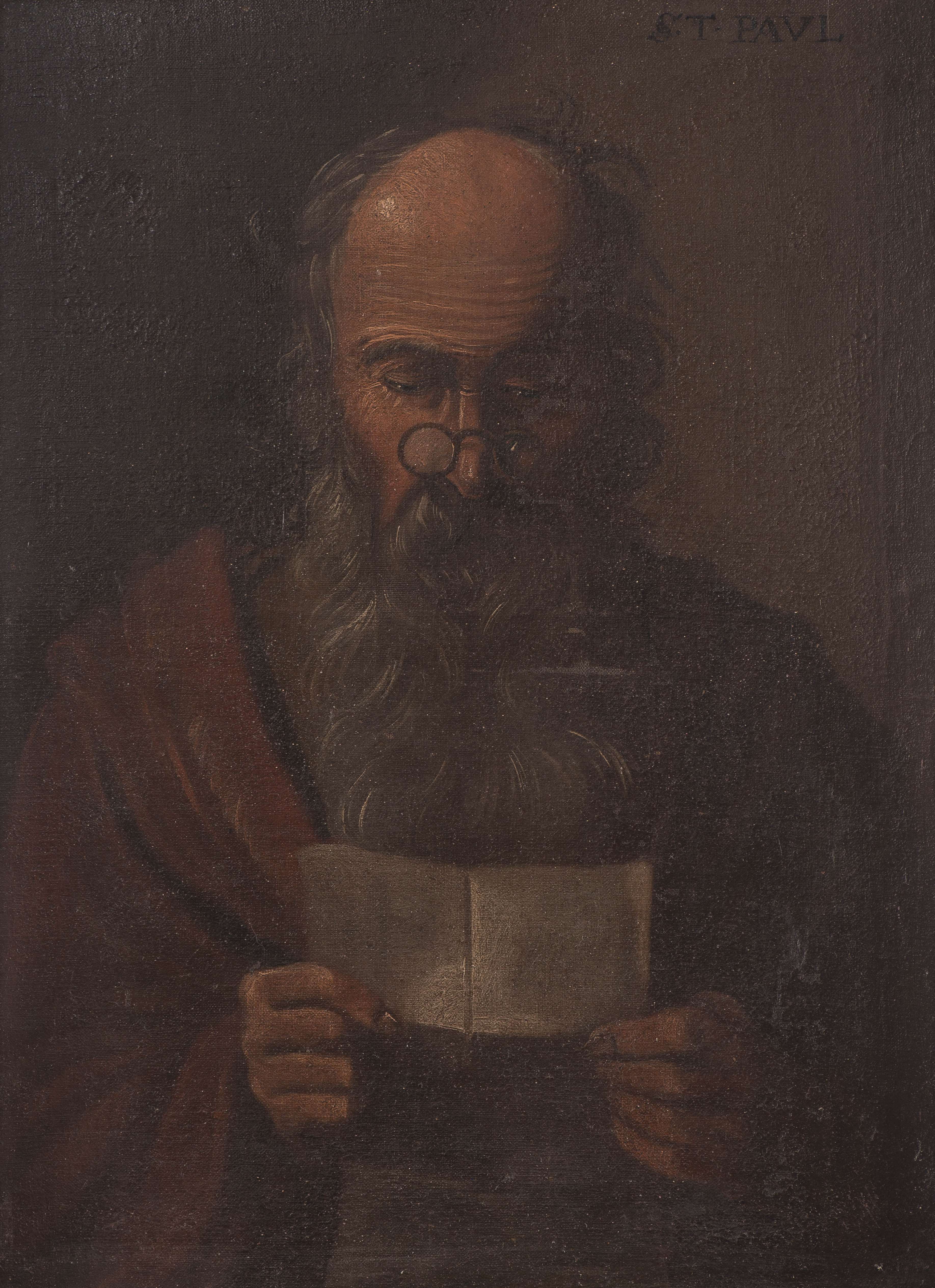 Anonyme (XIXe), "Quatre portraits : Saint Paul, Saint Jacques, Saint Philippe et Saint Mathieu", 4 huiles sur toiles collées sur panneau, probablement fragments de toiles à figures en pied, avec inscriptions récentes des noms des saints en hd.
