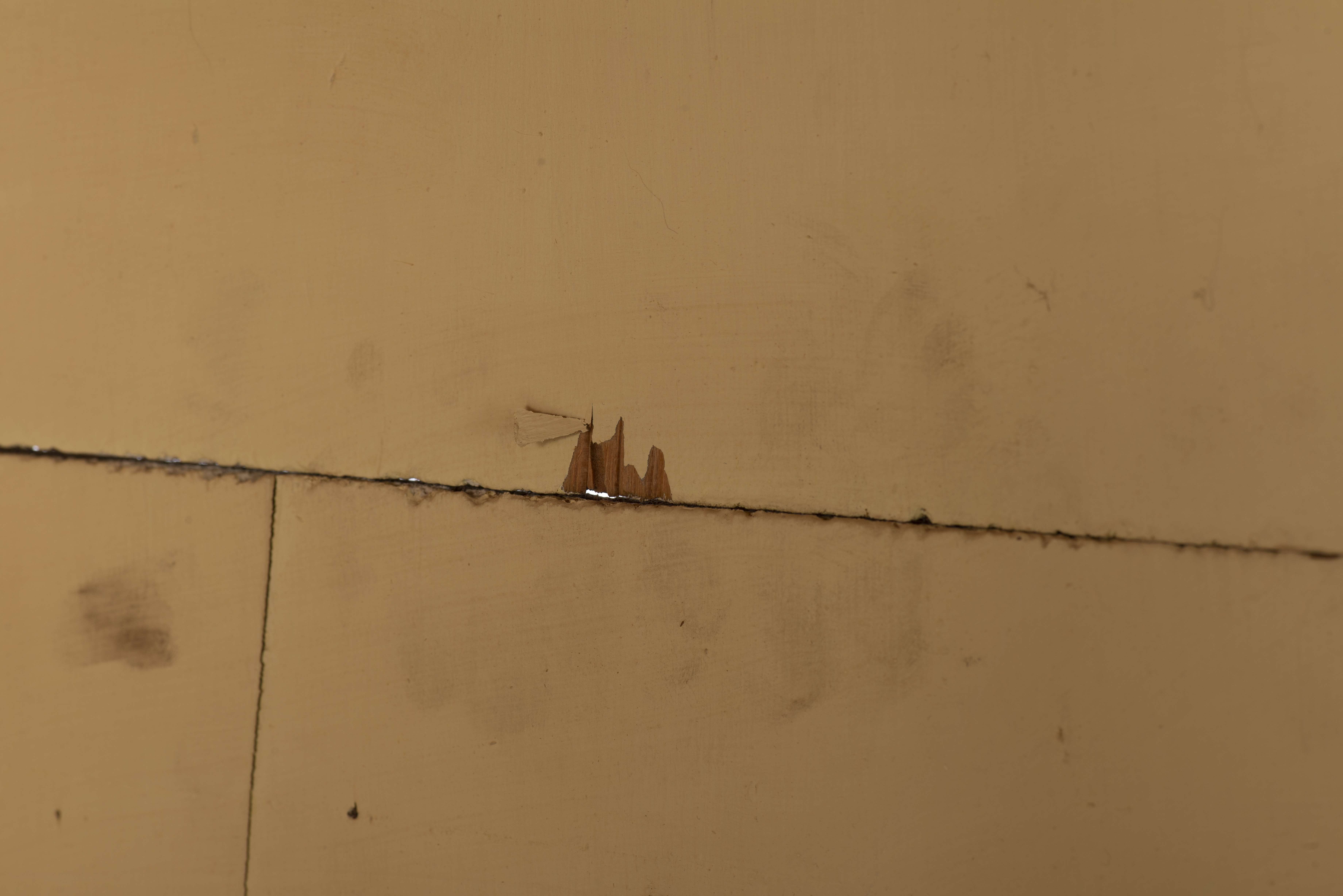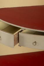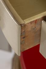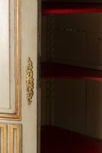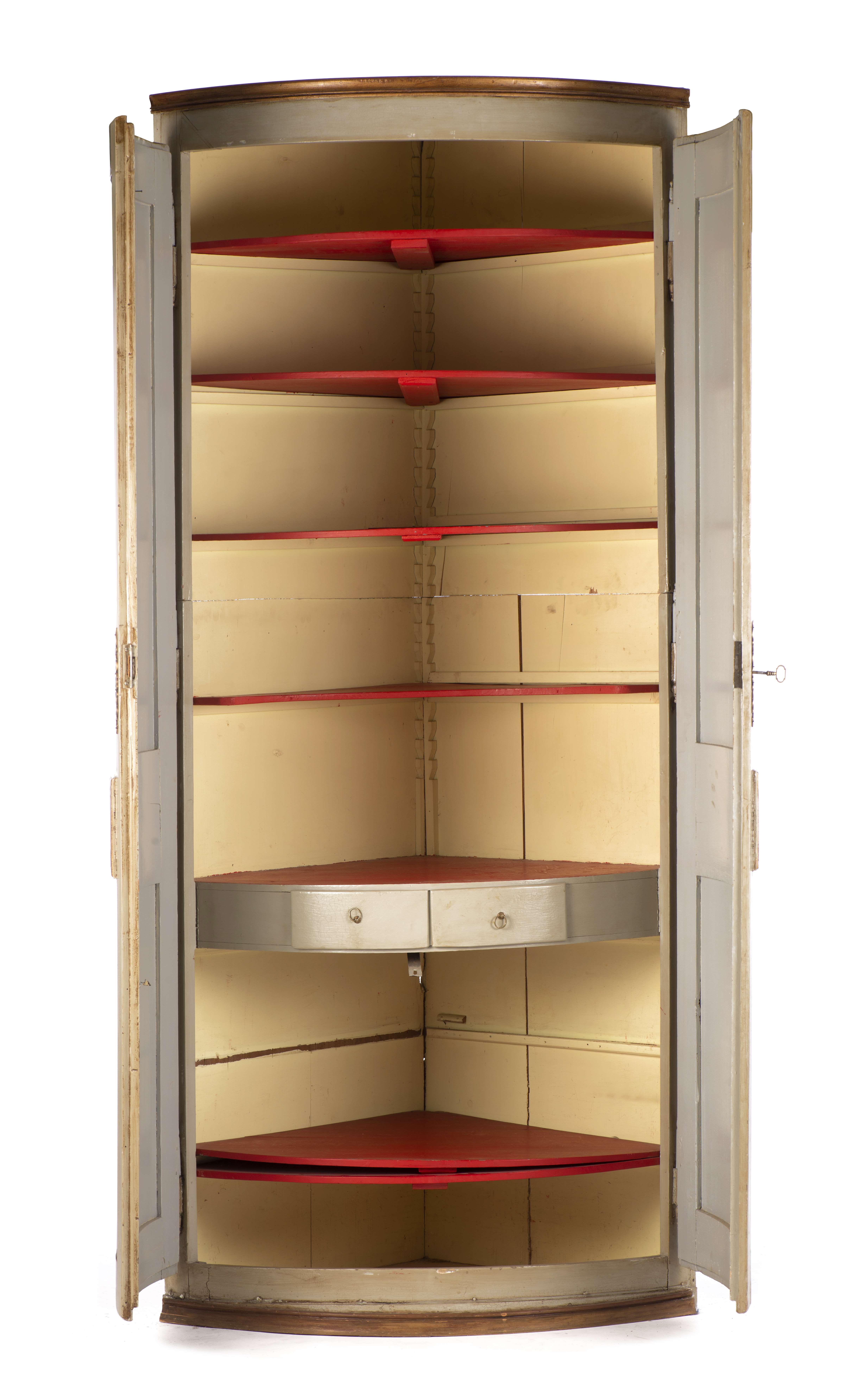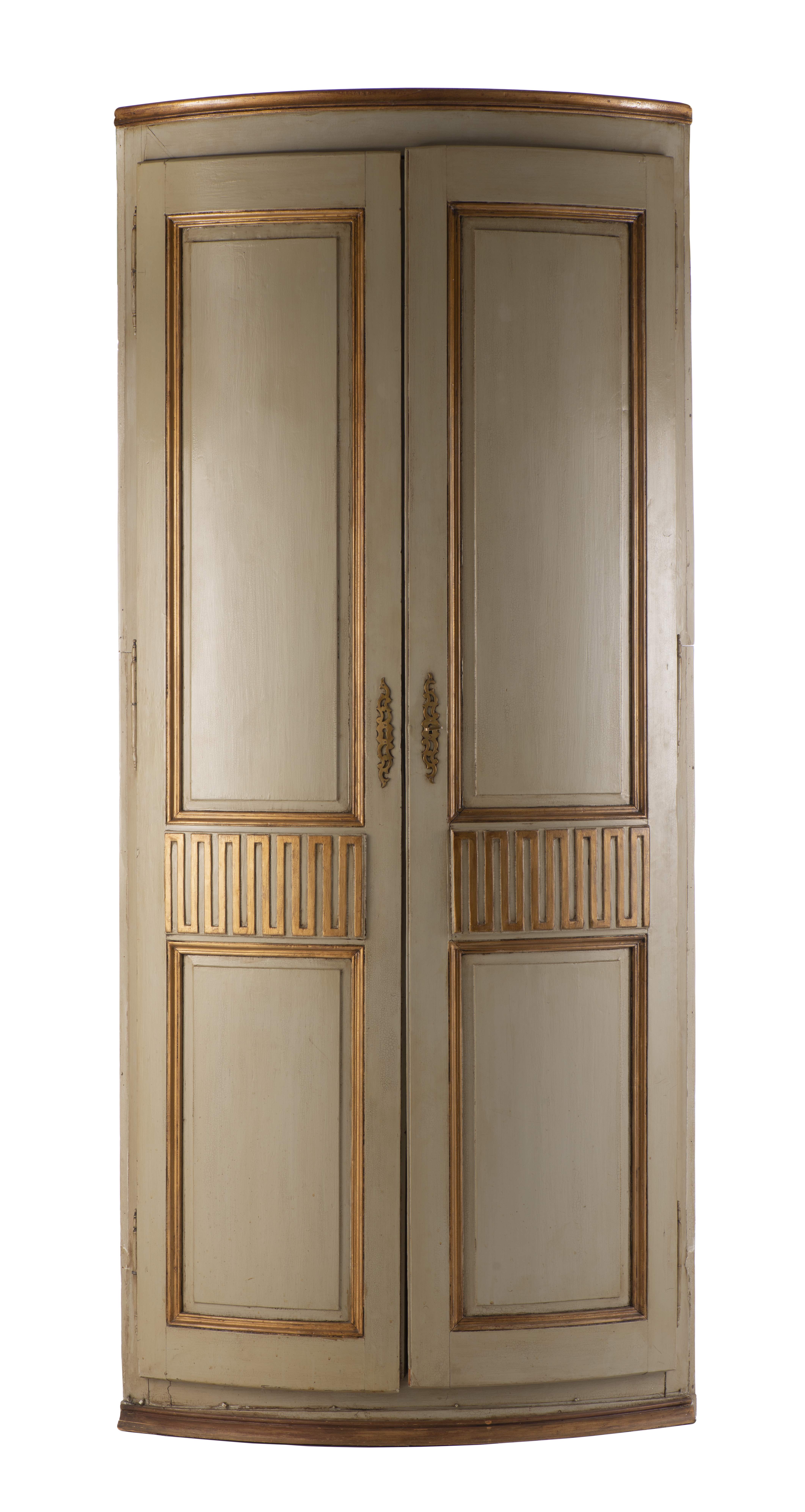 Armoire d'angle en quart de cercle, sapin peint gris et or