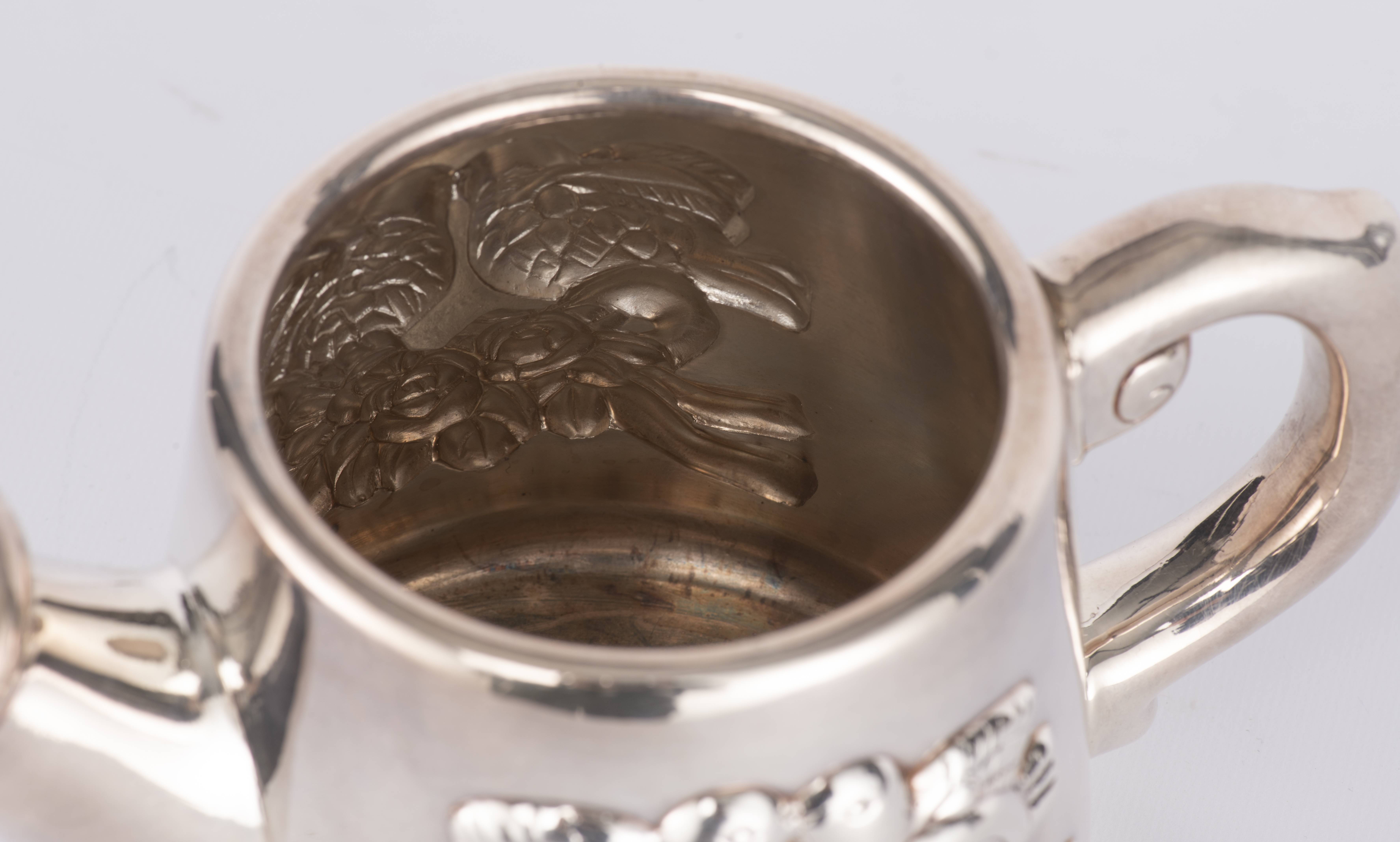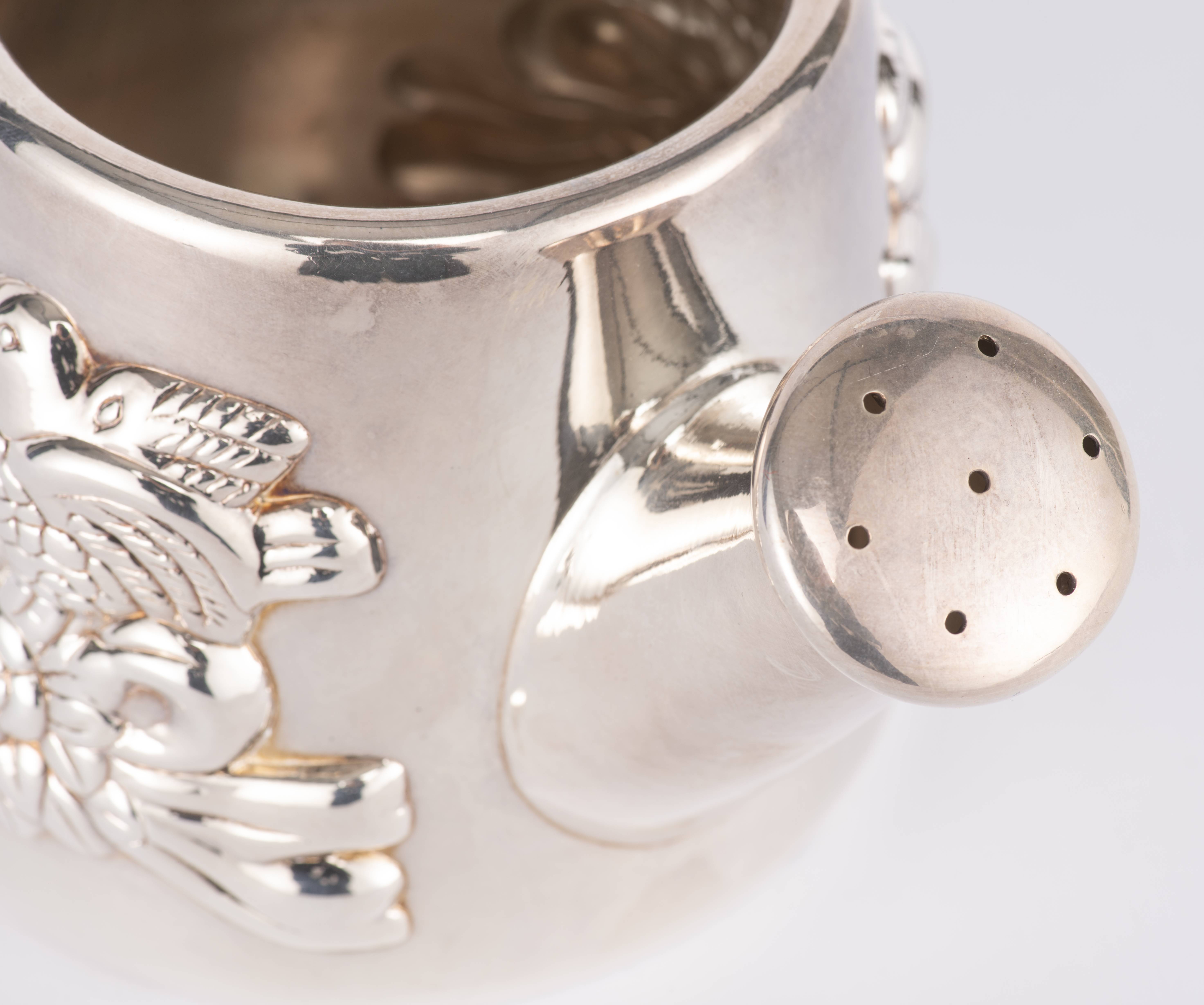 Arrosoir en argent .925 de Florence à décor en repoussé de deux oiseaux sur une gerbe de fleurs.
