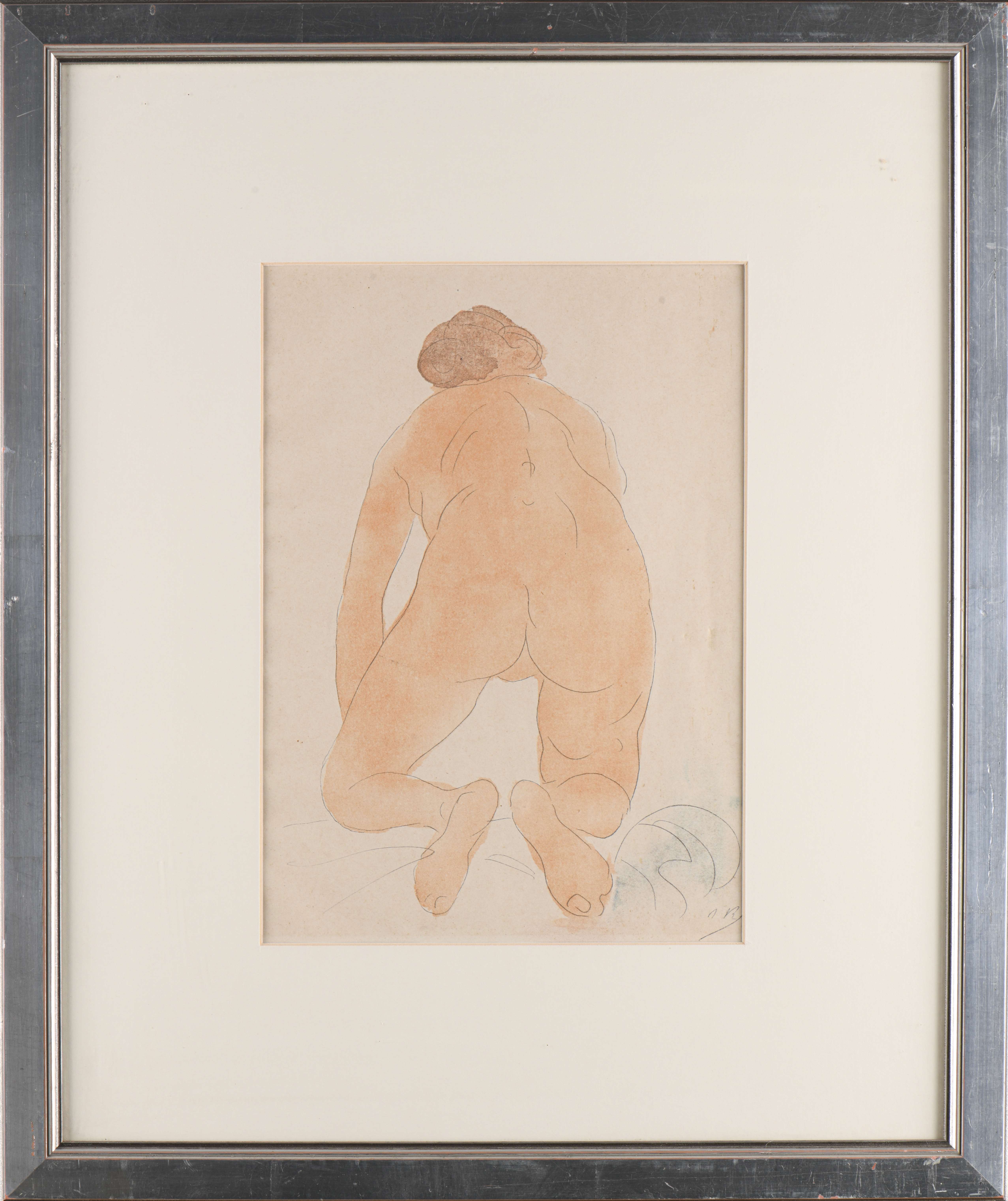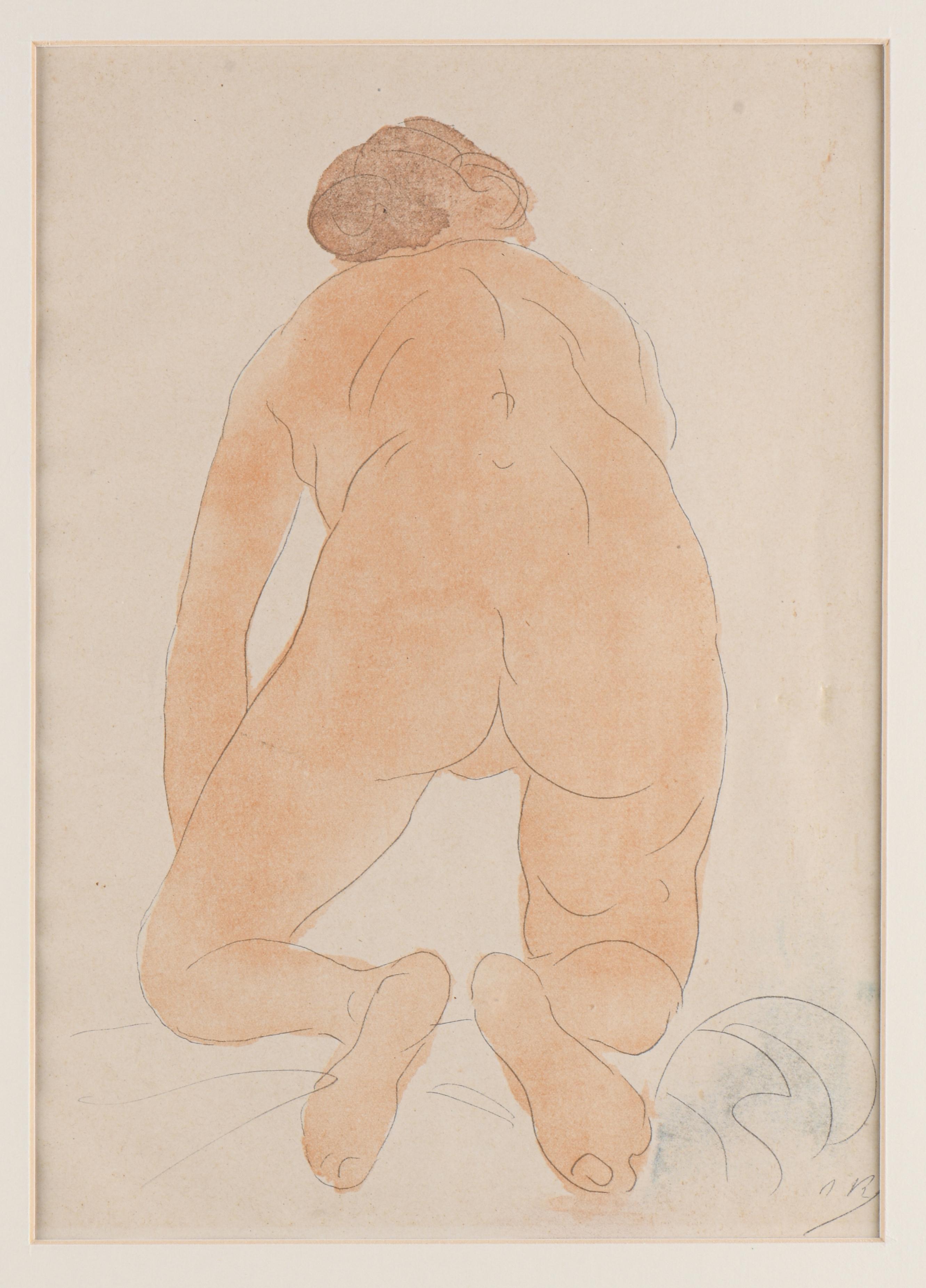 Auguste RODIN (1840-1917), d'après, "Nu accroupi de dos", illustration pour "Le jardin des supplices" de 1902, lithographie rehaussée à l'aquarelle, non num., édition de 200 exemplaires, monogrammé en bas à droite.