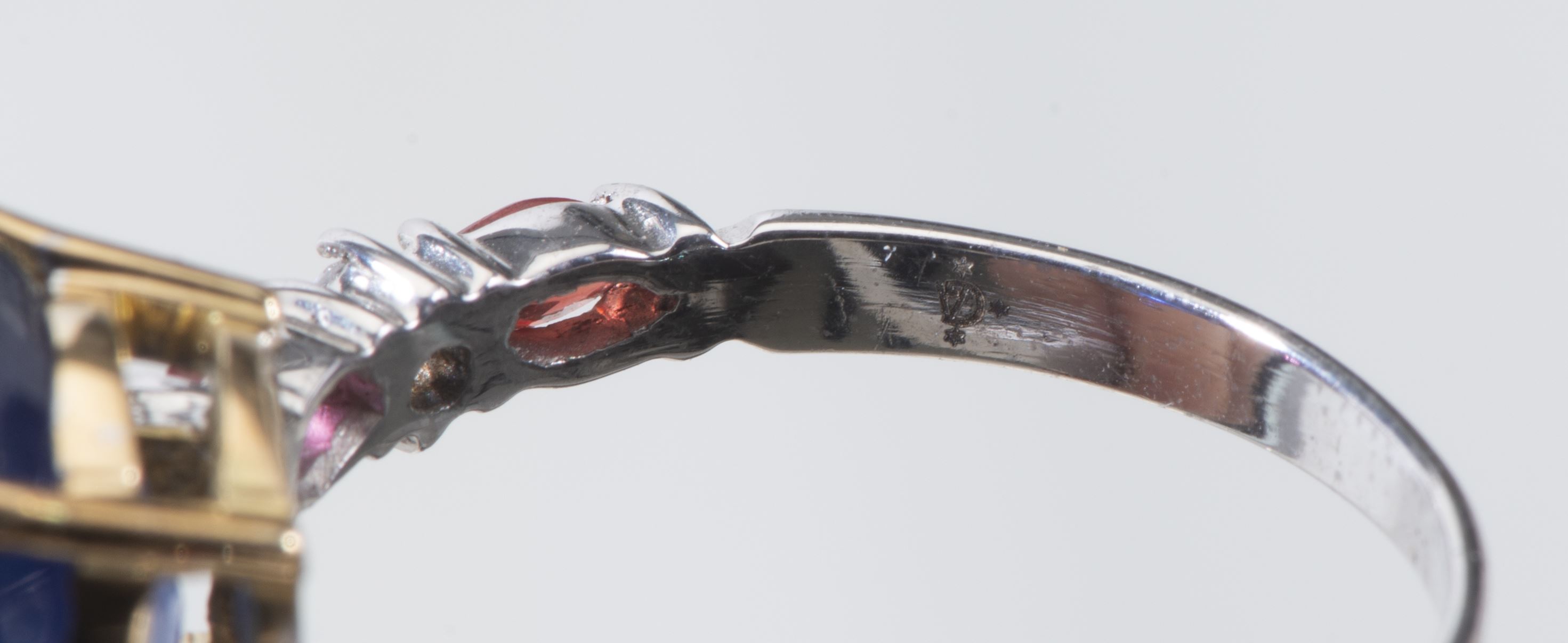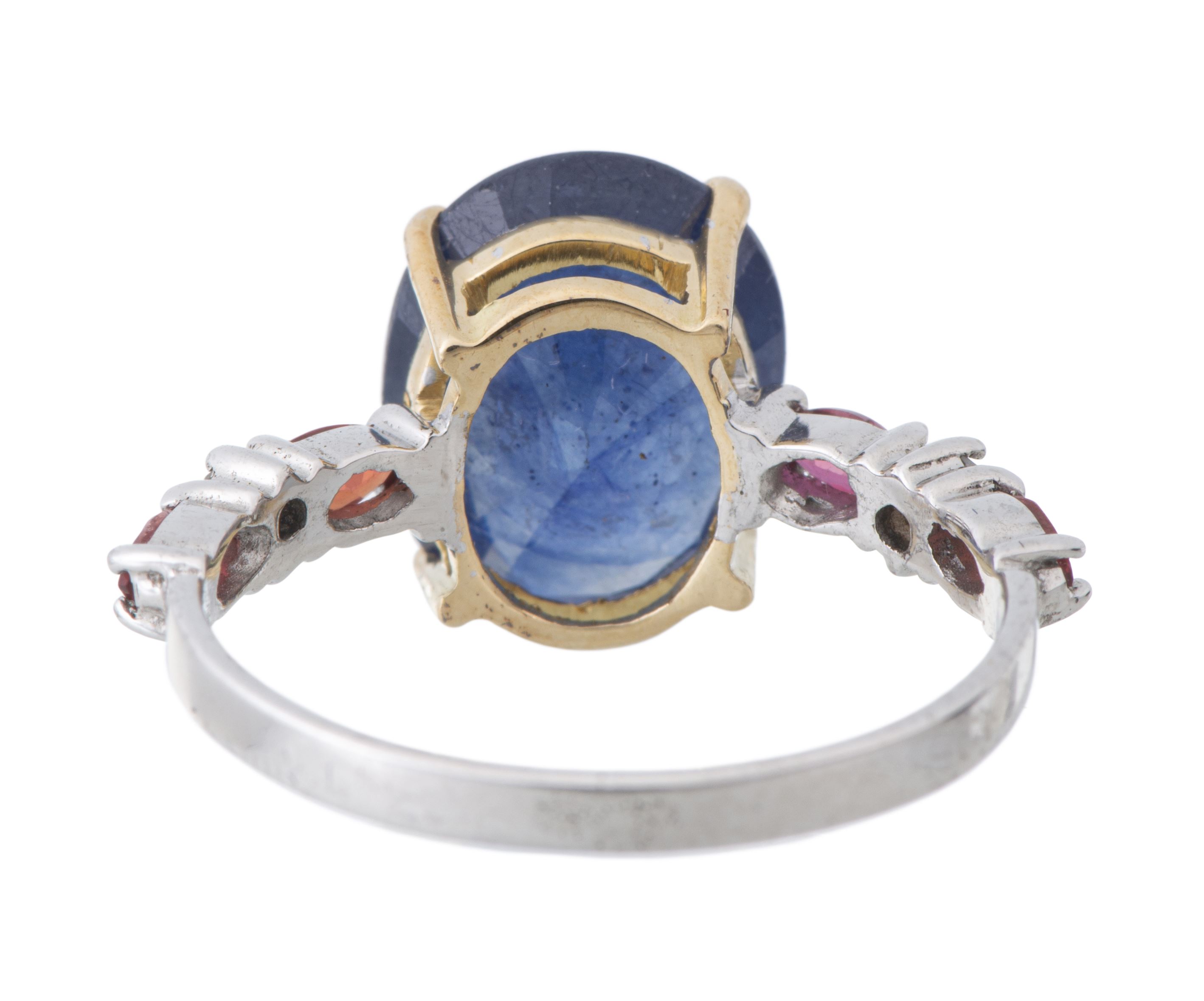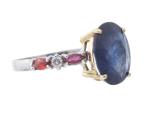 *Bague en argent .925 et or .750 avec un saphir central de 3.89 cts accompagné sur la monture de 0.05 ct de diamants de taille brillant et de 0.32 ct de rubis.