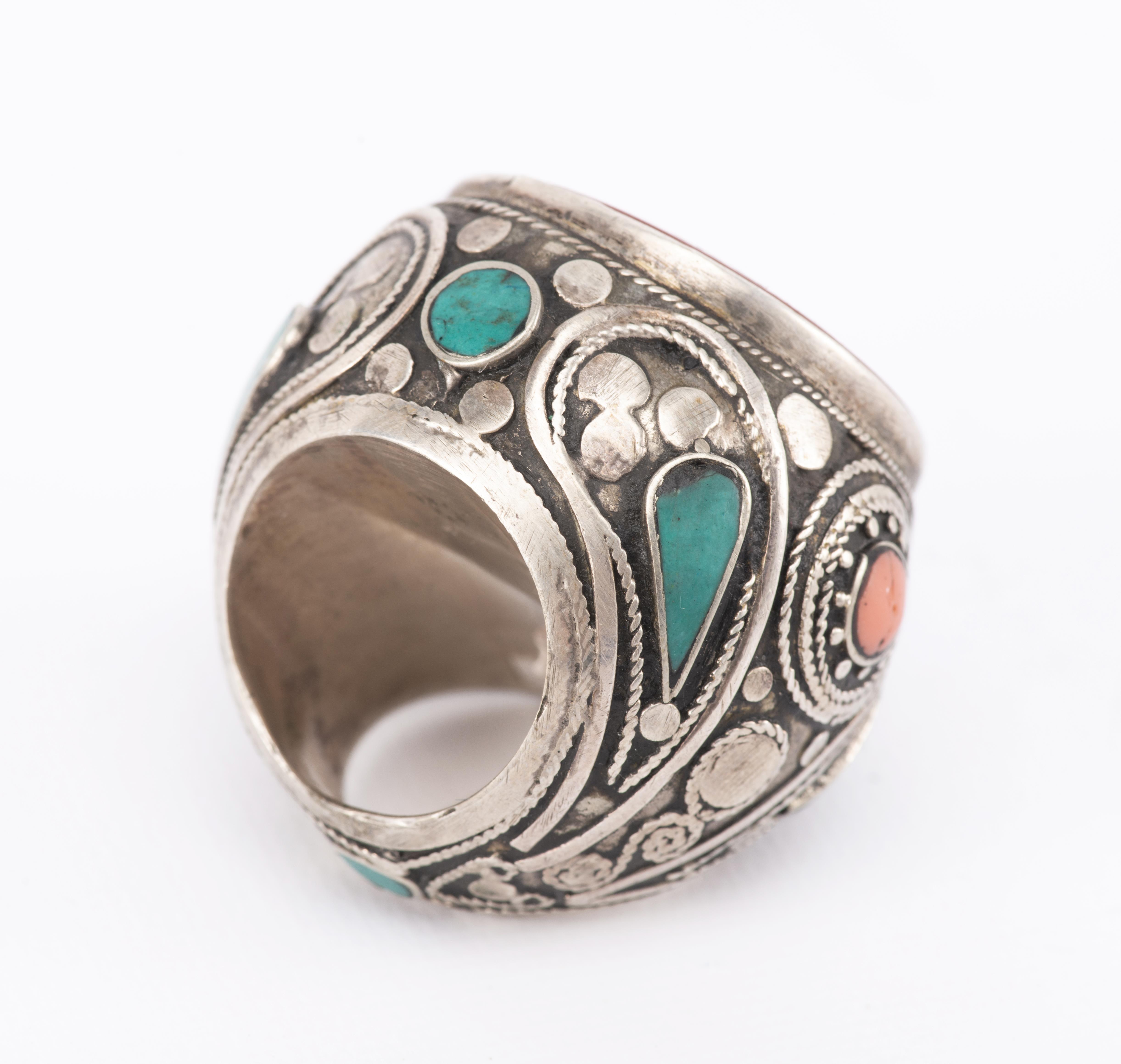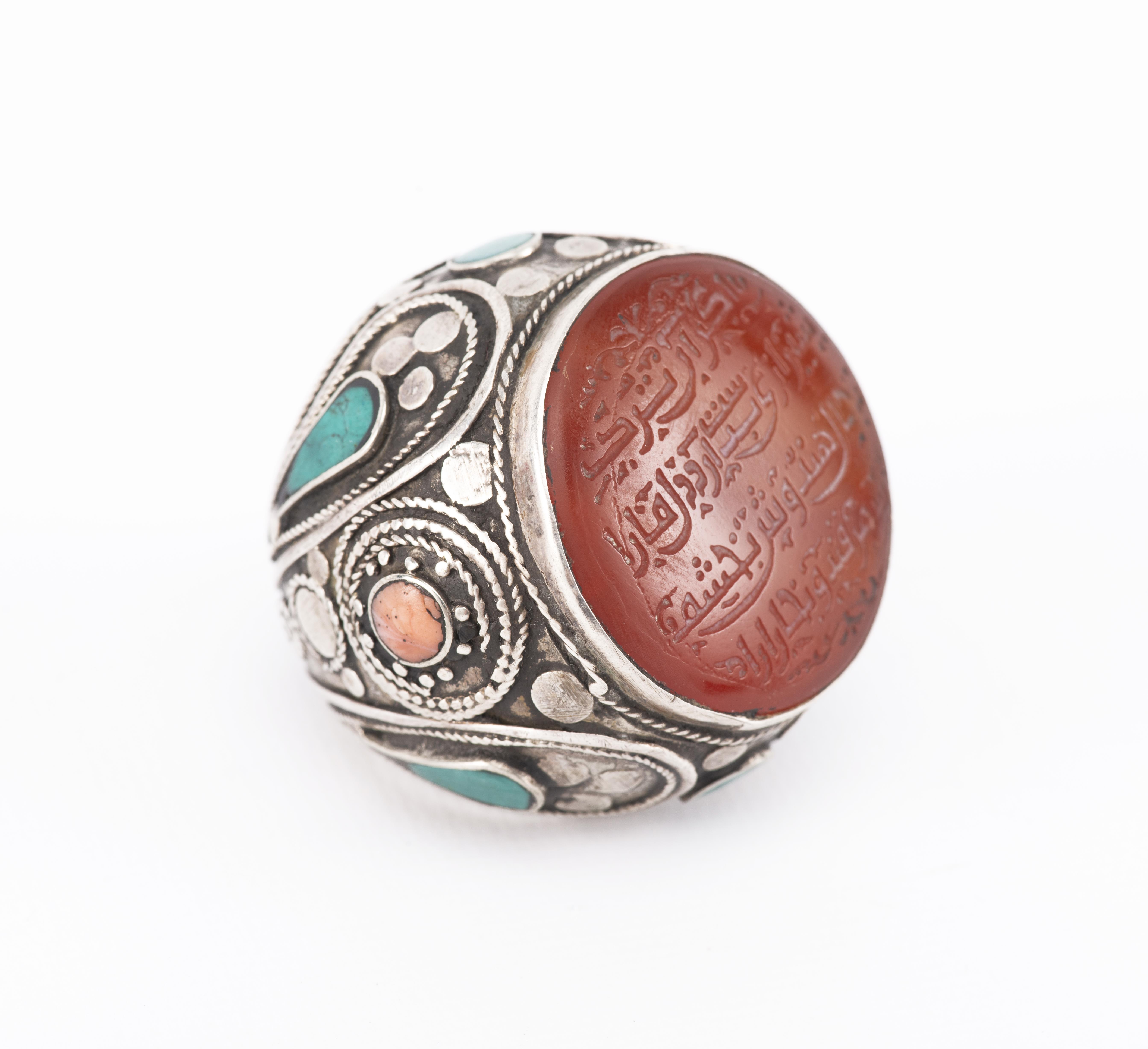 Bague de Perse en argent avec du corail, de la malachite et une table en agate orange calligraphiée.