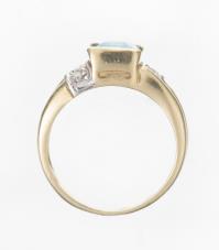 bague en or jaune .750 avec 4 petits diamants pour un total de 0.04 ct et une topaze bleue taille émeraude sertie clos de env. 1 ct.