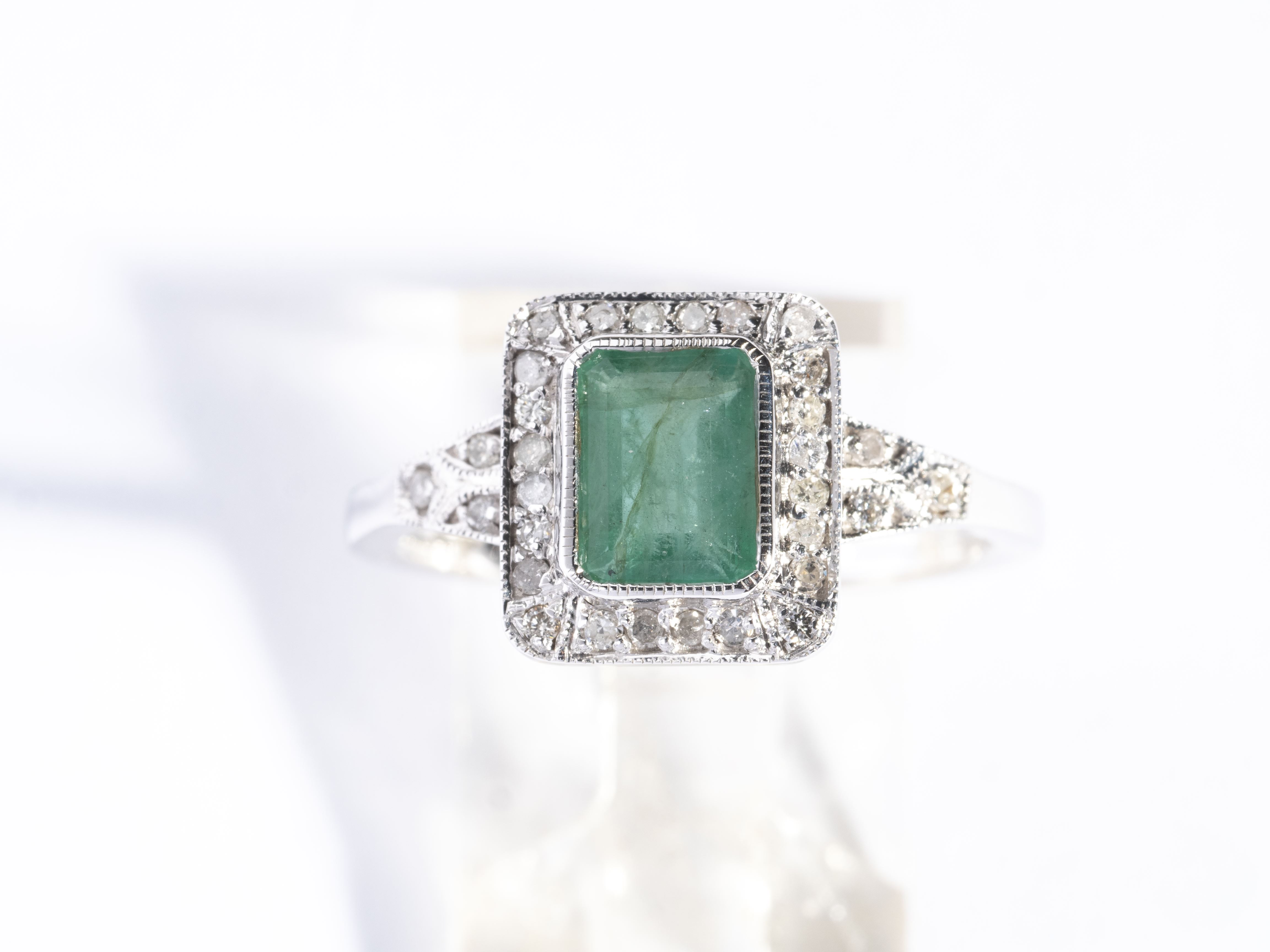 Bague en or gris .375 avec une émeraude de taille émeraude de 0.90 ct avec un rang de diamants pour 0.10 ct.