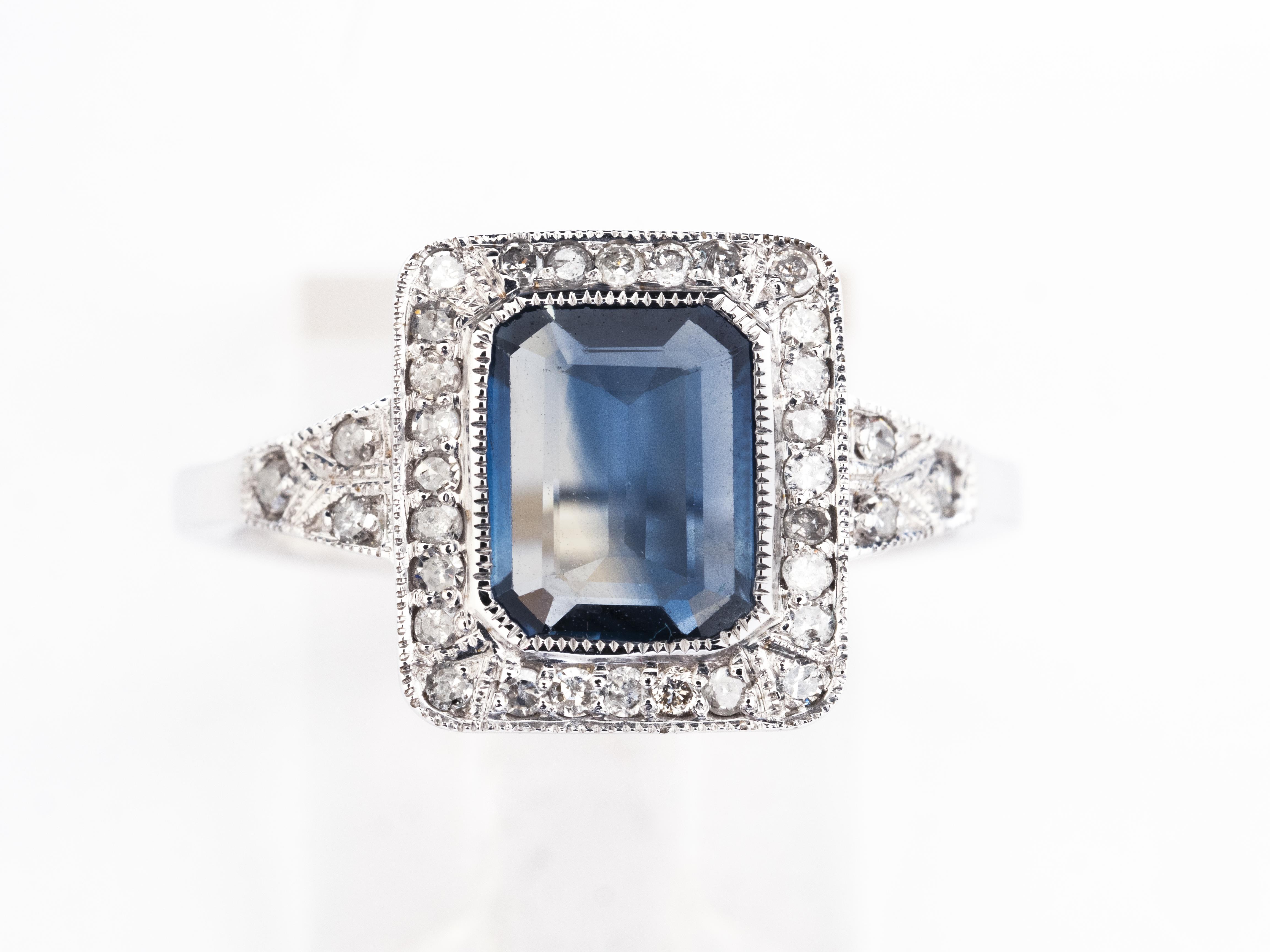 Bague en or gris .375 avec un saphir de taille émeraude de 1.16 ct avec un entourage de diamants pour 0.20 ct.