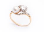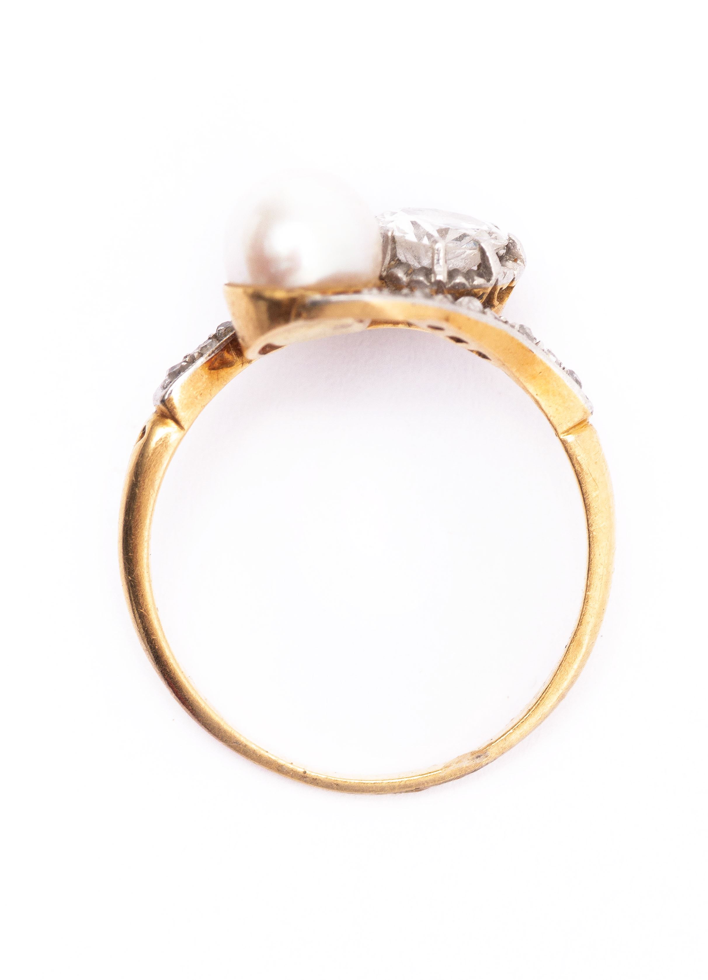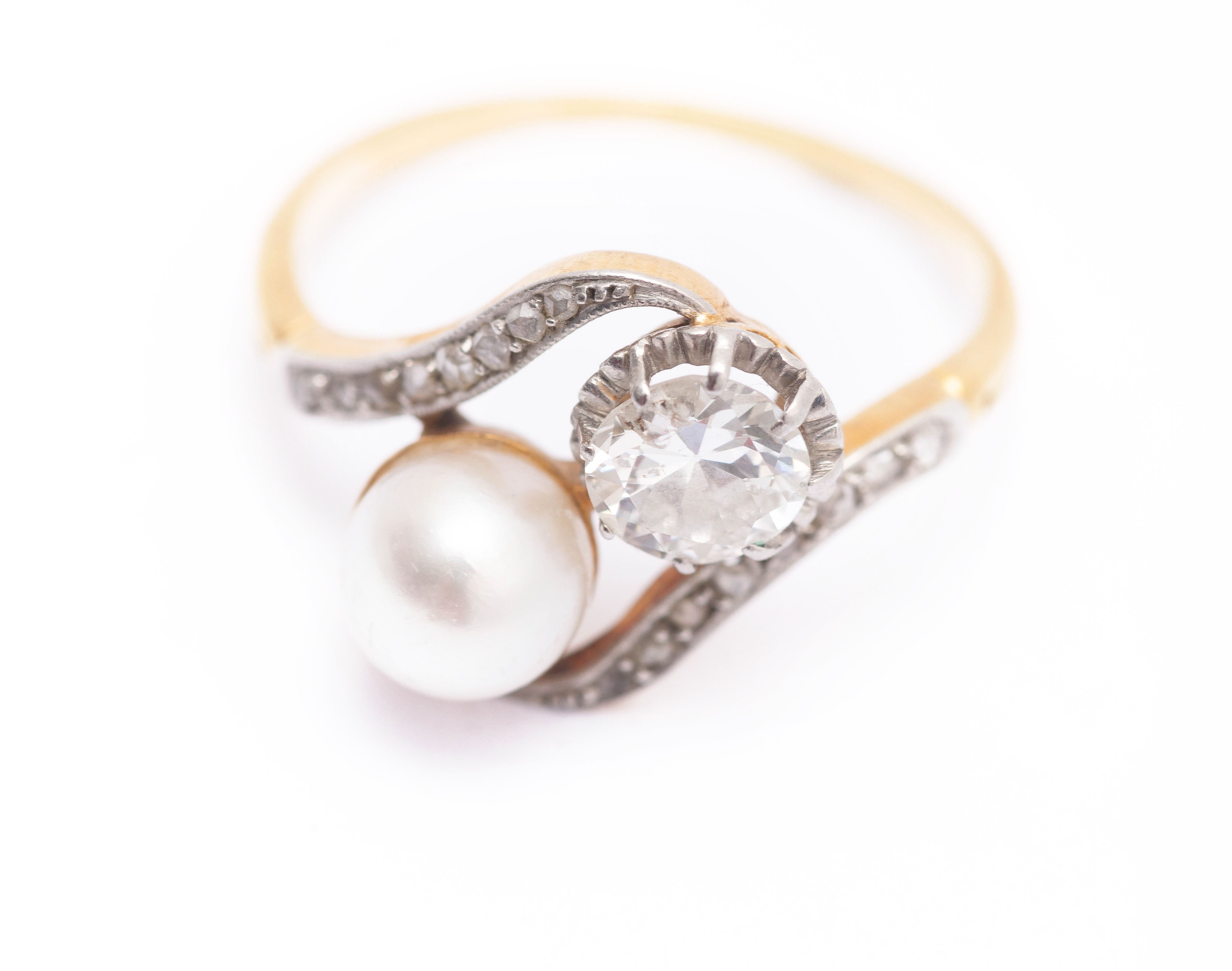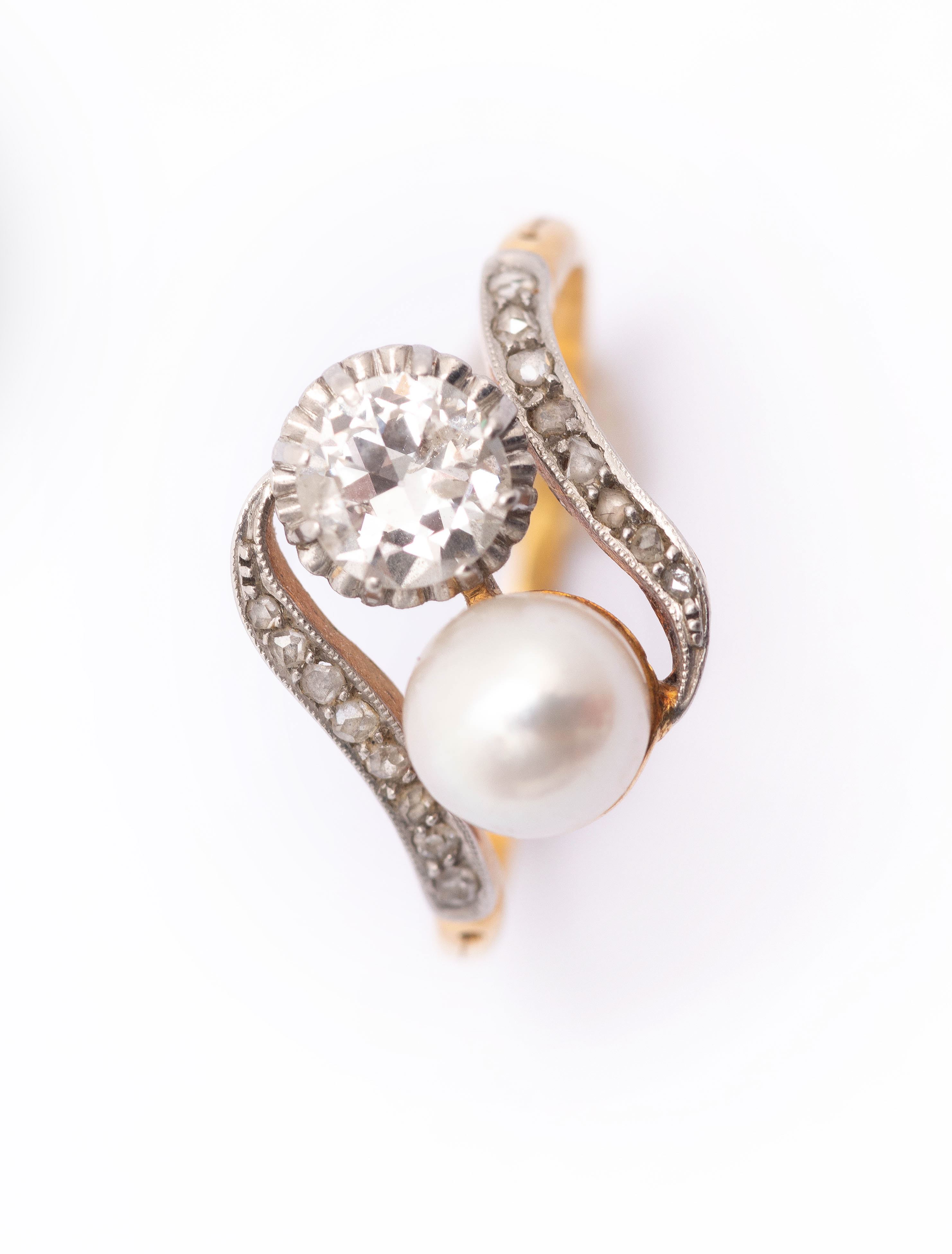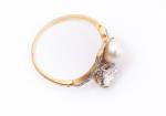 Bague en or jaune .750 avec une perle, un diamant taille ancienne et 16 diamants taille rose