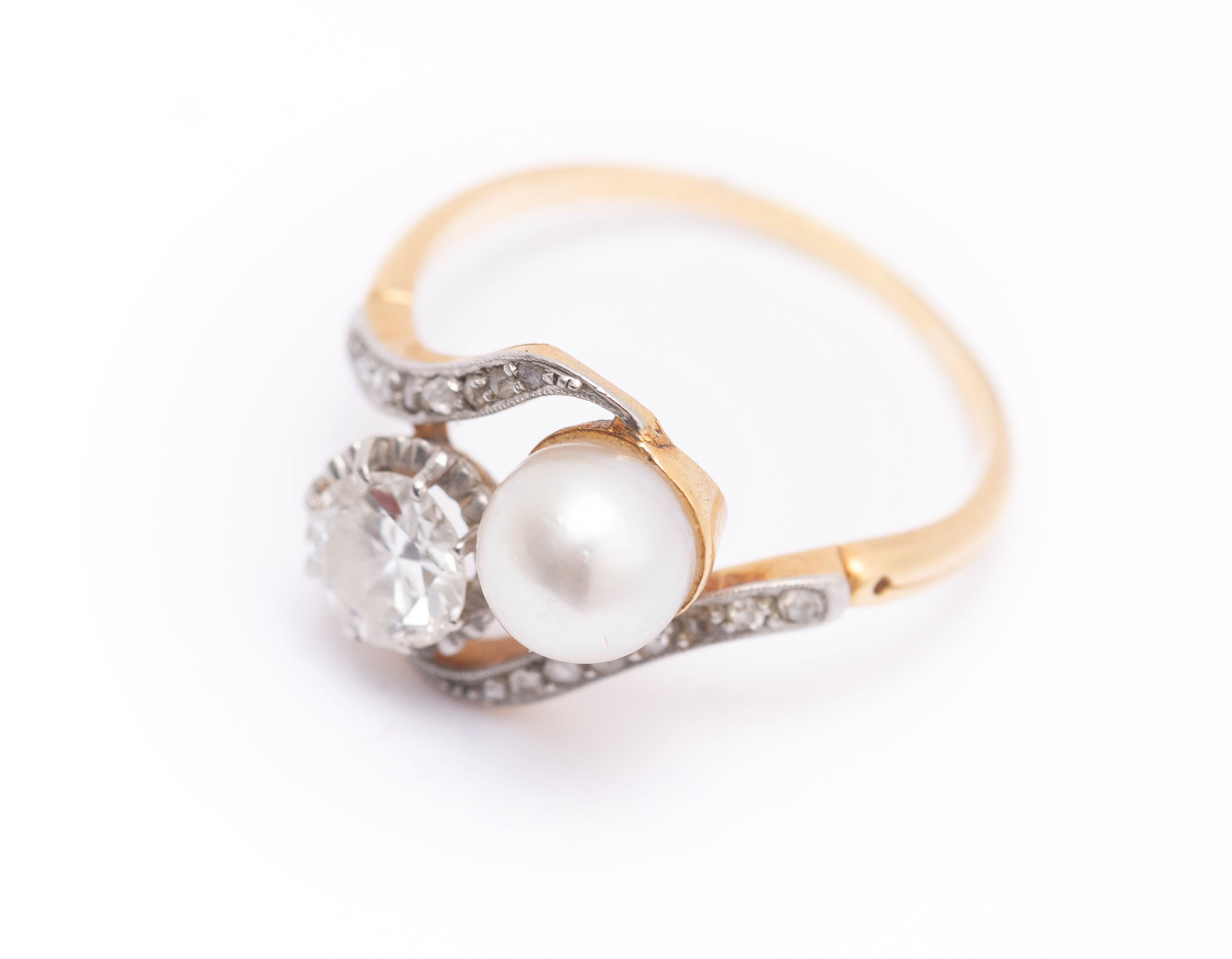 Bague en or jaune .750 avec une perle et un diamant de 0.5 ct de taille ancienne avec 2 fissures et 16 diamants de taille rose