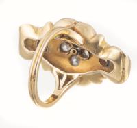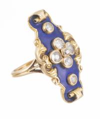 Bague en or jaune .750 de forme marquise baroque avec 7 diamants de taille ancienne pour un total de 0.7 ct à serti clos sur un fond émaillé bleu.