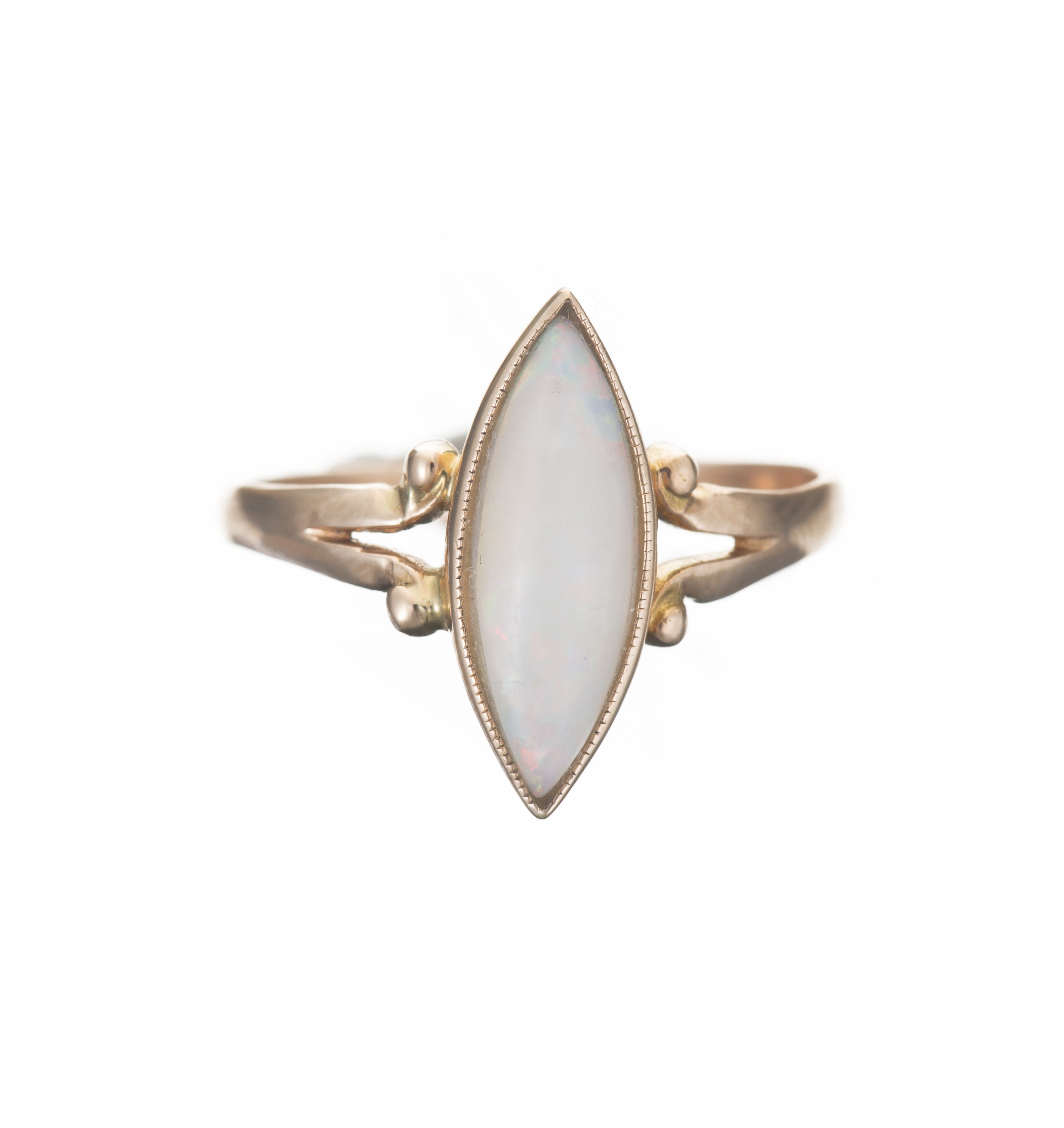 bague en or rose .750 avec une opale blanche australienne de forme marquise dans une monture Art-Nouveau