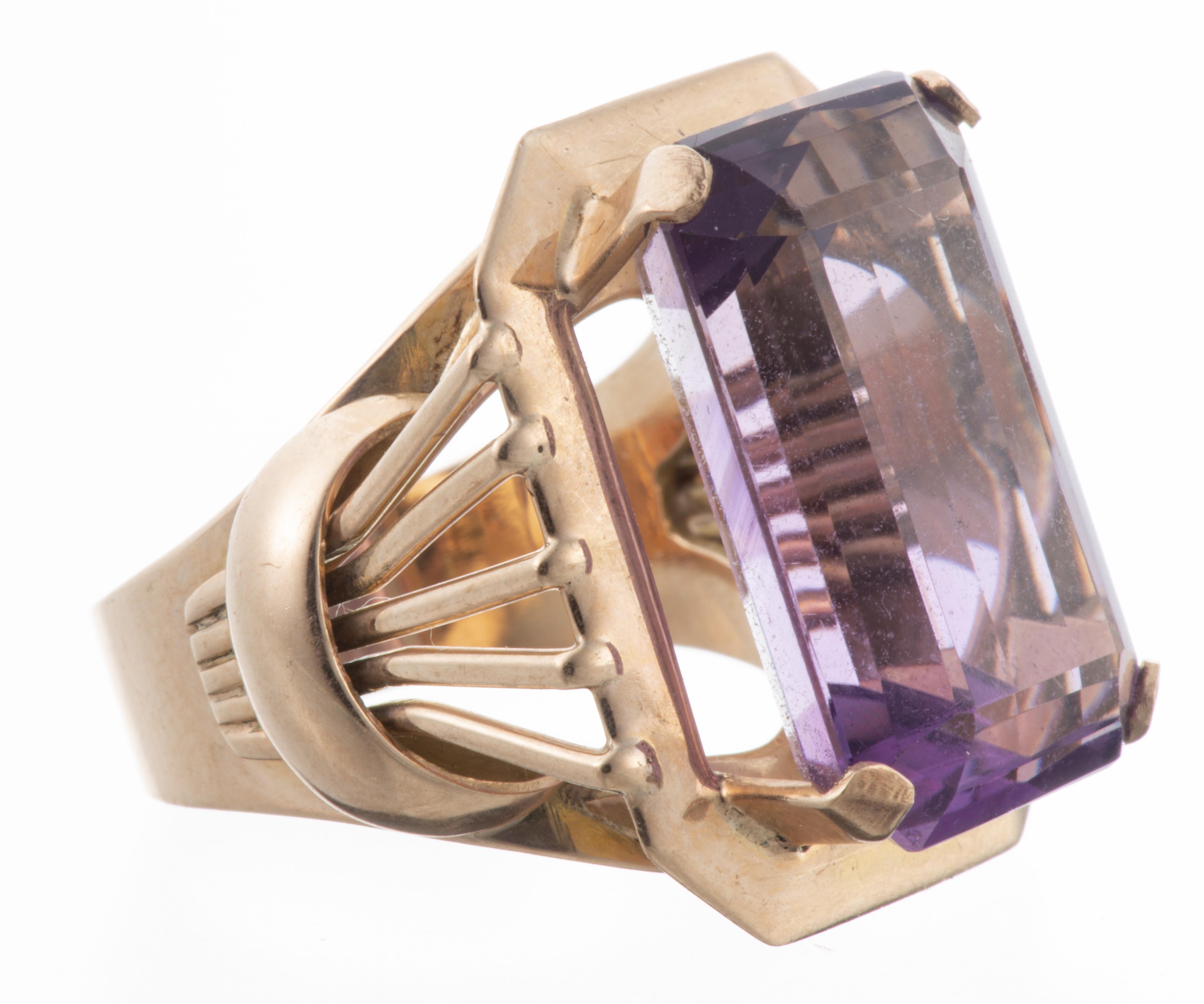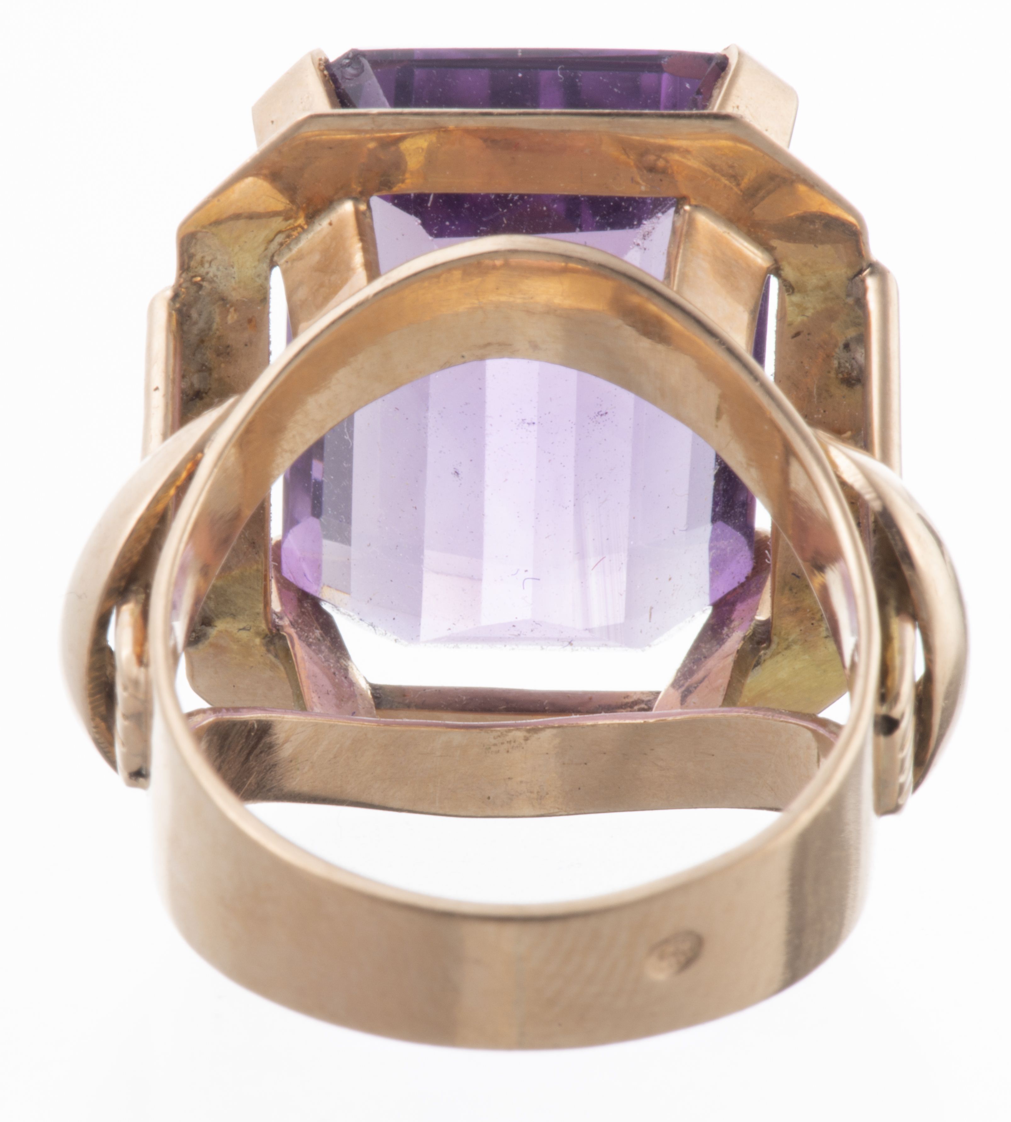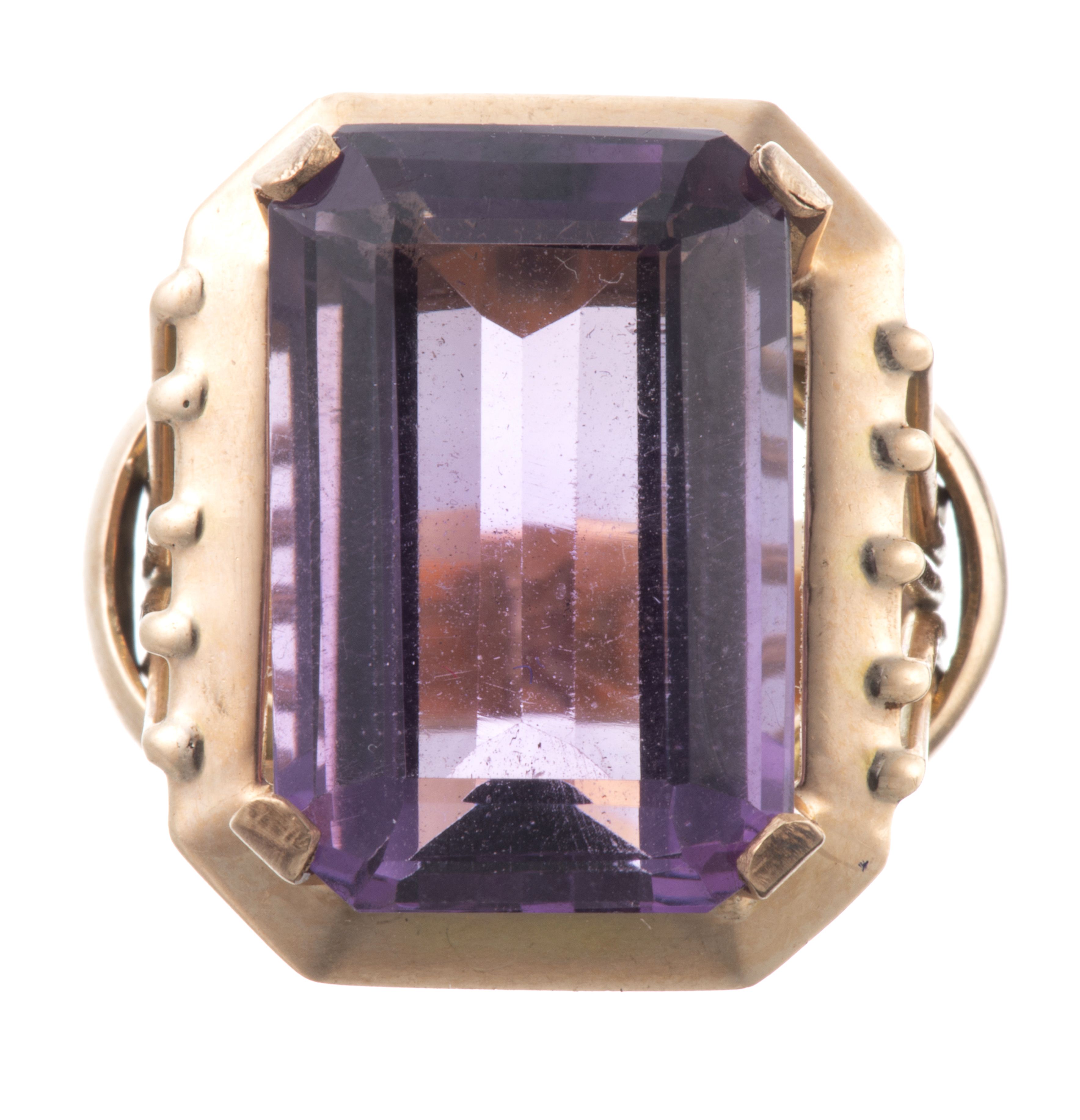 Bague en or rose .585 avec au centre une améthyste de taille émeraude de env. 12 cts.