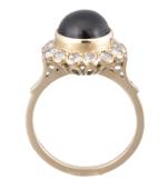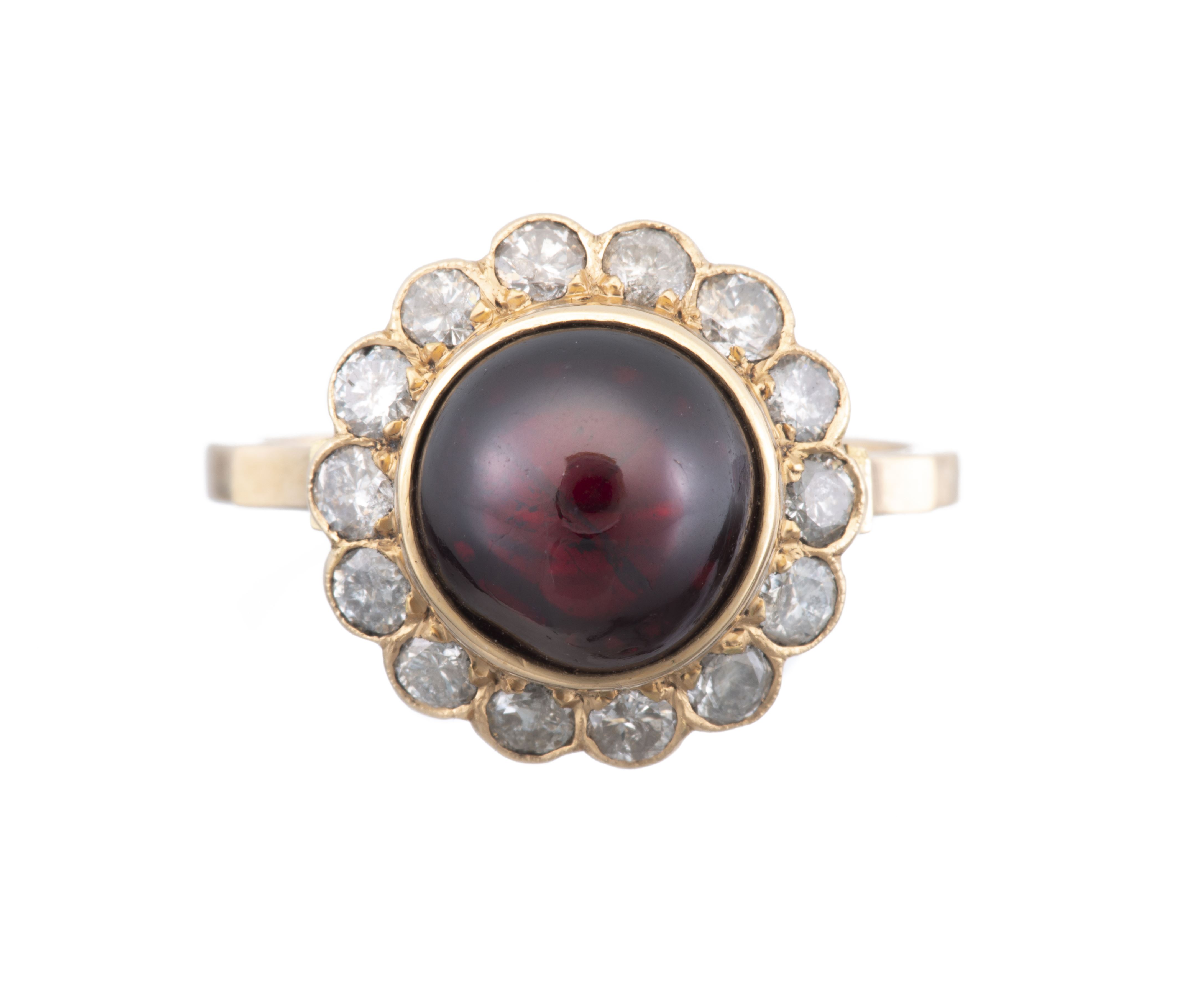 Bague en or rose .585 avec un grenat cabochon rond de env. 3.80 cts et un entourage de 14 diamants pour un total de 0.60 ct.