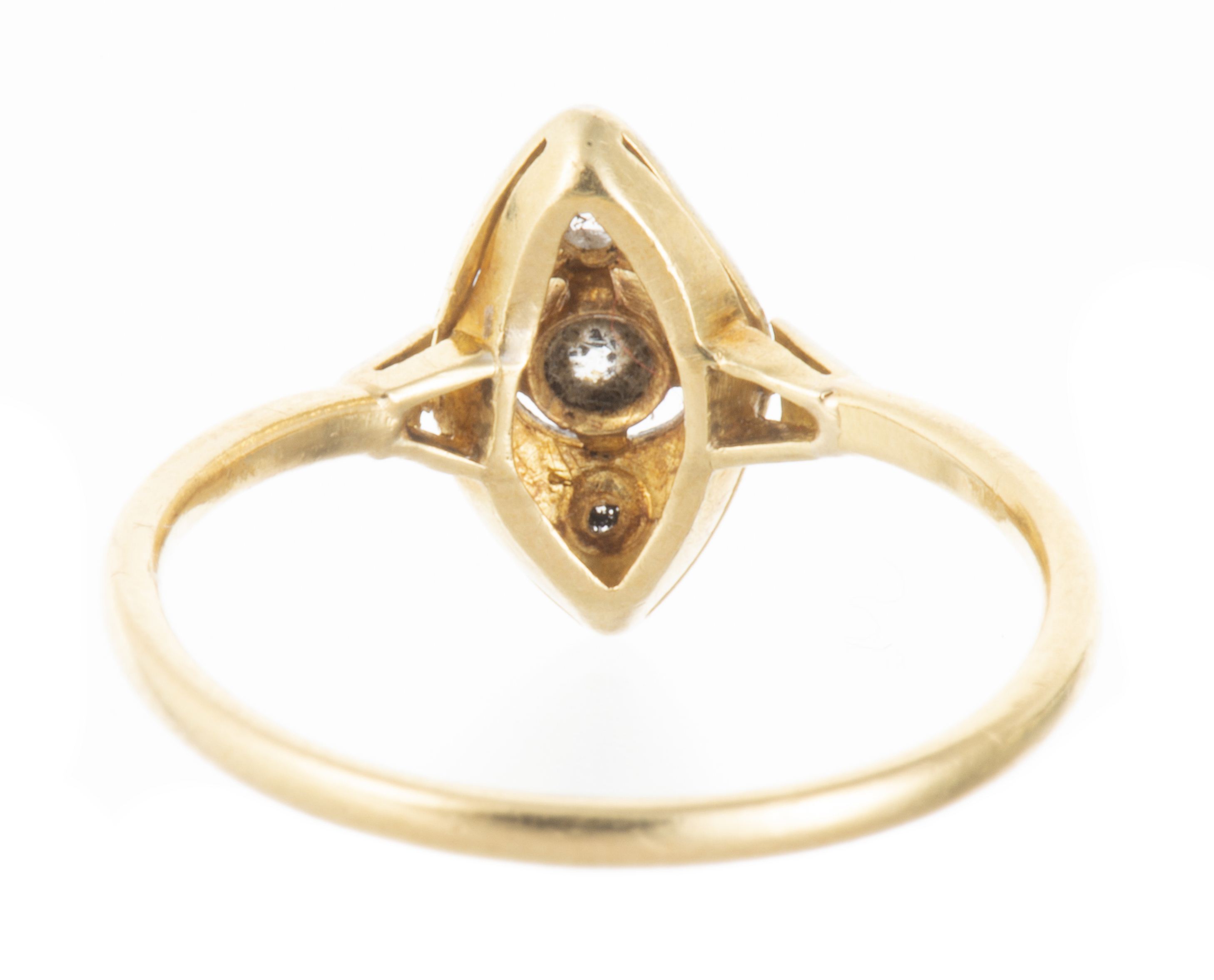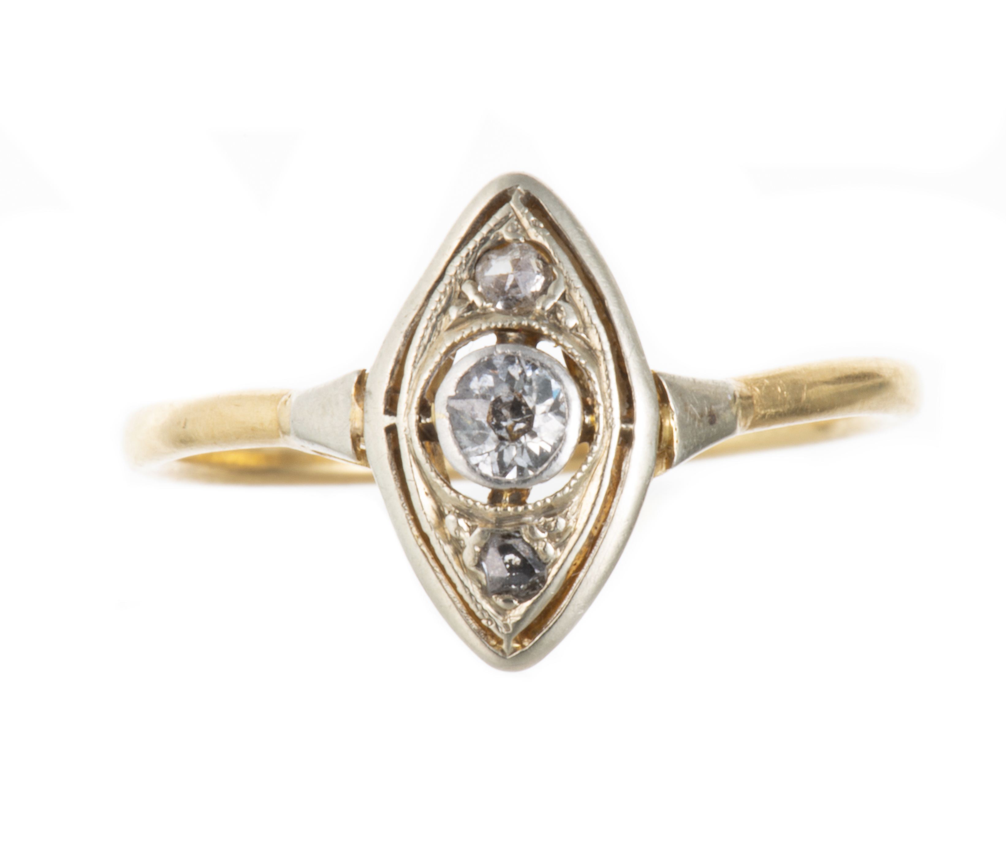 Bague marquise victorienne, en or gris et or jaune .750, sertie de 3 diamants de taille ancienne rondiste.