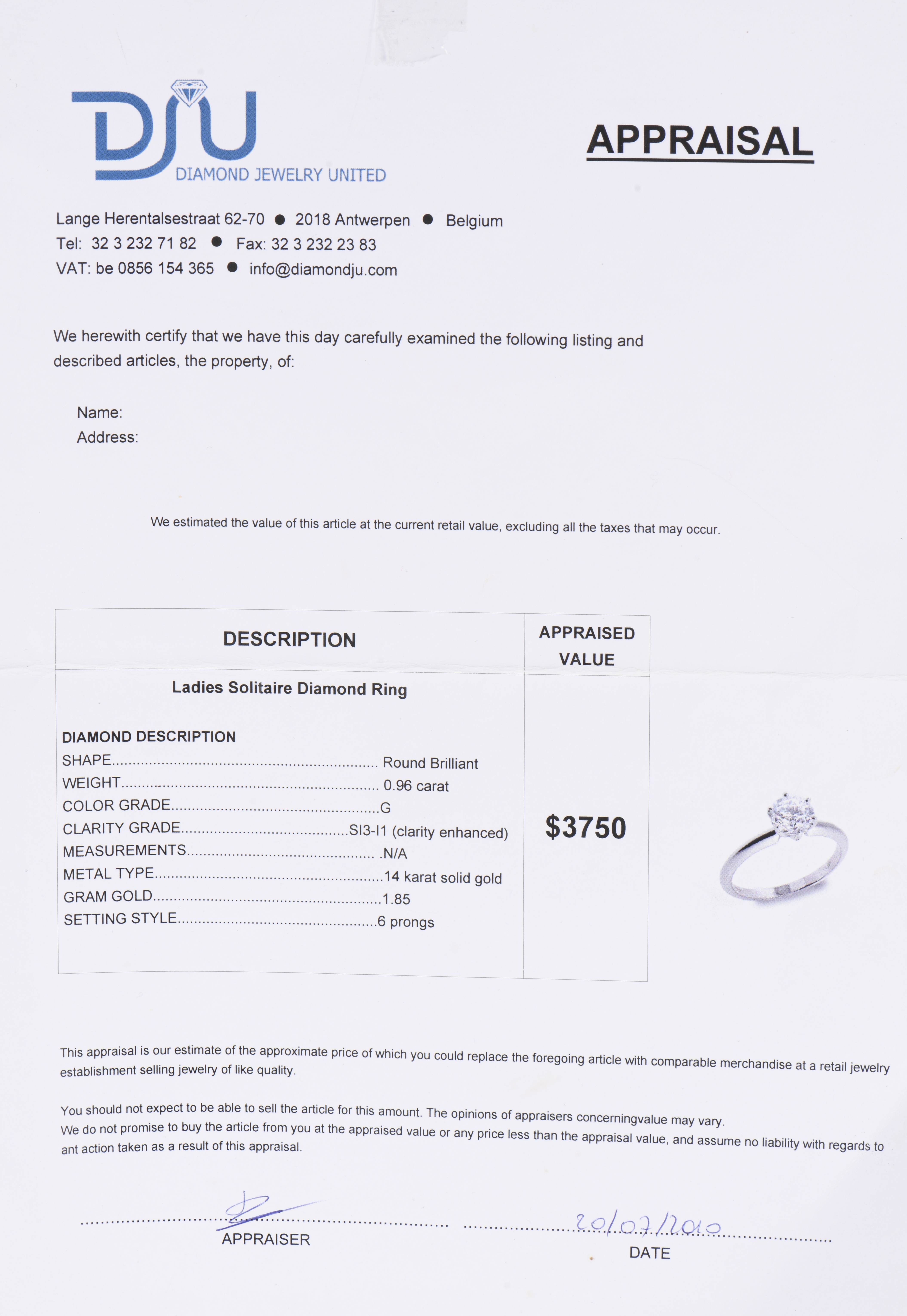 Bague solitaire en or gris 14 cts avec un diamant de 0.96 carat, SI3 - l1.
