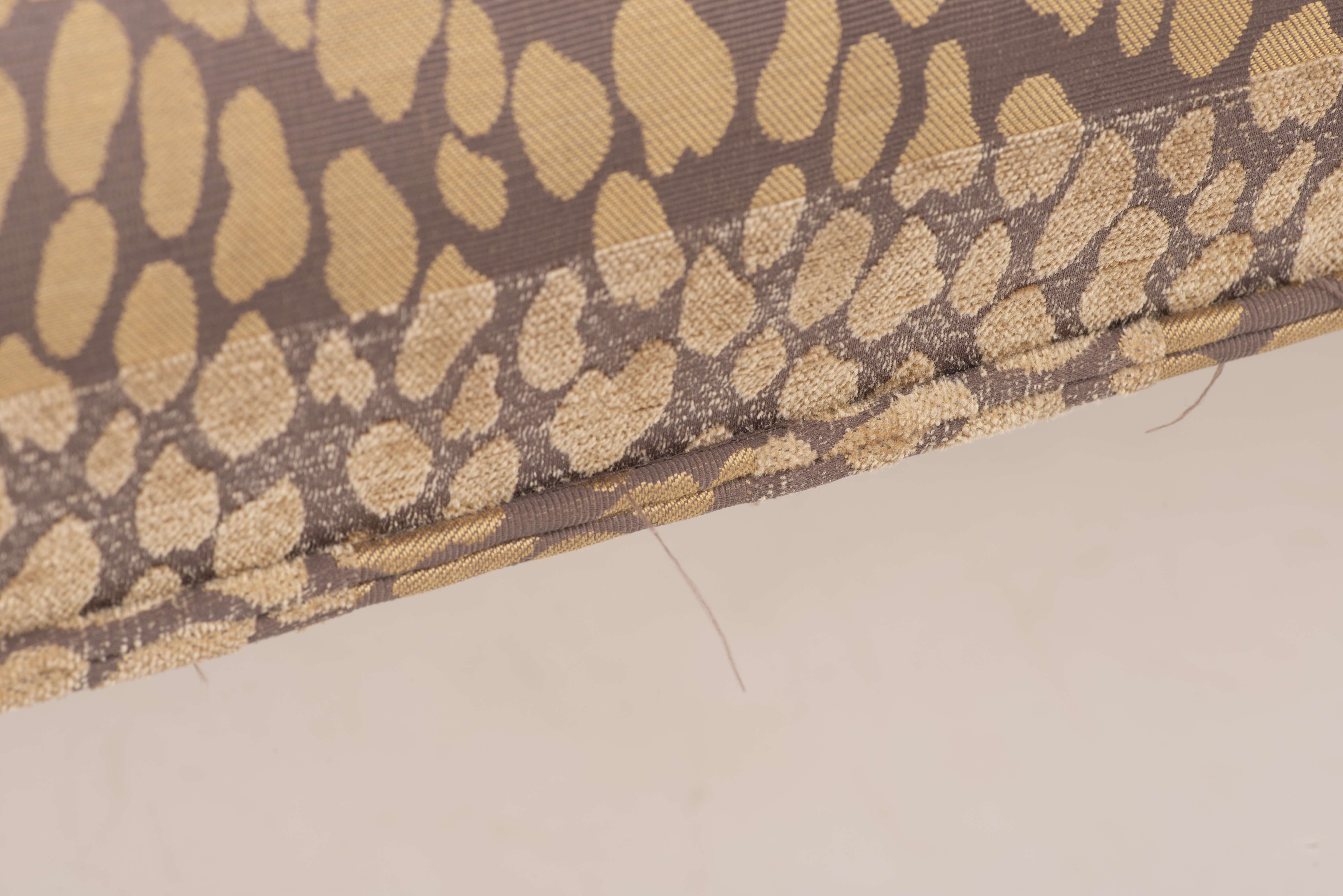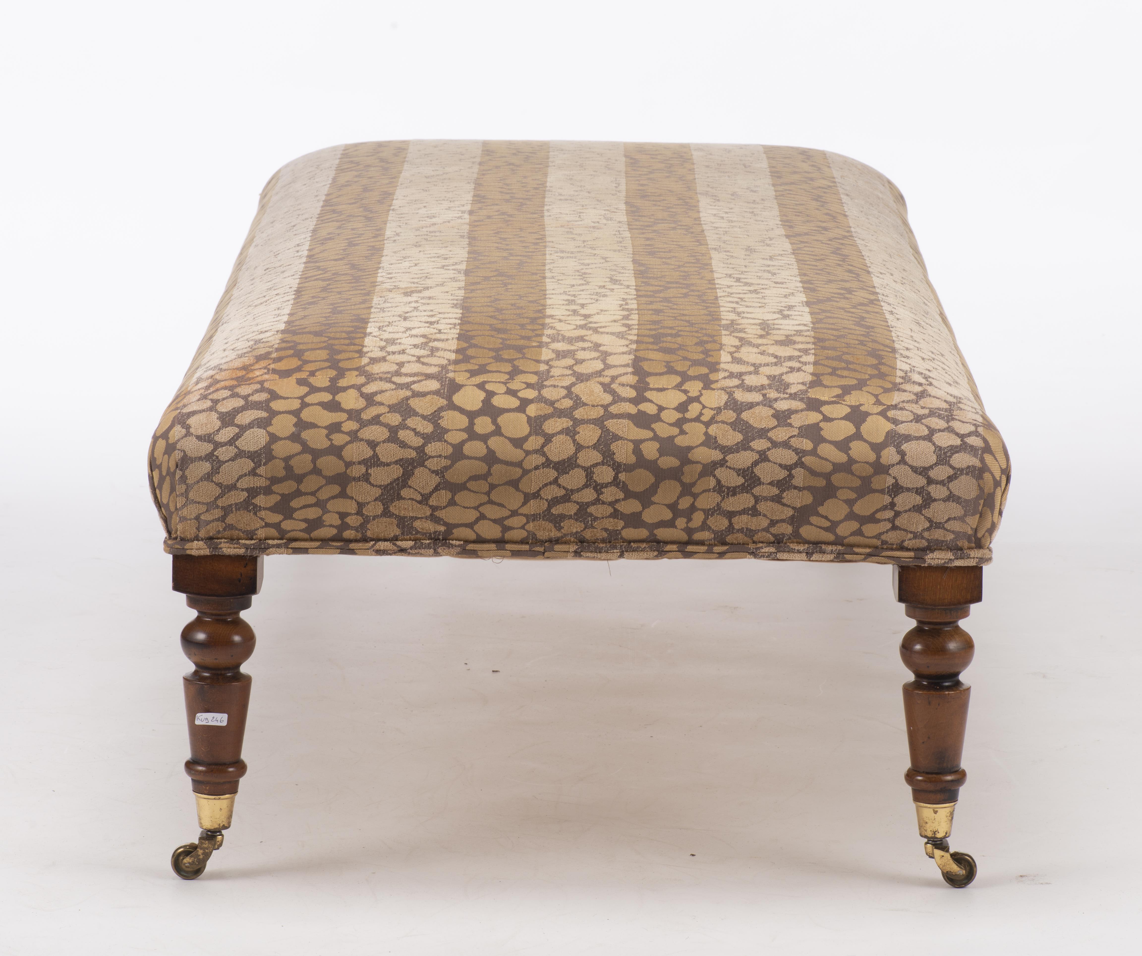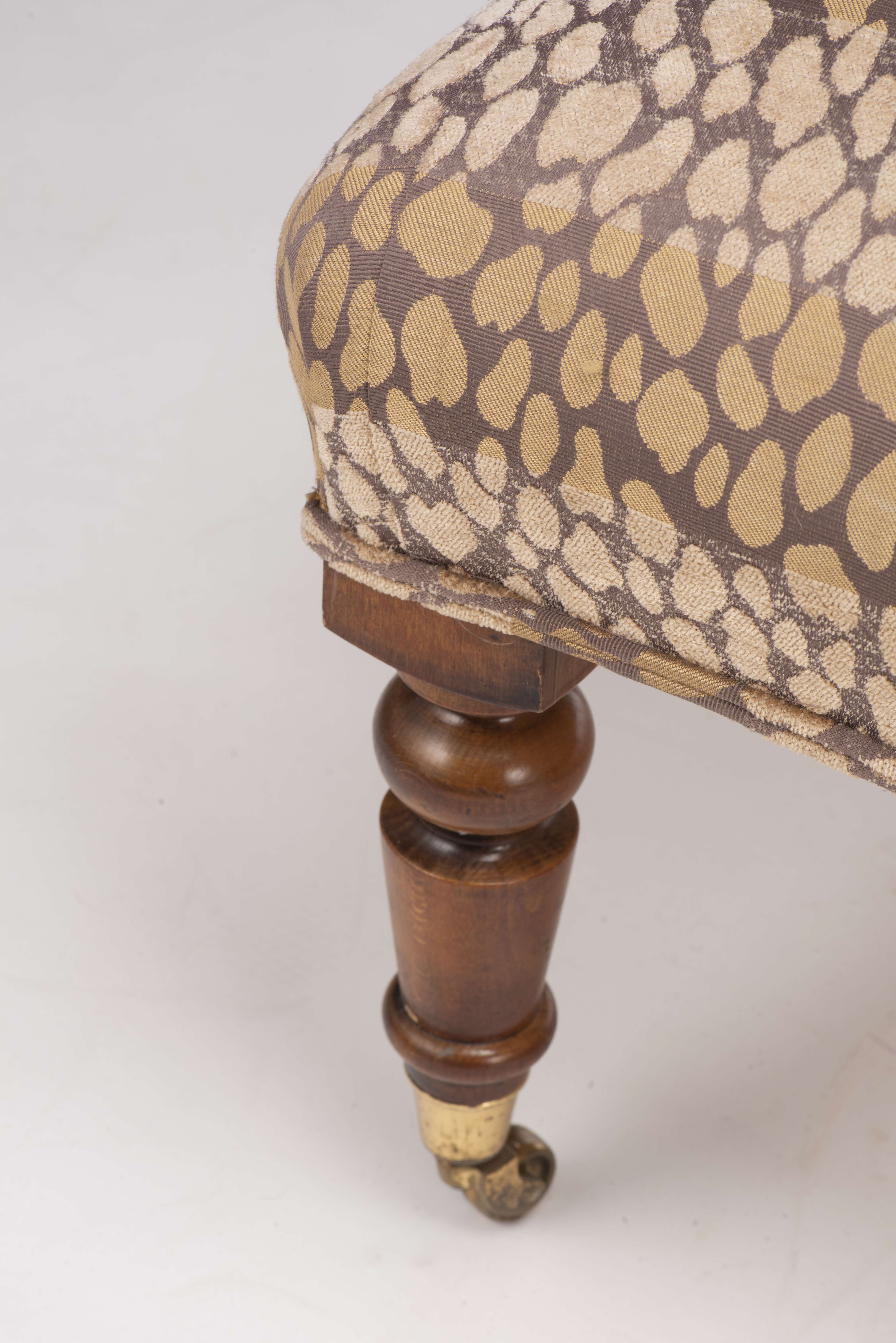 Banquette d'époque victorienne en acajou à pieds en bois tourné terminés par des roulettes en laiton, assise recouverte d'une cotonnade féline.