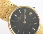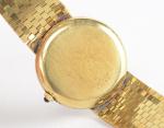 Montre-bracelet en or jaune Baume et Mercier Genève, Baumatic avec cadran noir et guichet de date à 3h, numéro 443016/35505, verre saphir, index et aiguilles «bâton». Bracelet intégré «écorce» en or .750 (usures).